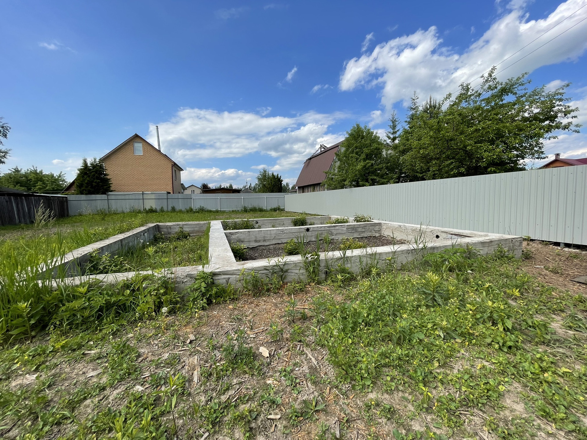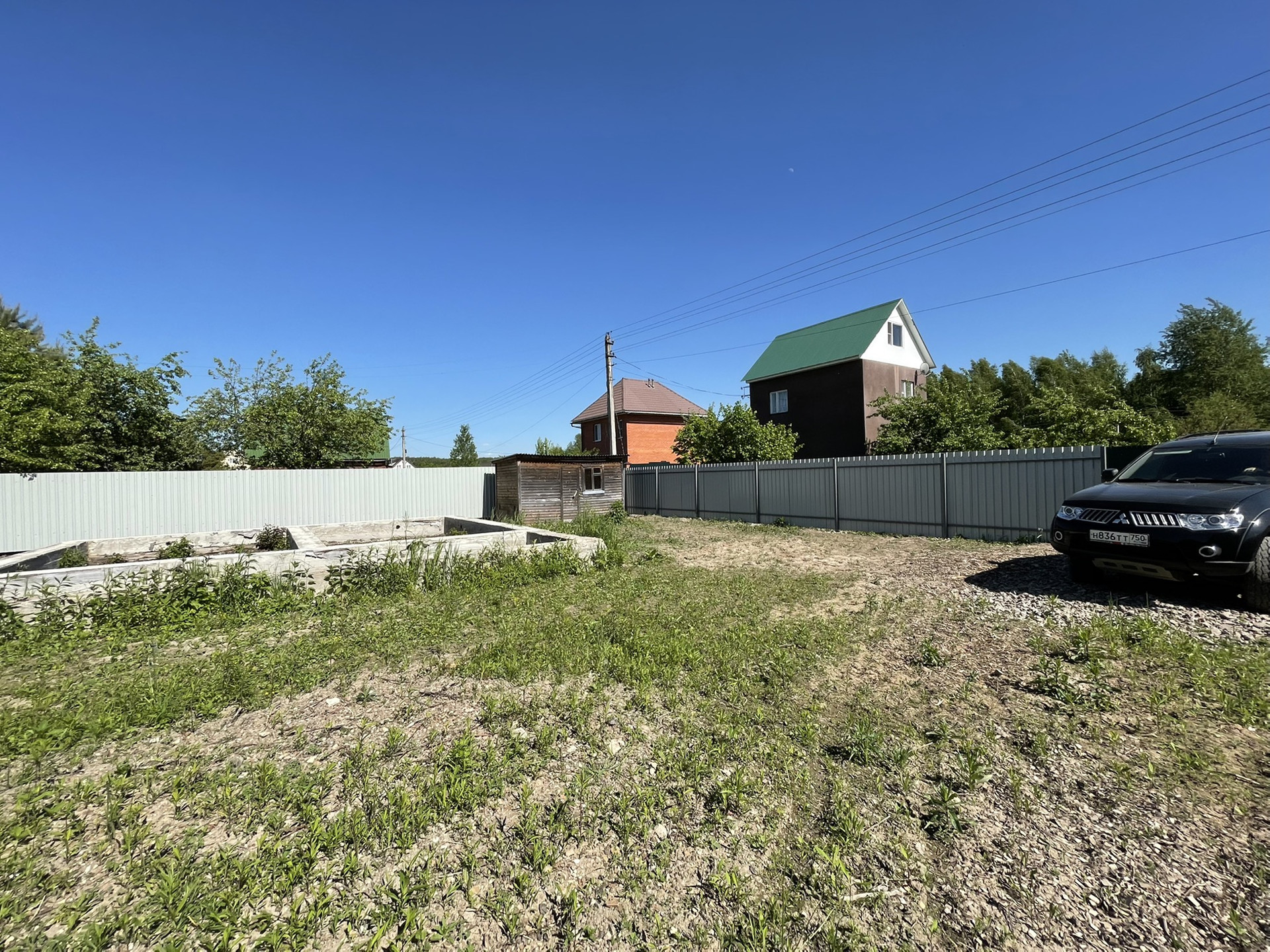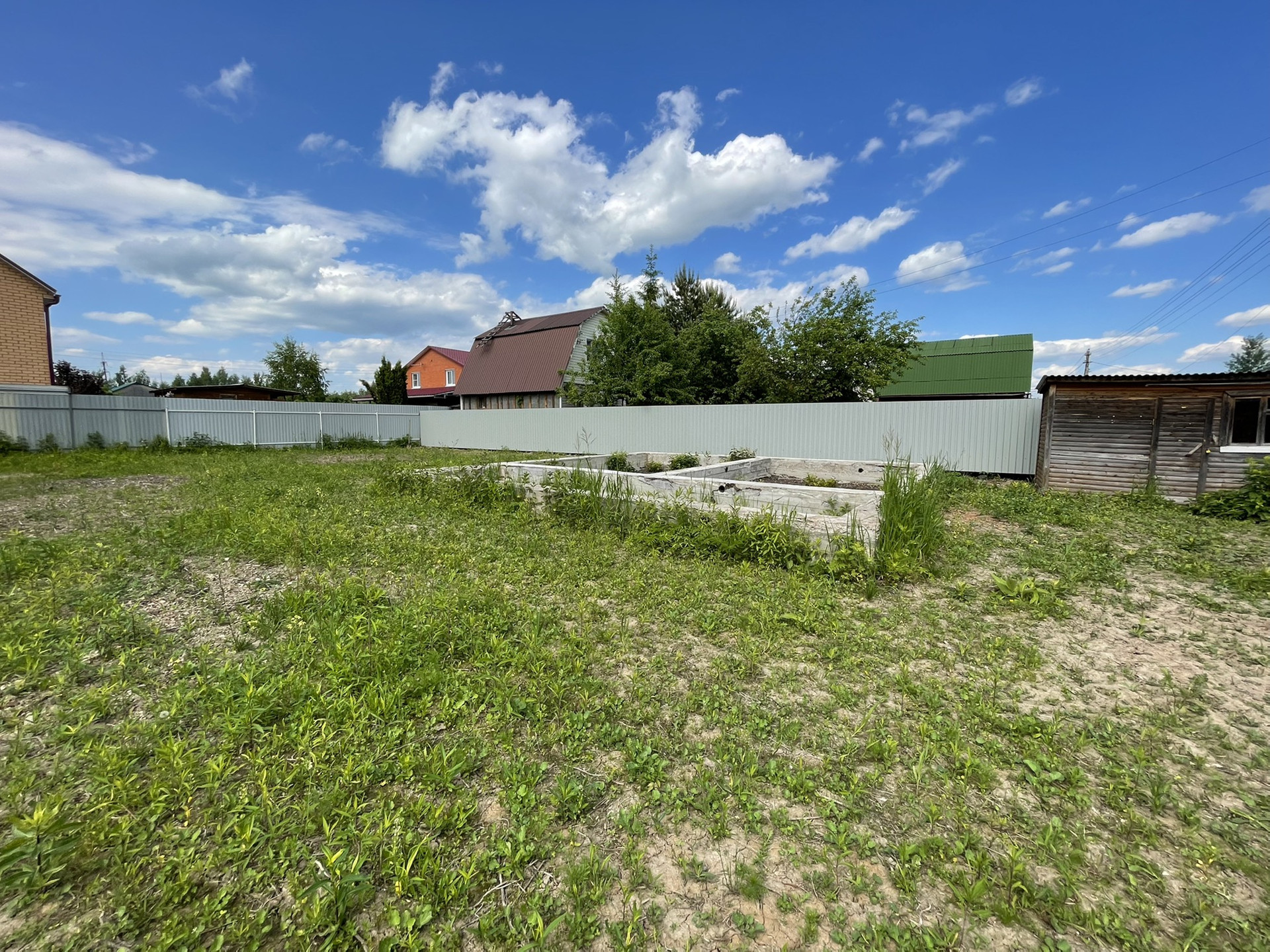 На участке под жилой дом залит фундамент 8,5м х 9м, заглублен на 1,5м в землю. В доме можно оформить регистрацию (прописку).