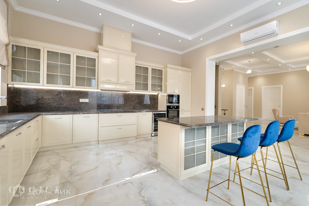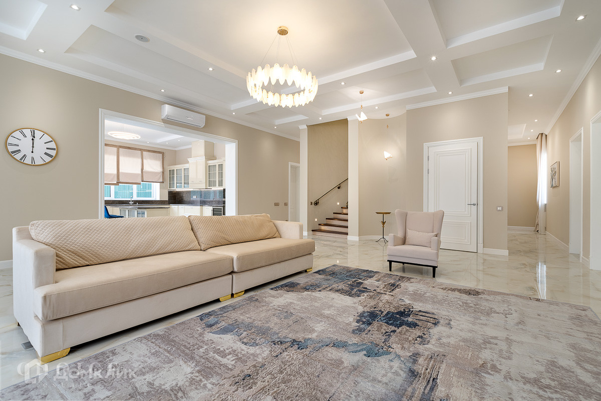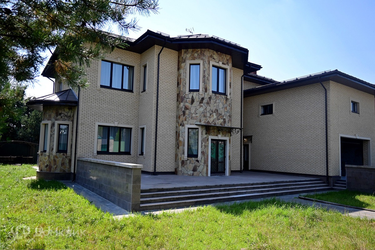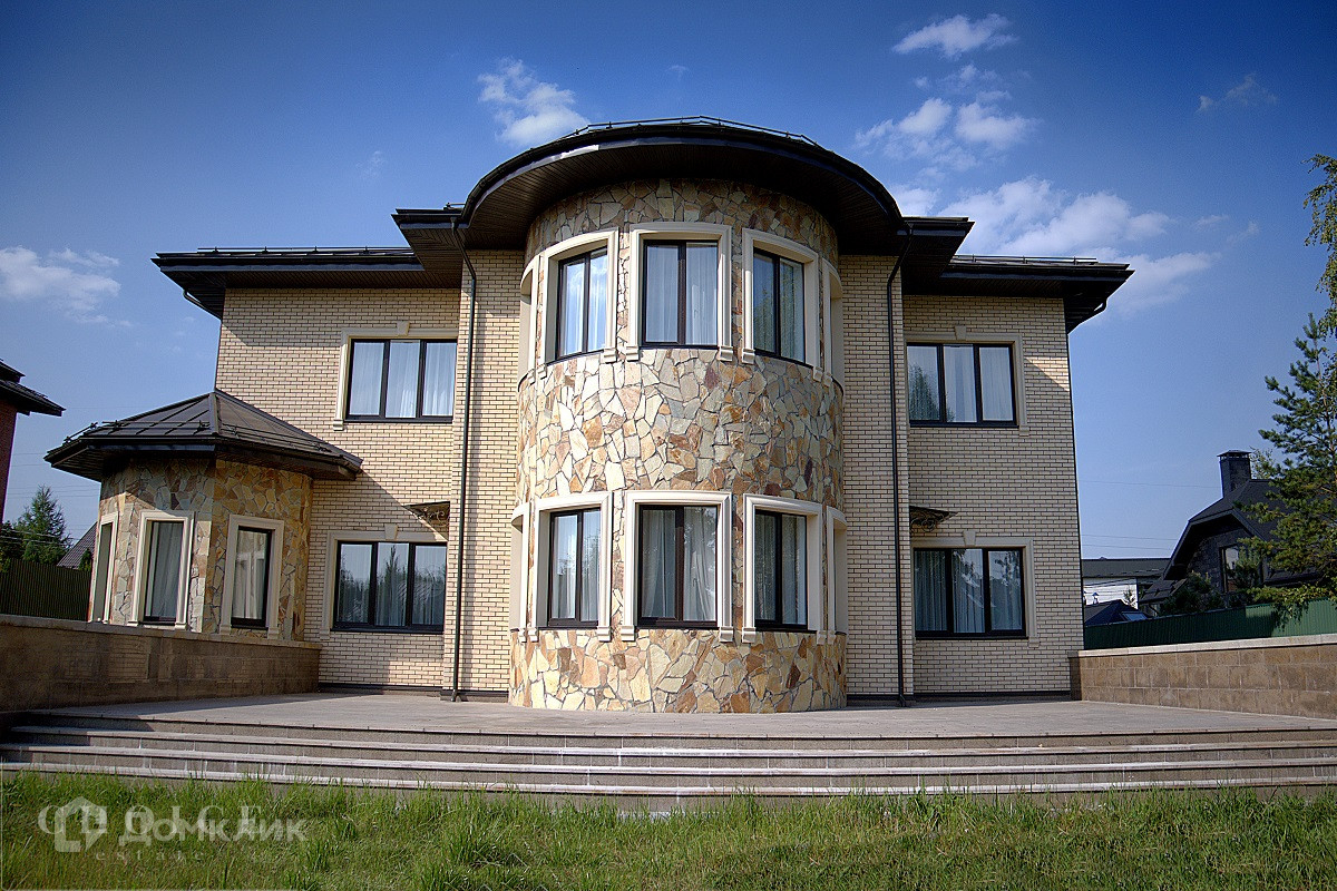 На продажу предлагается загородный дом площадью 540 кв.м . Фасад облицован бежевым клинкерным кирпичом и камнем, входная группа, цоколь и терраса выполнены из гранита. Интерьер оформлен в светлых кремовых оттенках. На территории поселка отдельно стоящий гараж на 2 м/м с квартирой для персонала.