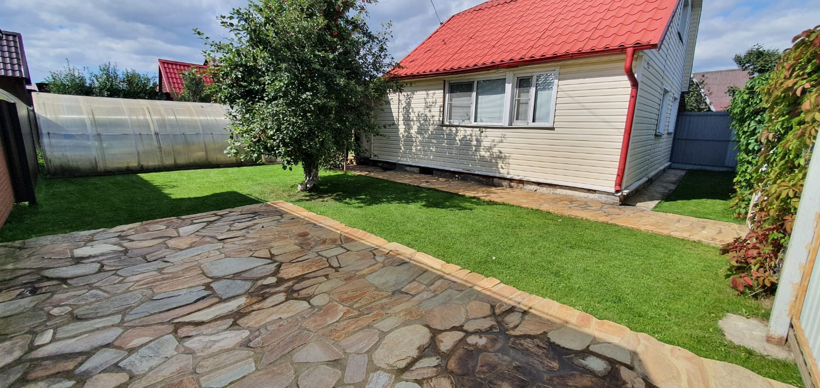 дорожки и парковка на участке вымощены натуральным камнем - "златолит",