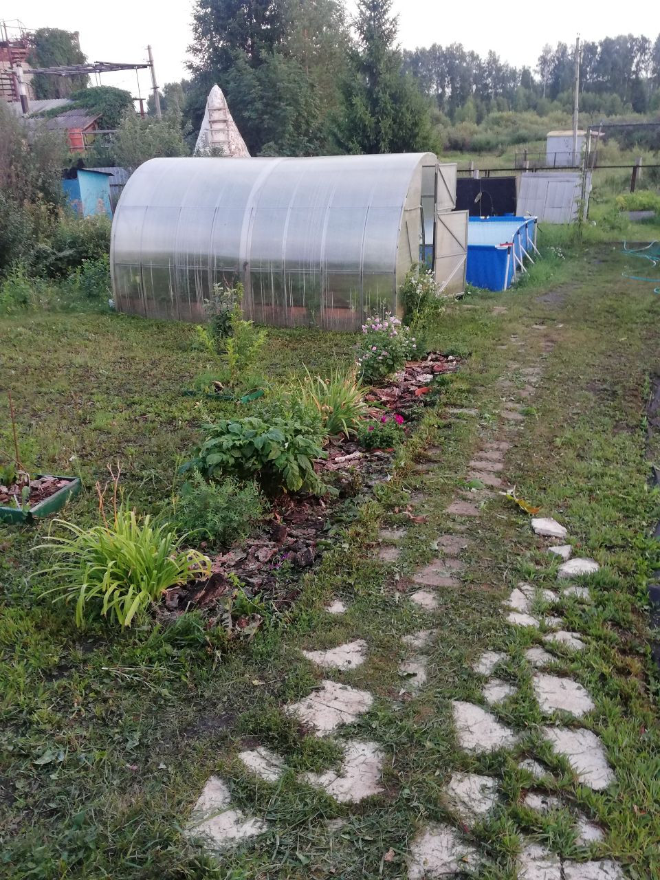 Два бака для полива. Третий бак перевернут, используется как дровник. Бассейн 7 куб.м. Качель. Два небольших хозблока. На территории участка: смородина, крыжовник, вишня, клубника, малина, жимолость, а также молодые саженцы: абрикос, слива, груша, дюк (гибрид вишни и черешни), шарафуга (гибрид сливы, персика и абрикоса), гортензия 3 сорта, сортовой пион, колоновидная яблоня, бульданеш, сирень. Сделана металлическая арка с одной стороны виноград (декоративный), с другой каприфоль (декоративная жимолость), разделяющая зону отдыха 6 соток и огород 4 сотки. На огороде все грядки высокие с "домиками" для укрытия. Два компостных контейнера. Вдоль забора огорода посажен белый шиповник, вдоль зоны отдыха - 20 сформированных елей + одна ель на штамме.