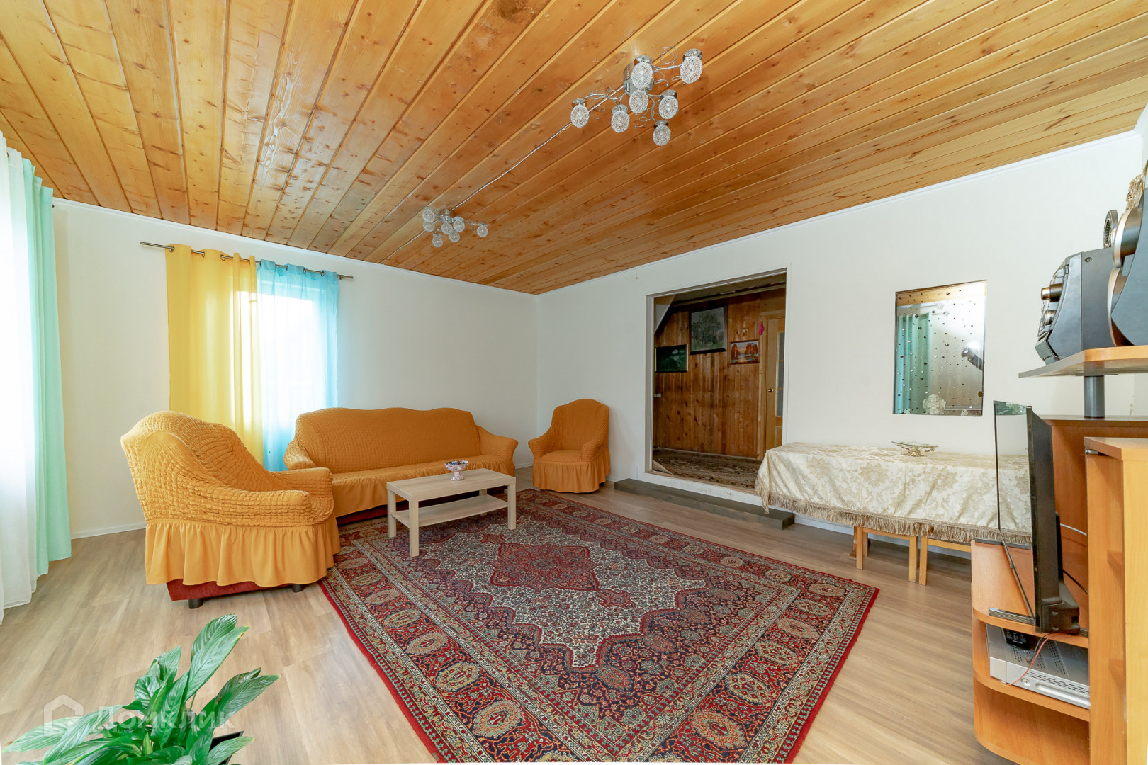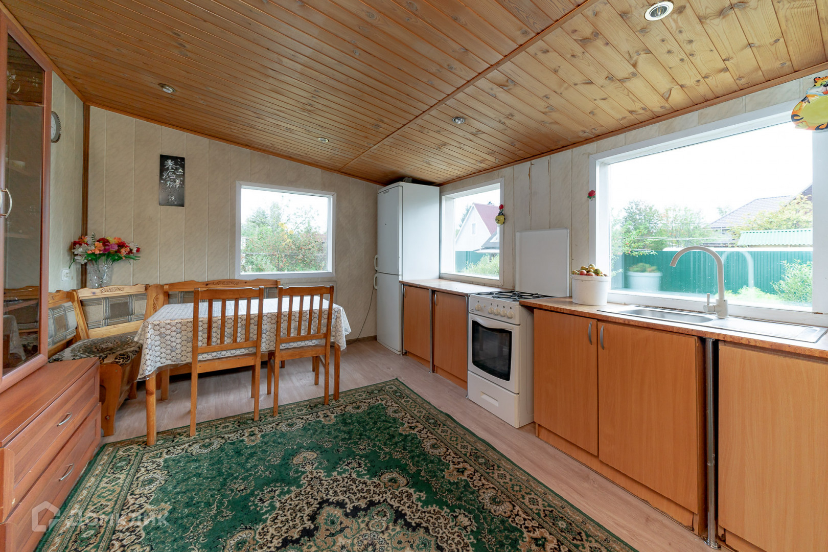 В доме 2 этажа. На первом – кухня, санузел, 2 комнаты и большая гостиная (27 кв.м.). На втором – просторная комната. Имеется уютная терраса, на которой можно любоваться цветами, зеленью и пить ароматный чай.