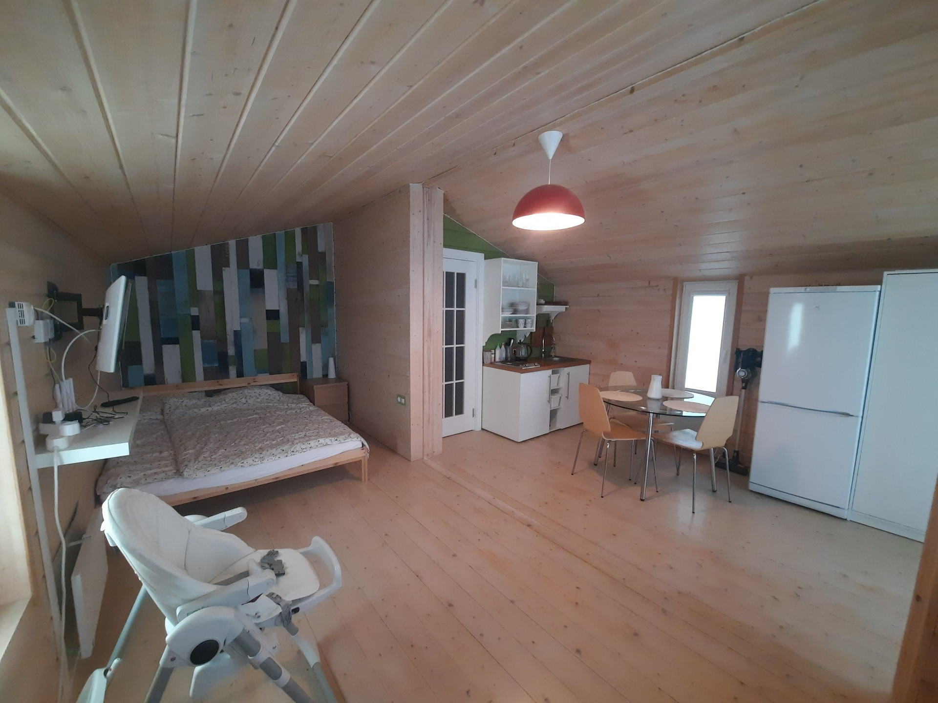 Дом модульный- каркас 50х150, утепление мин.вата 150мм по кругу (производителя не помню, брали хорошую), отделка внутренняя имитация бруса, покрашена краской тиккурила, наружняя профлист, санузел мозайка керамомараци, теплый пол инфракрасный, электрика: кабель ввгнг-LS, на розетки 3х2,5, на свет 3х1,5, все проложены в металлорукаве с пвх, эл.установка шнайдер уника. Установлены 3 батареи тепл эко, управляются термостатом. Установлен бойлер на 50 литров. На окнах ролеты и жалюзи. Крыша из профлиста.