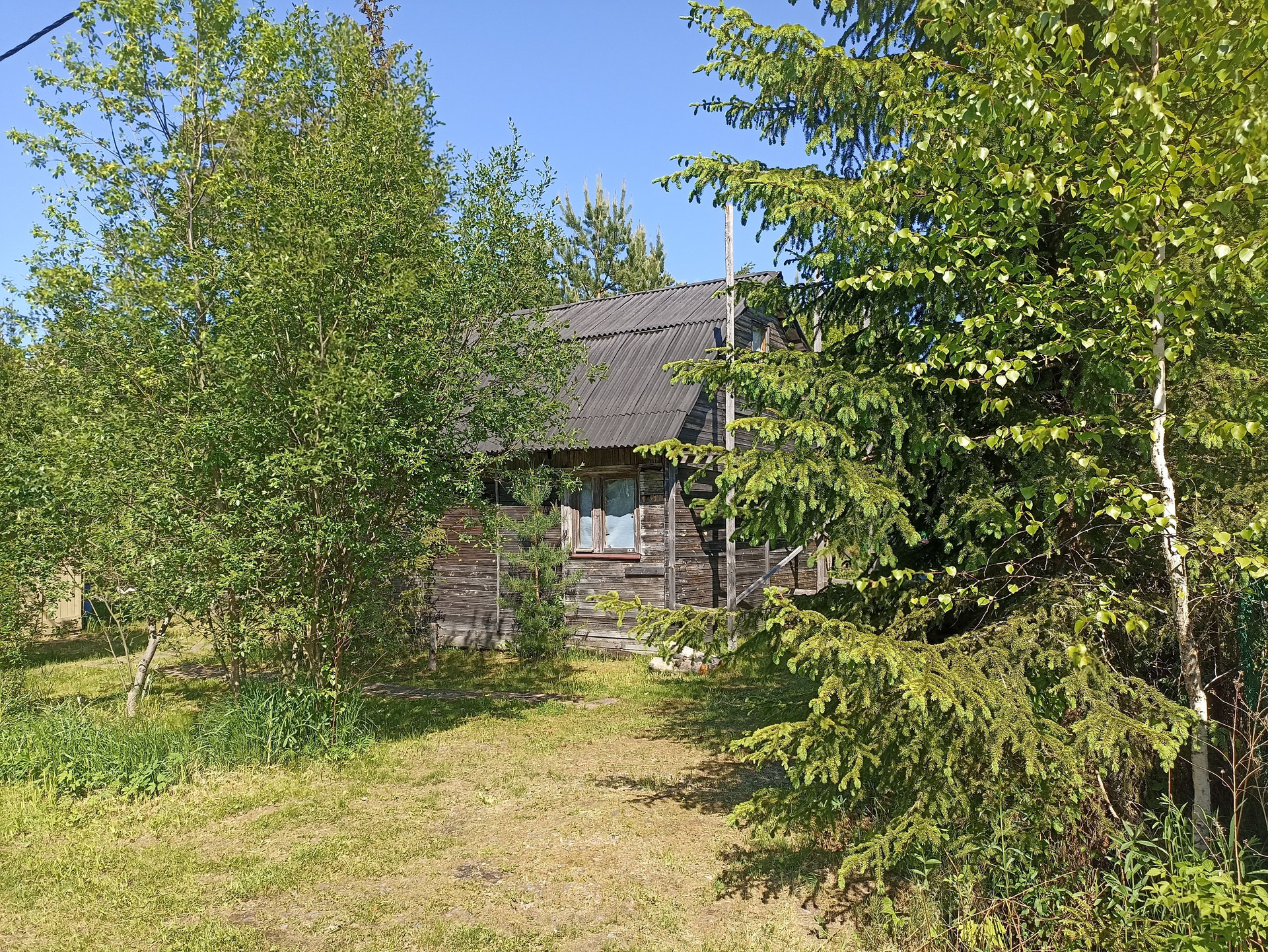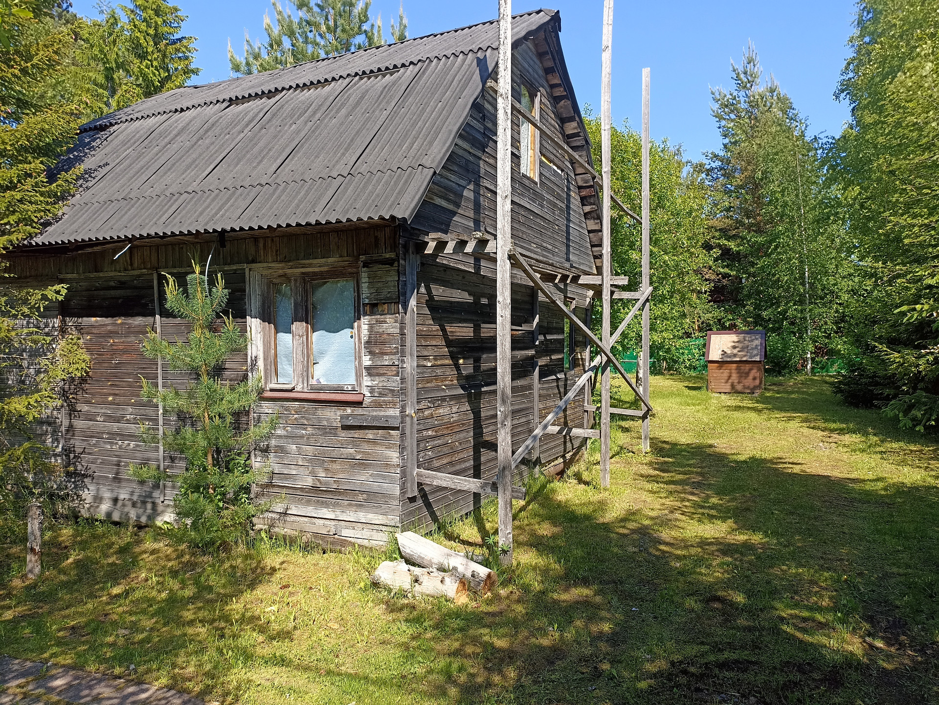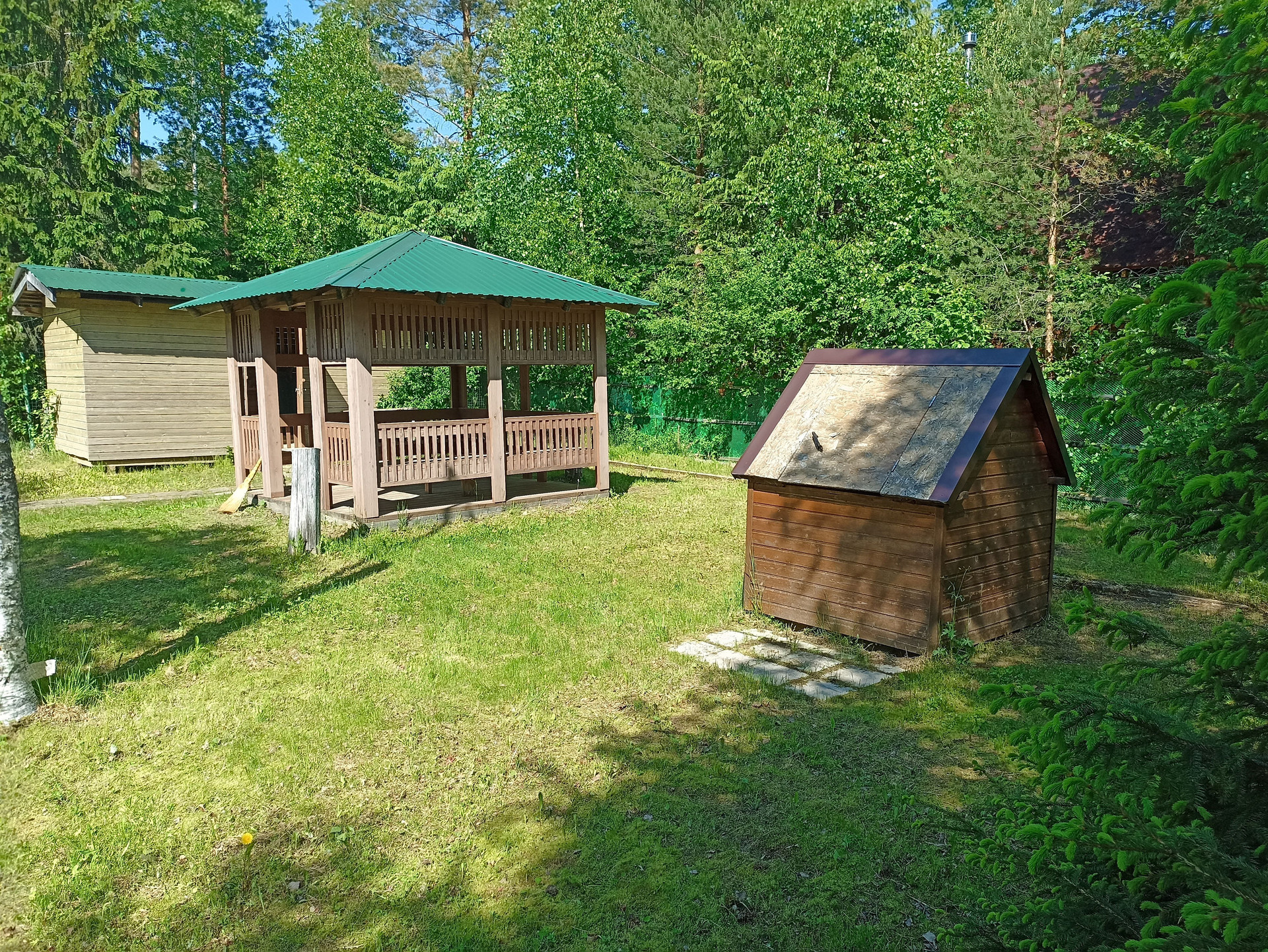 На участке расположен колодец с питьевой водой, ели и сосны, бытовка для садового инвентаря + беседка для отдыха. Летний водопровод рядом с домом ( в дом не заведен).