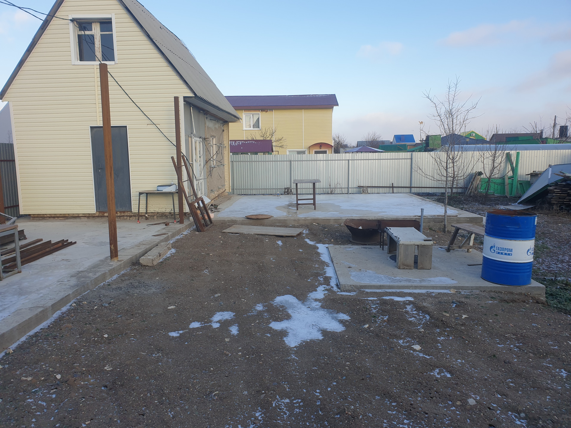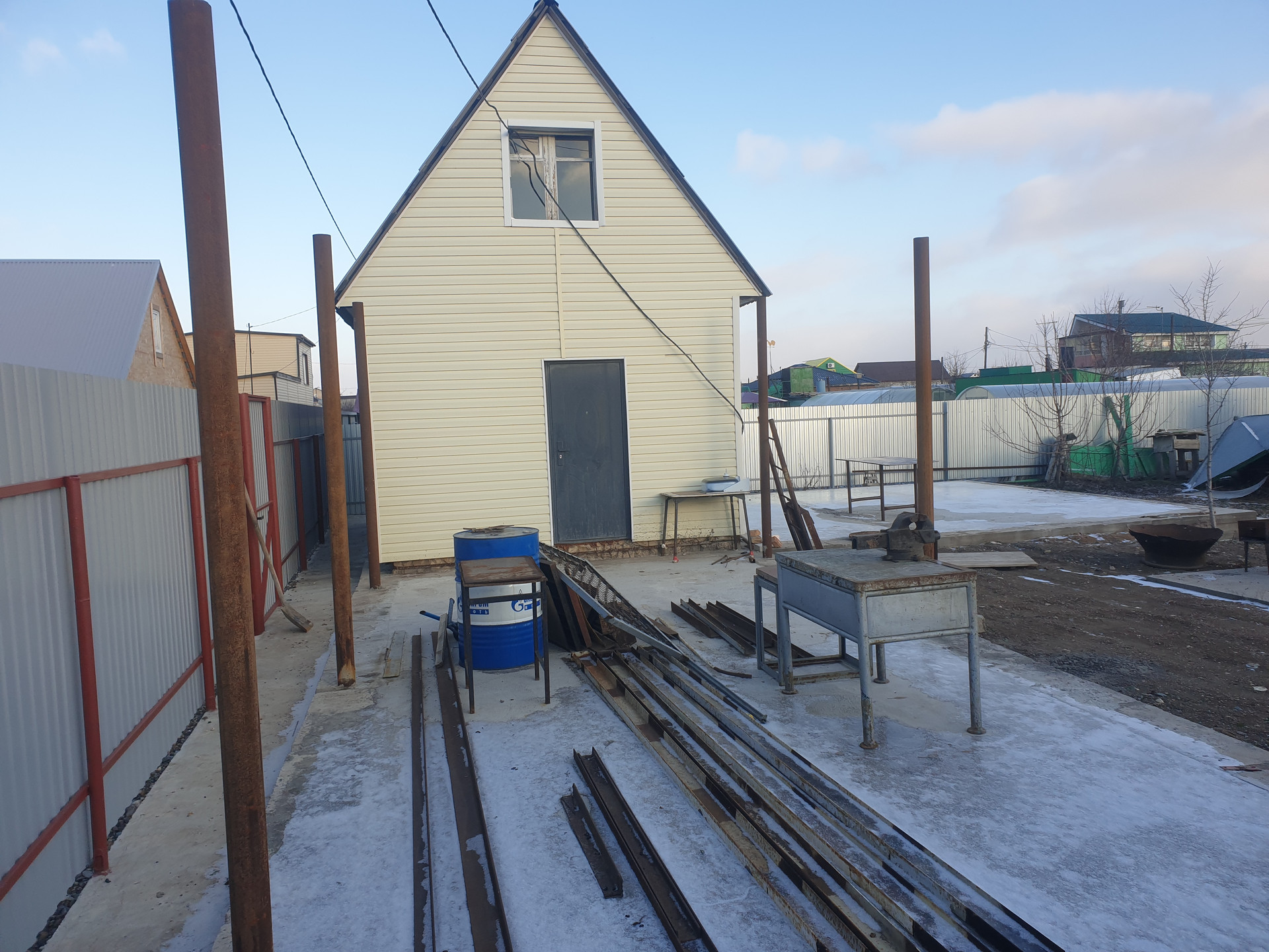 Продается участок с домиком для строительства жилого дома. Участок огорожен забором из крашенного профлиста с армированной лентой. Сделаны большие ворота и калитка. На участке залит капитальный фундамент, стяжка под дом и гараж, сделана отмостка. Проложены трубы для воды в дом, имеется скважина. Проведена канализация. Заведён на участок газ, имеется свет. Подготовлена и залита яма под уличный туалет.