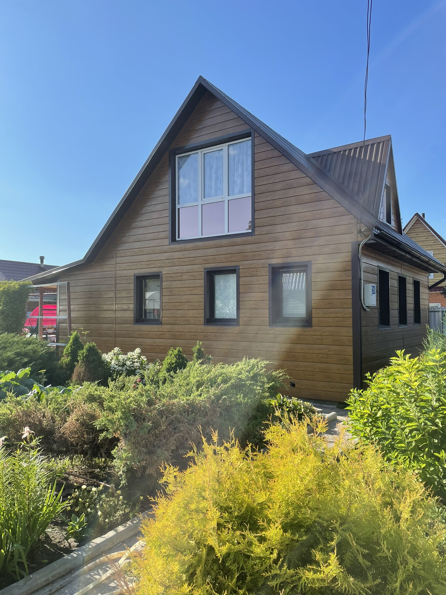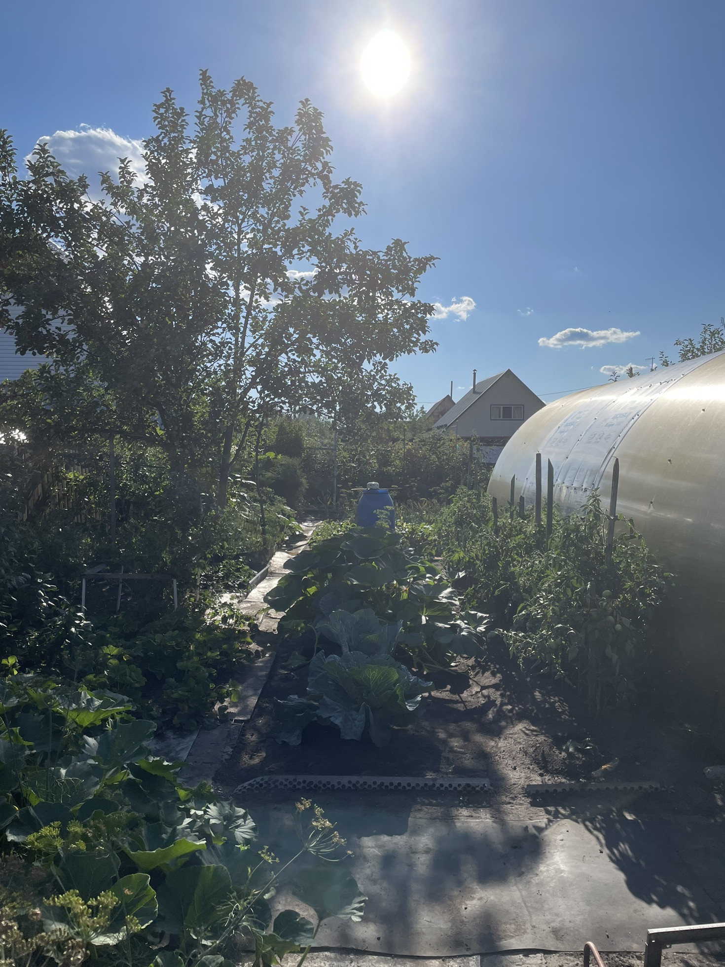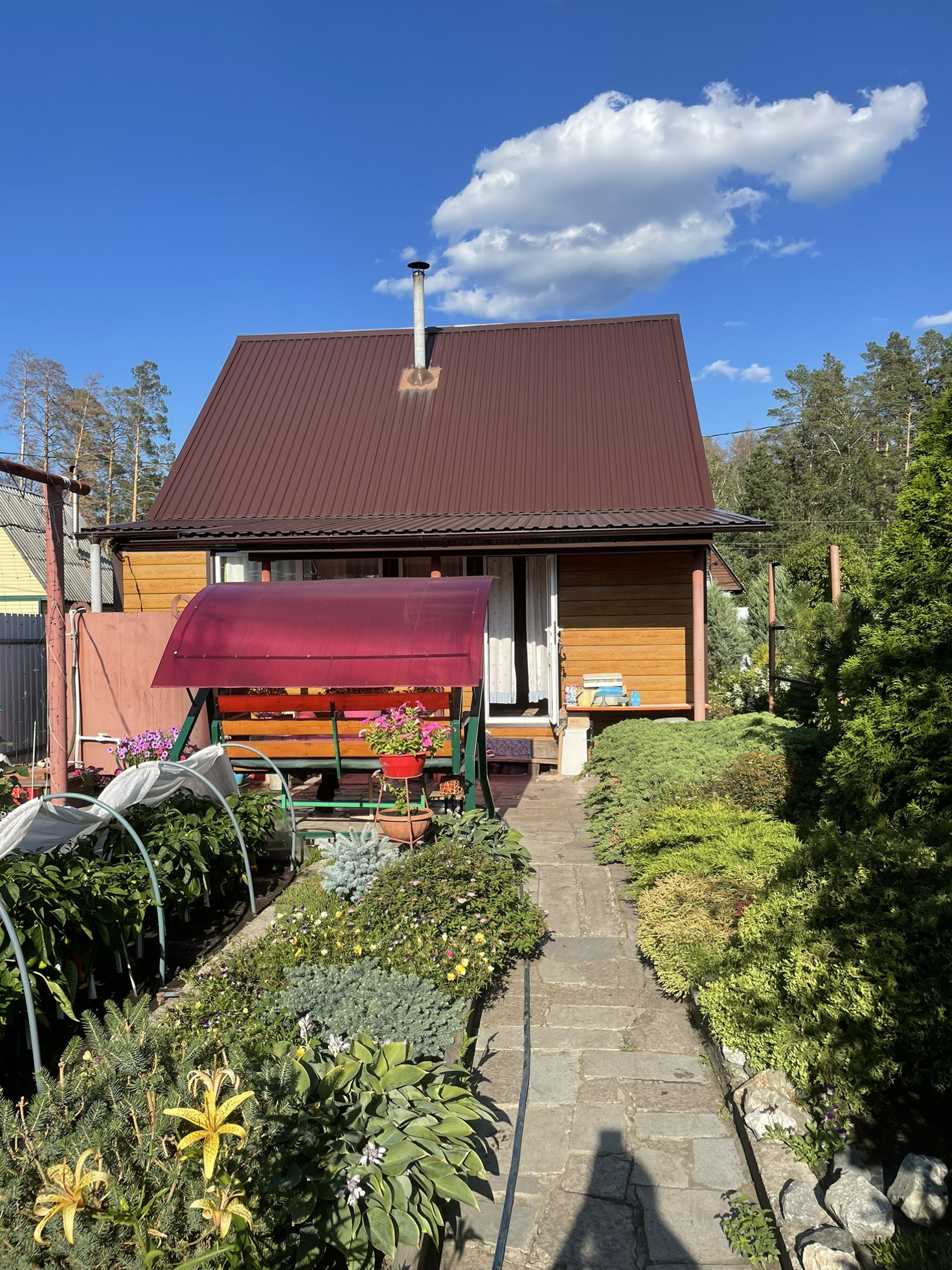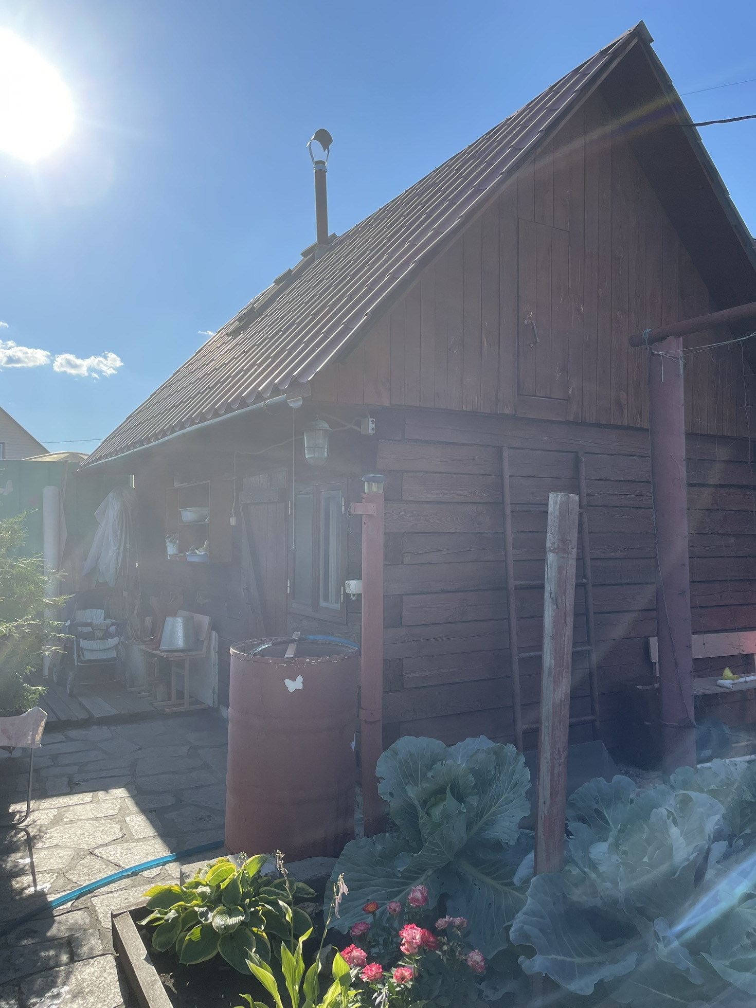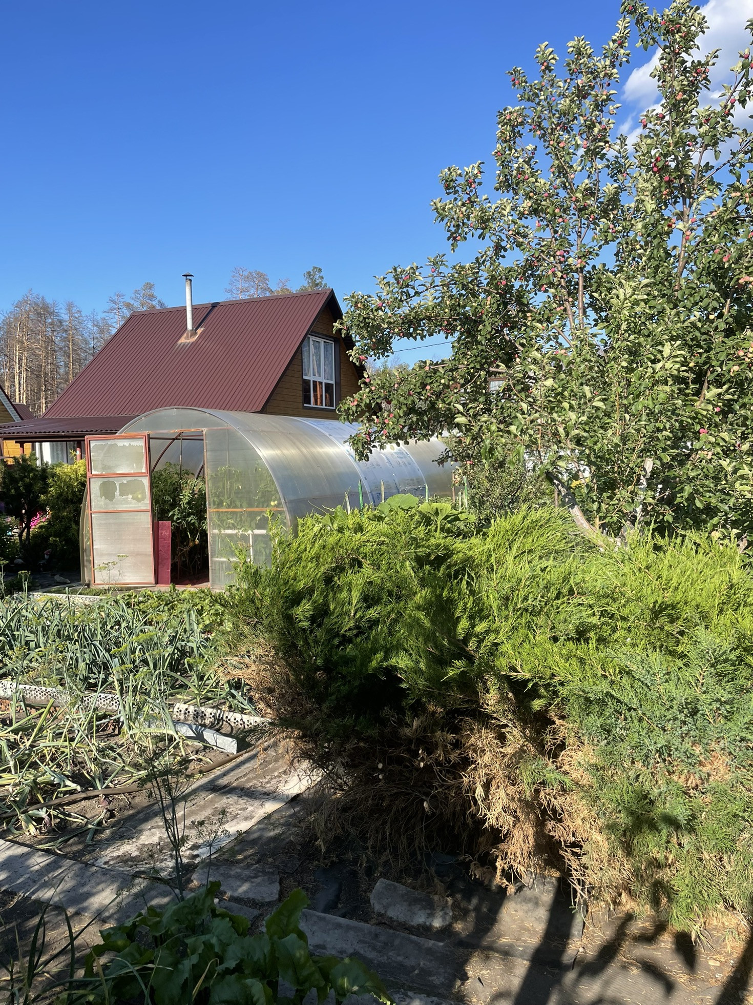 На огороде можжевельники, хвои, яблони, малина, крыжовник, гортензии, теплица, колодец, большой бак для воды, место для стоянки авто. Баня с парилкой. Полив включают 3 раза в неделю.