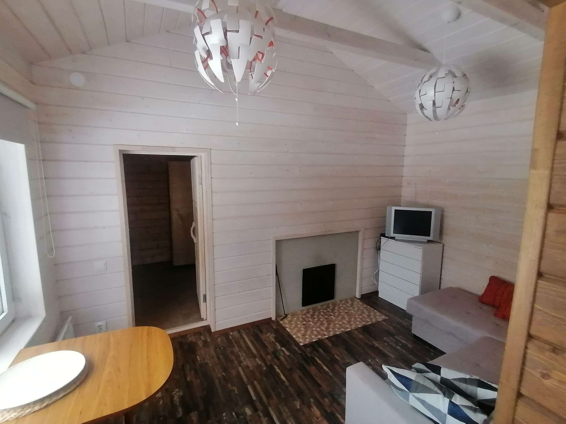 - крыльцо плюс маленькая комната (пока не придумали как использовать, поэтому просто храним кресла-мешки, когда не сидим на них на газоне), большая комната с диваном раскладным и выходом печки (сауна), из большой комнаты вход в моечное отделение и оттуда уже в парилку.