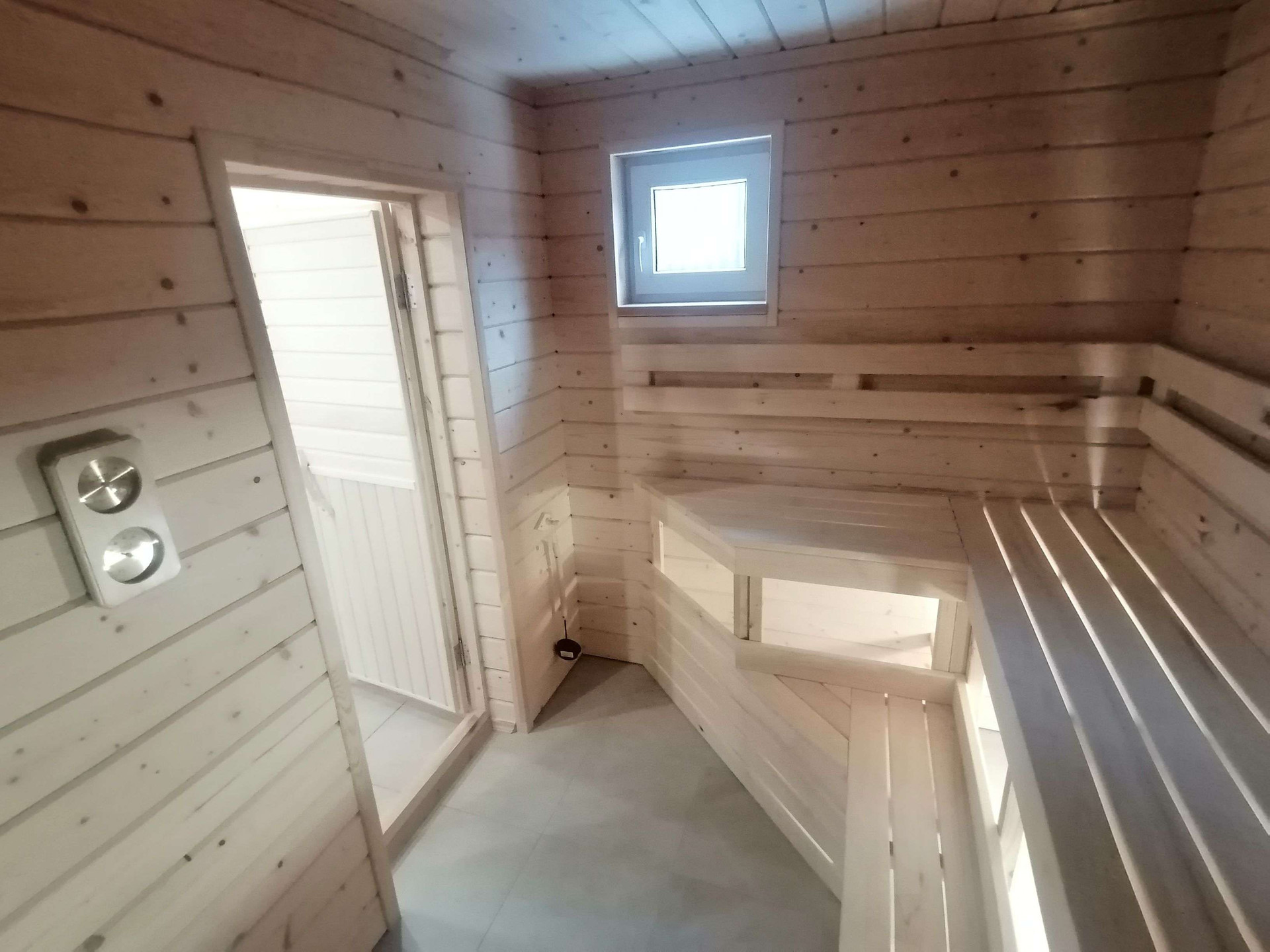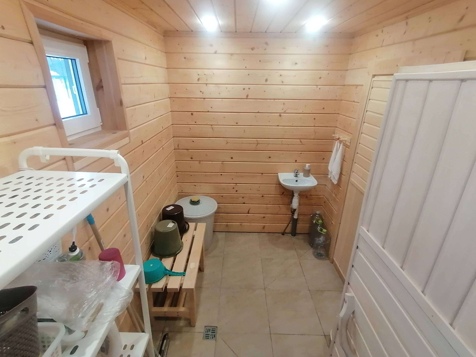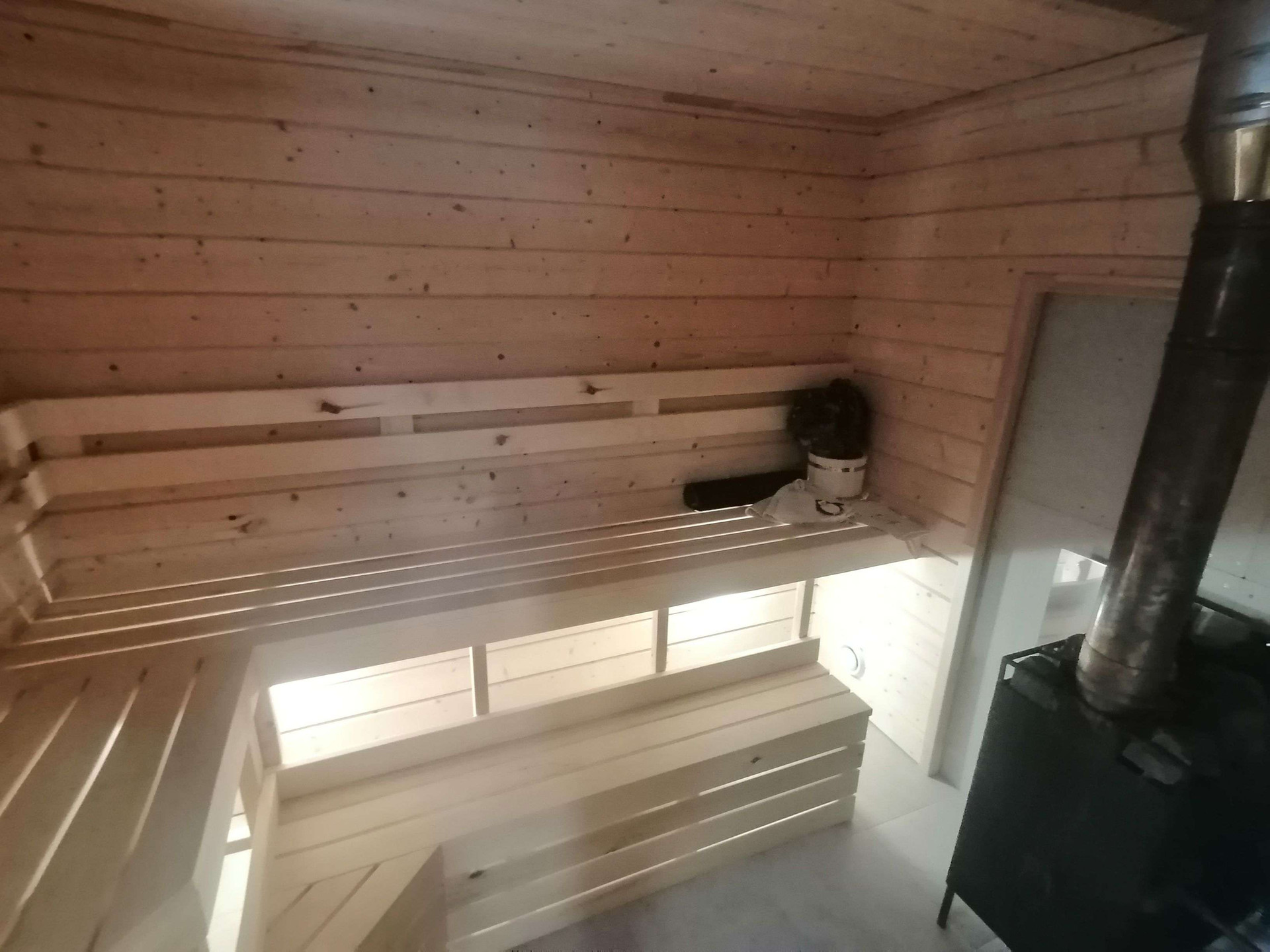 - Парилка: полки и стены осина, светильники Харвиа, окно открывается для проветривания.