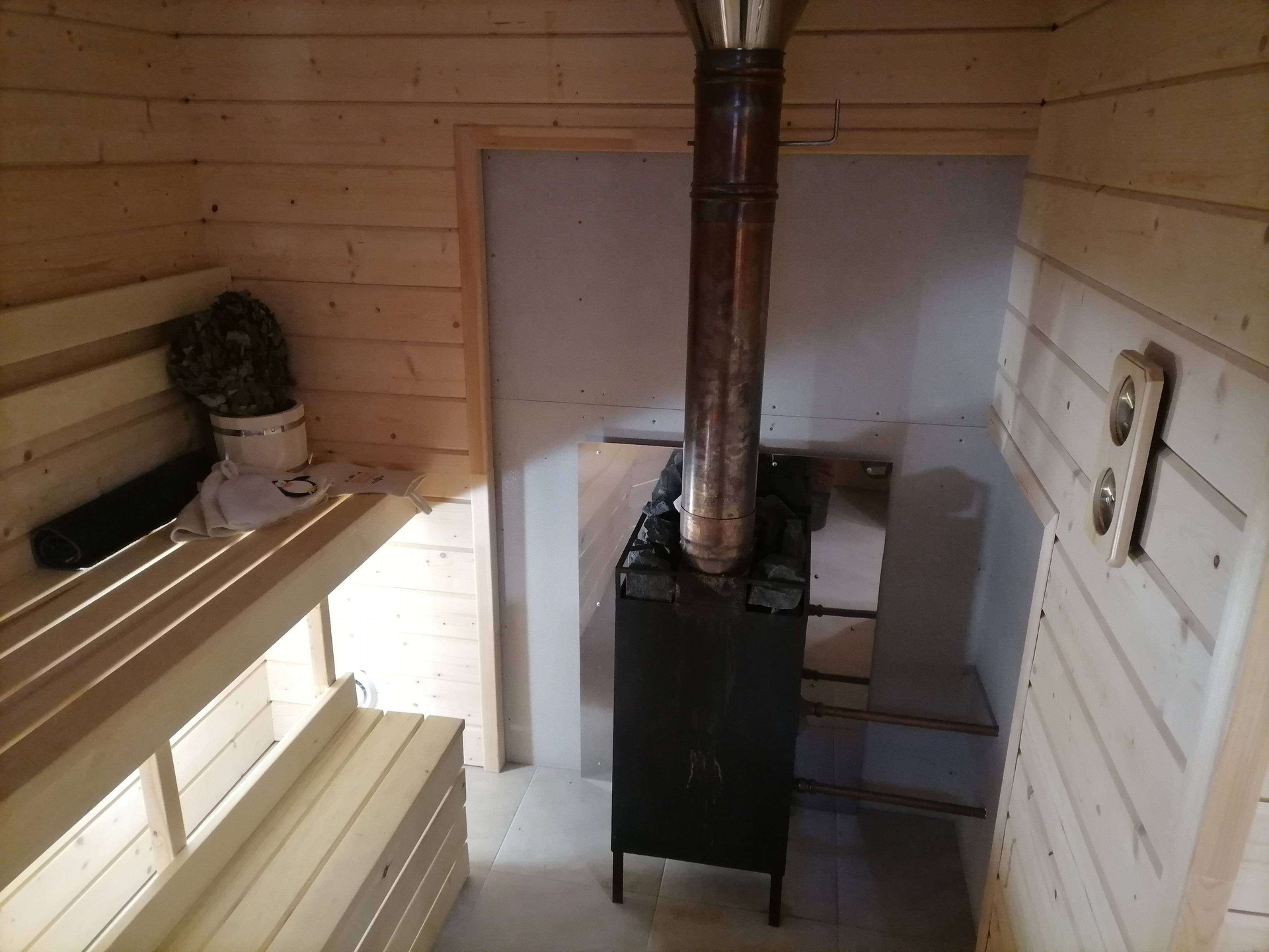 - Печка с дверцей и небольшим окном покупалась в Ками (собственное производство), установлена по всем нормам и правилам, труба-сэндвич. К печки подключен большой бак нержавейка через медную обвязку - горячая вода.