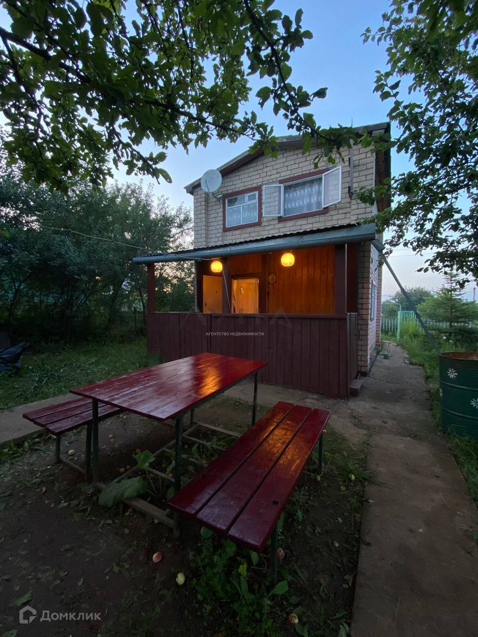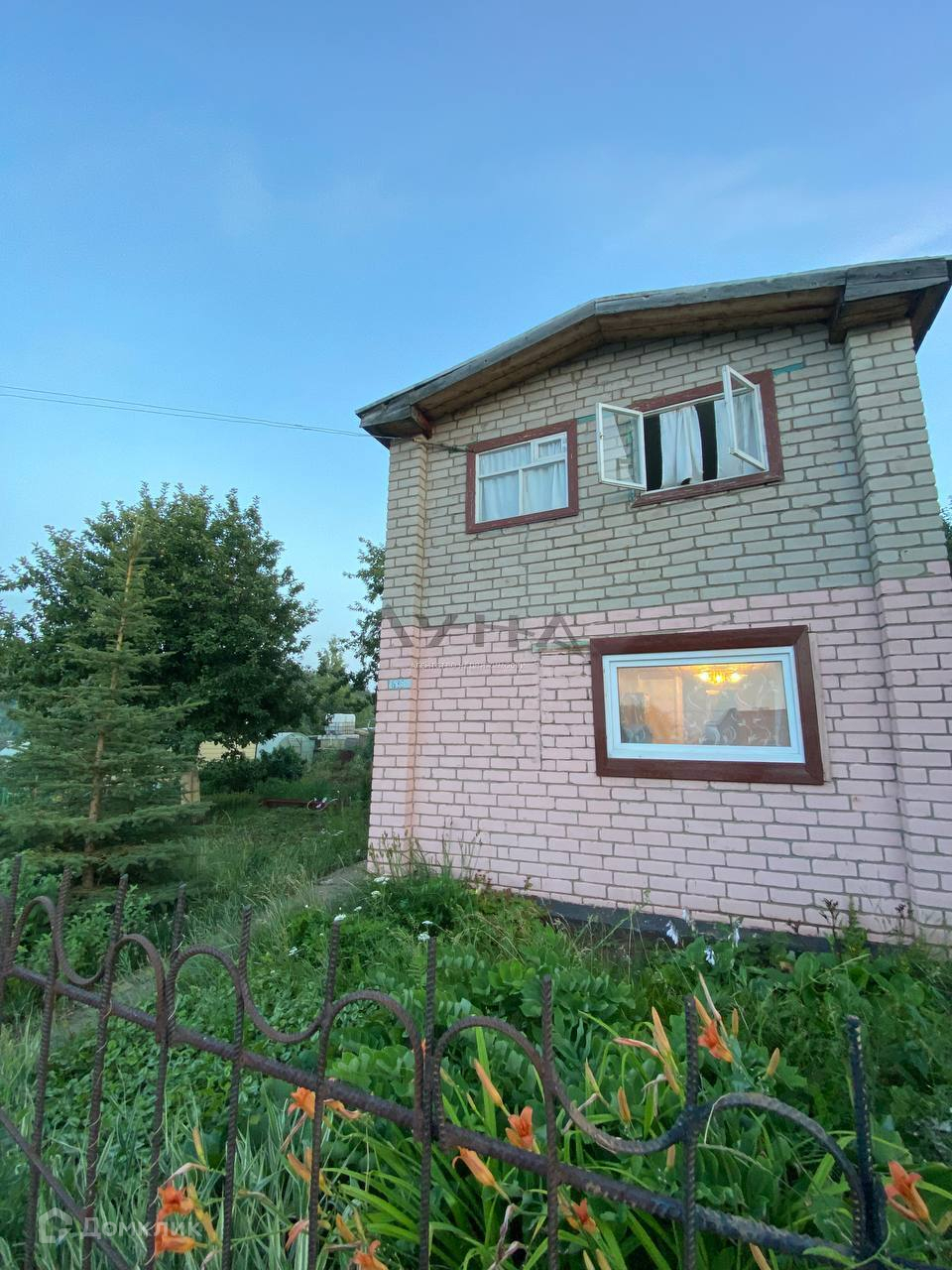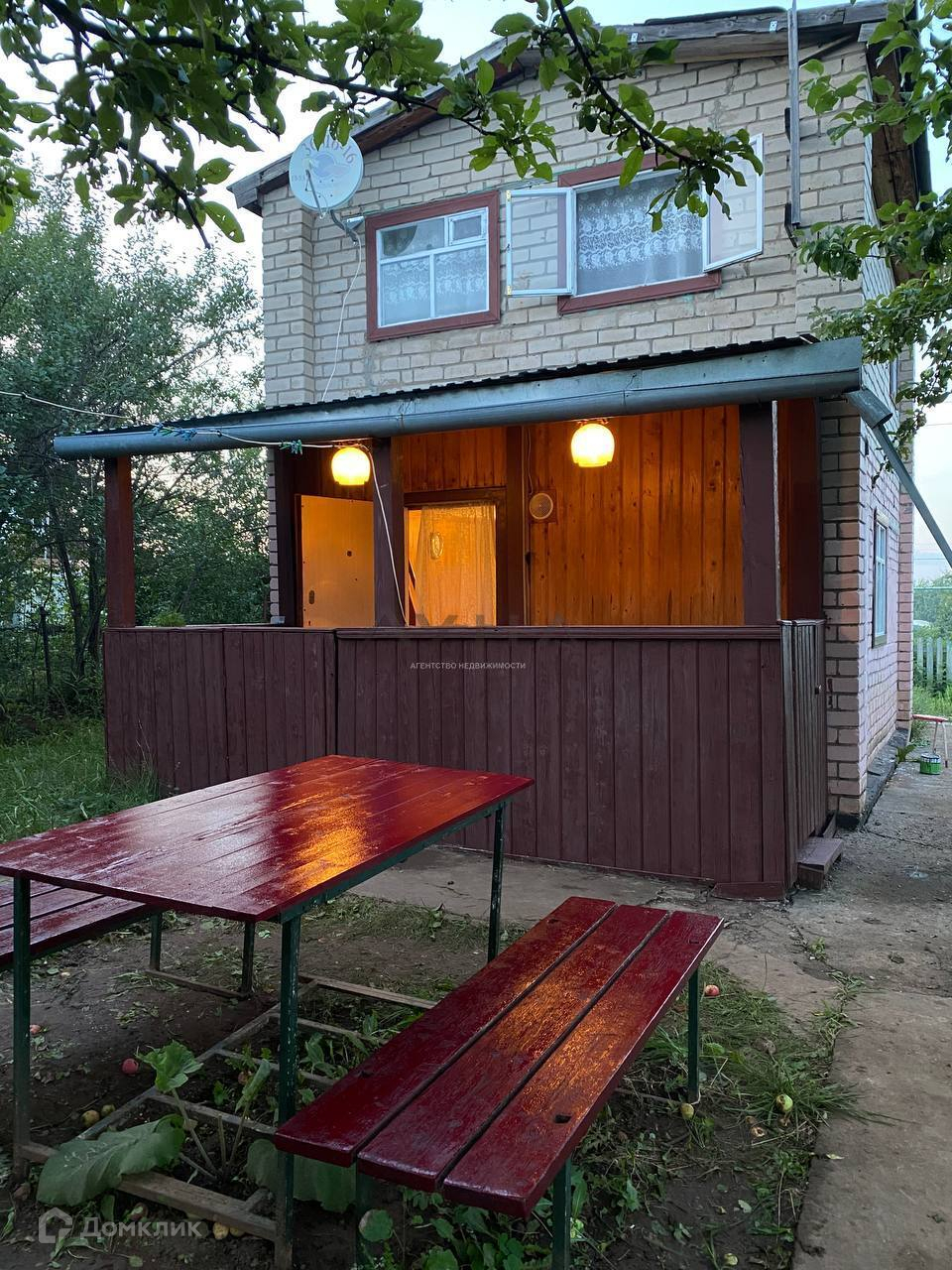 Участок 4 сотки, двухэтажный кирпичный дом (40 кв.м.) с открытой верандой. Внутренняя отделка: первый этаж обшит деревянной панелью, второй покрашен. Окна- на первом окна пластиковые, на втором деревянные. В доме сливная система.Мебель остается, всё в хорошем состоянии.