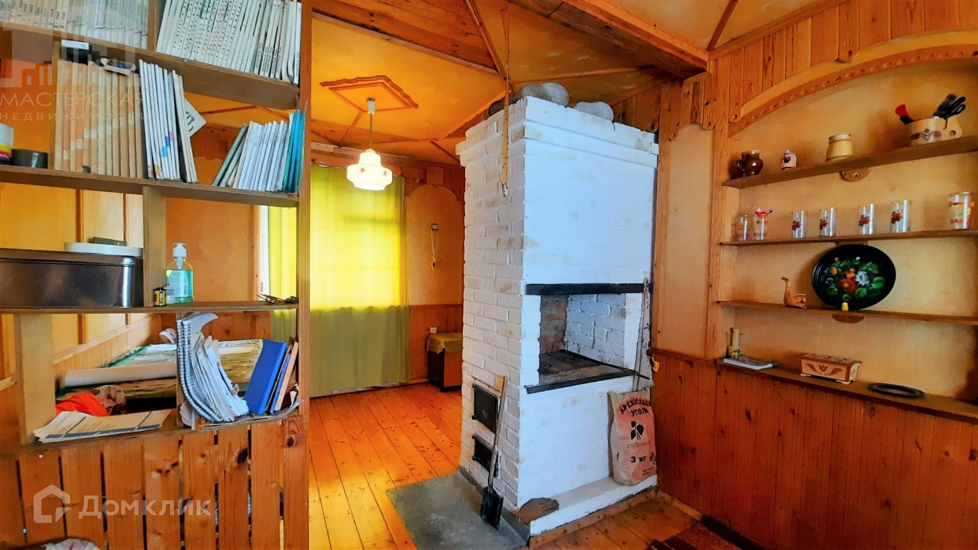 На первом этаже веранда, кухня и комната, на втором - 1 большая комната с перегородкой. В доме есть печь и камин.