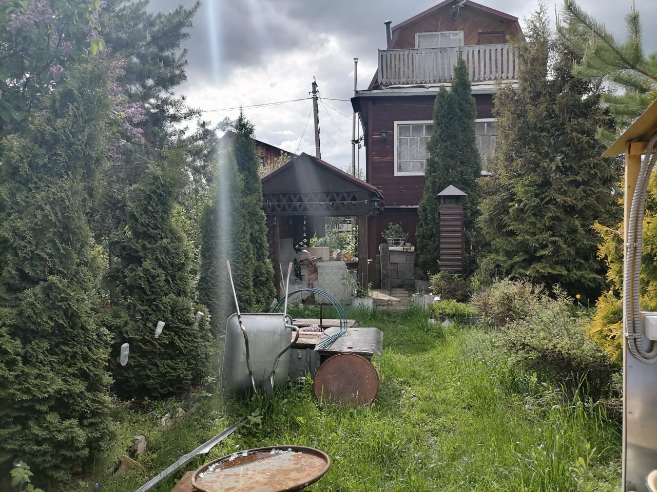 Участок 4 сот., дом 3 этажа с балконом (первый - кирпич, второй - сруб, третий - мансарда).
