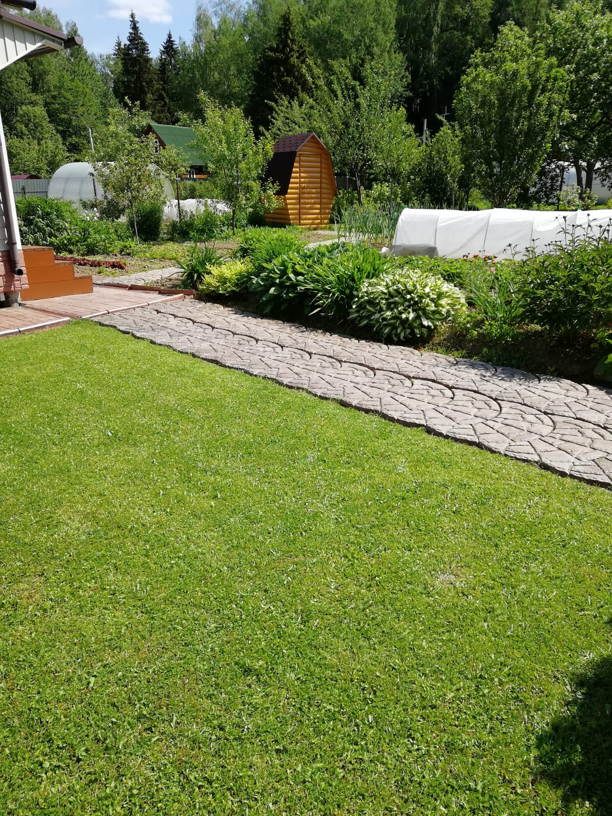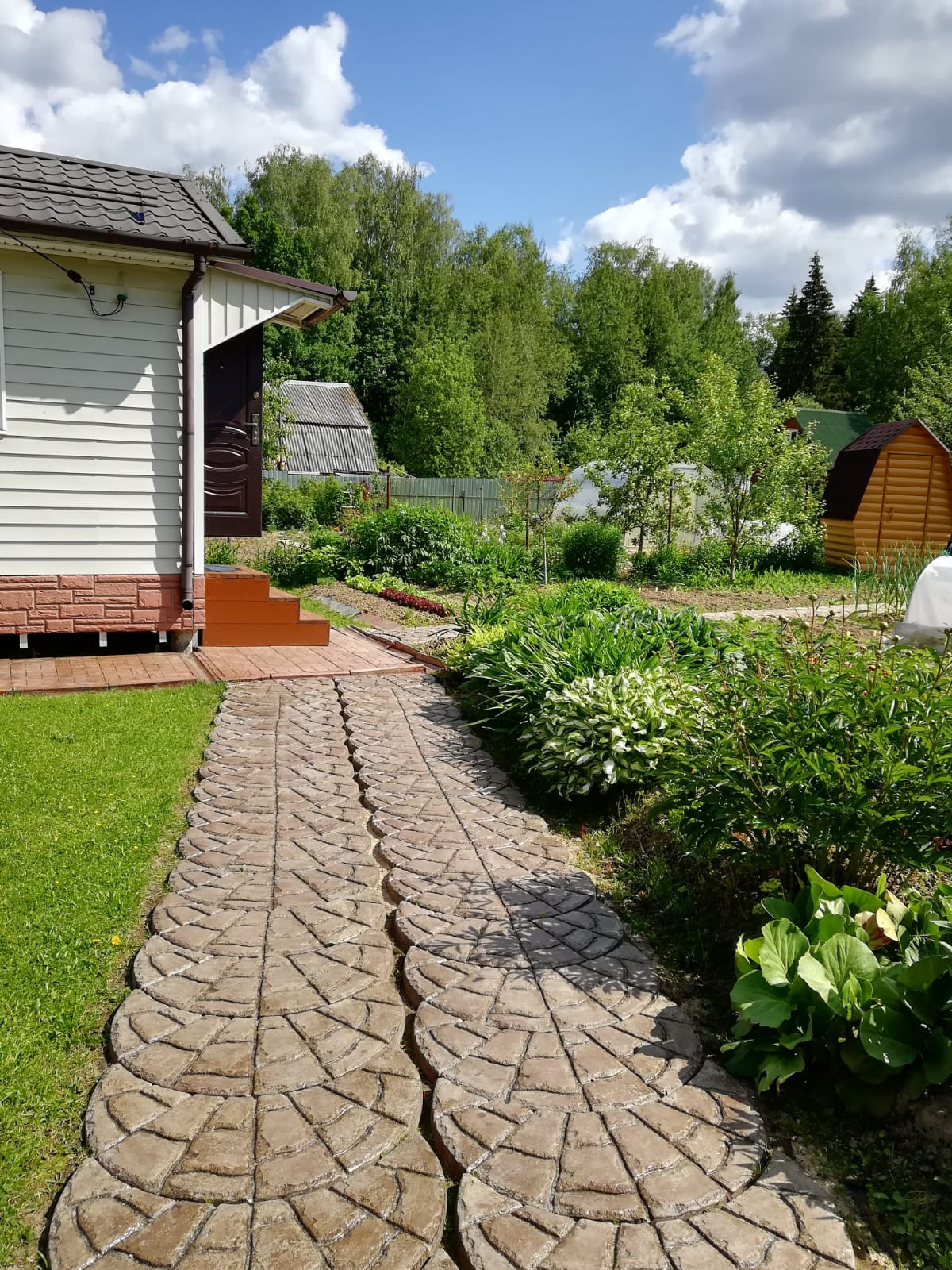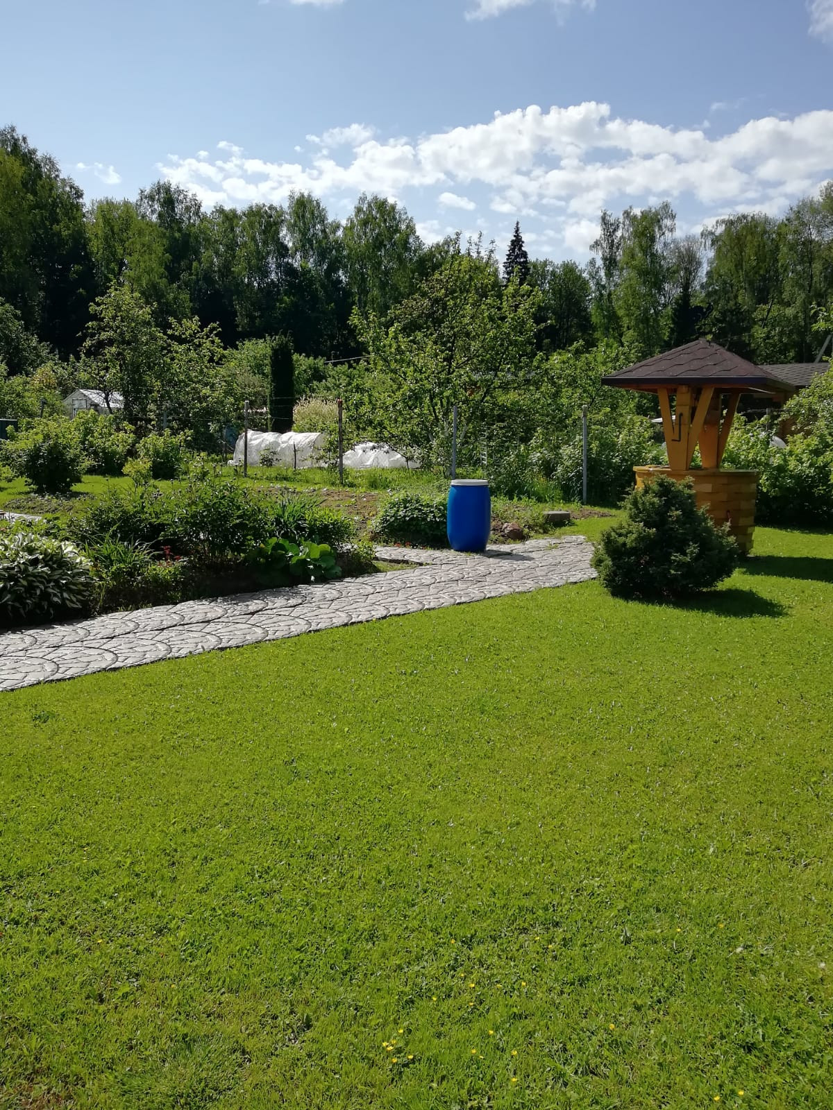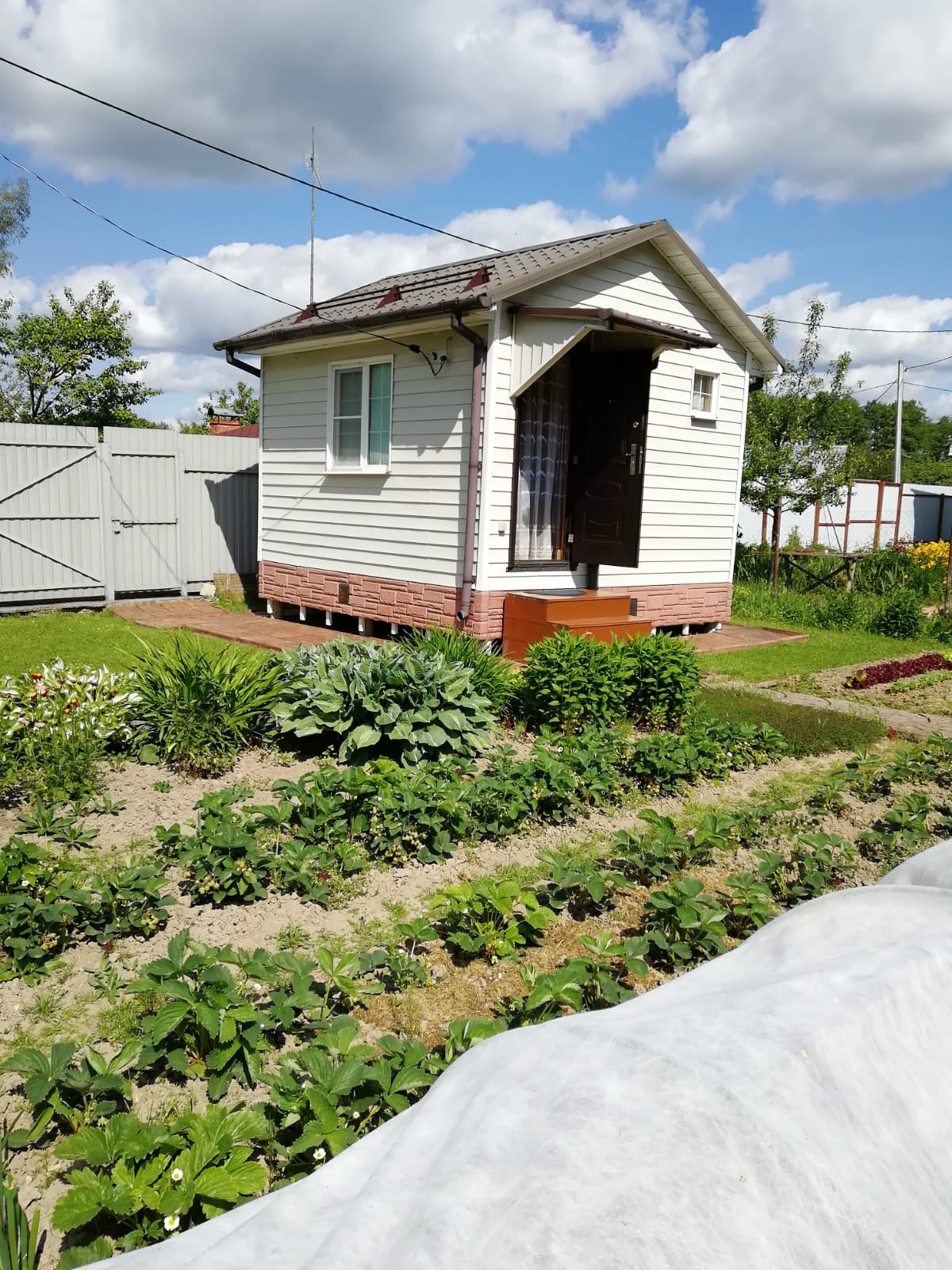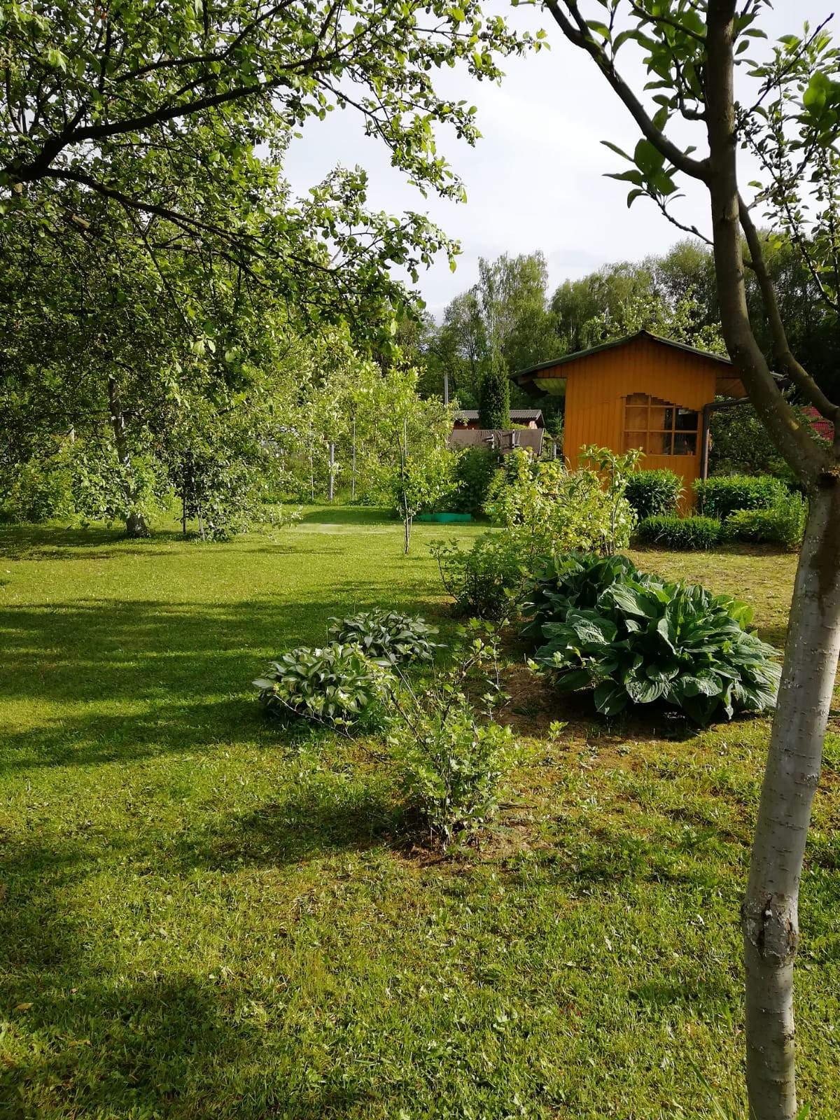 На участке три яблони, черешня, четыре сорта сливы, арония, кусты черной смородины, крыжовник, малина, ежевика, жимолость, грядки с клубникой, цветы - гортензия, и много многолетних цветов.