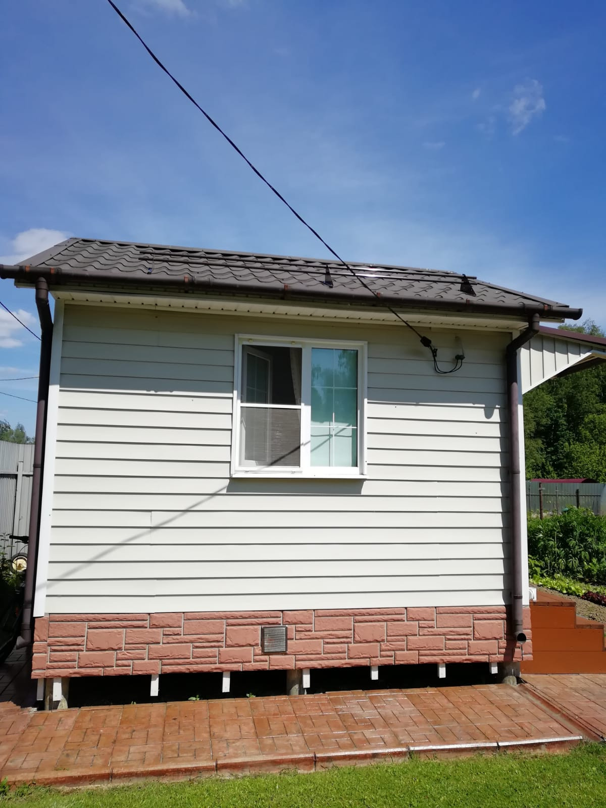 Дом каркасно-щитовой, небольшой, компактный (12.1 м.кв.), утеплен и обшит сайдингом, новые водостоки и снегоупоры;