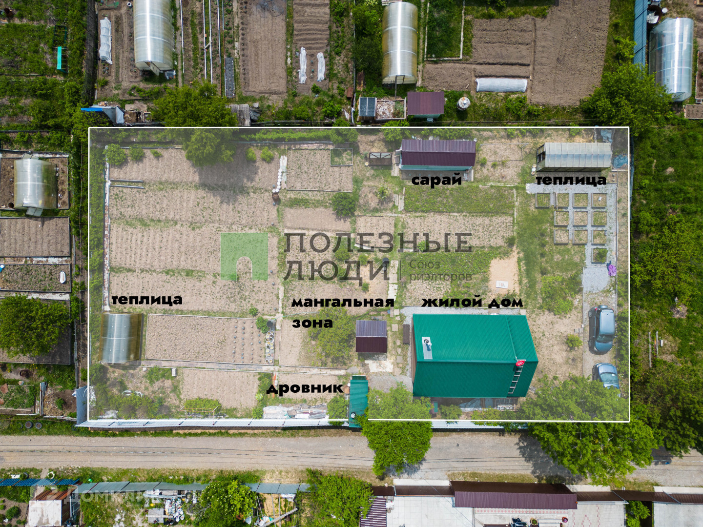 На участке площадью 12,29 сот расположены: мангальная зона, сарай 2х6м, 2 теплицы, несколько дровников.
