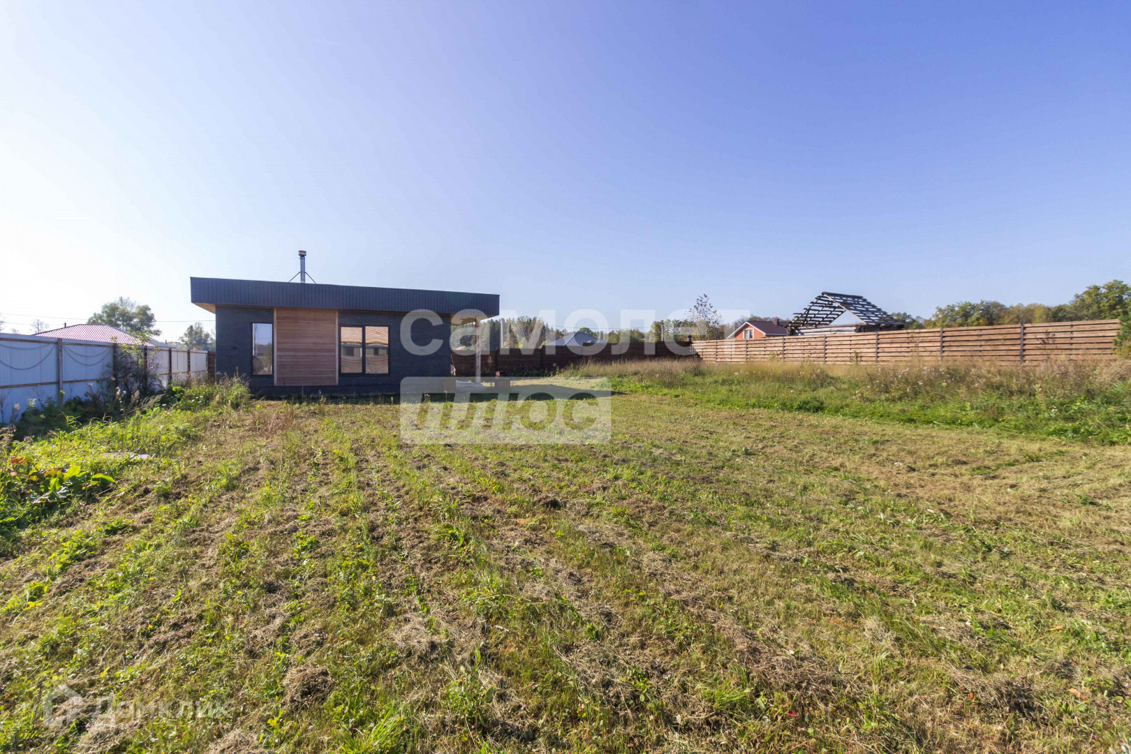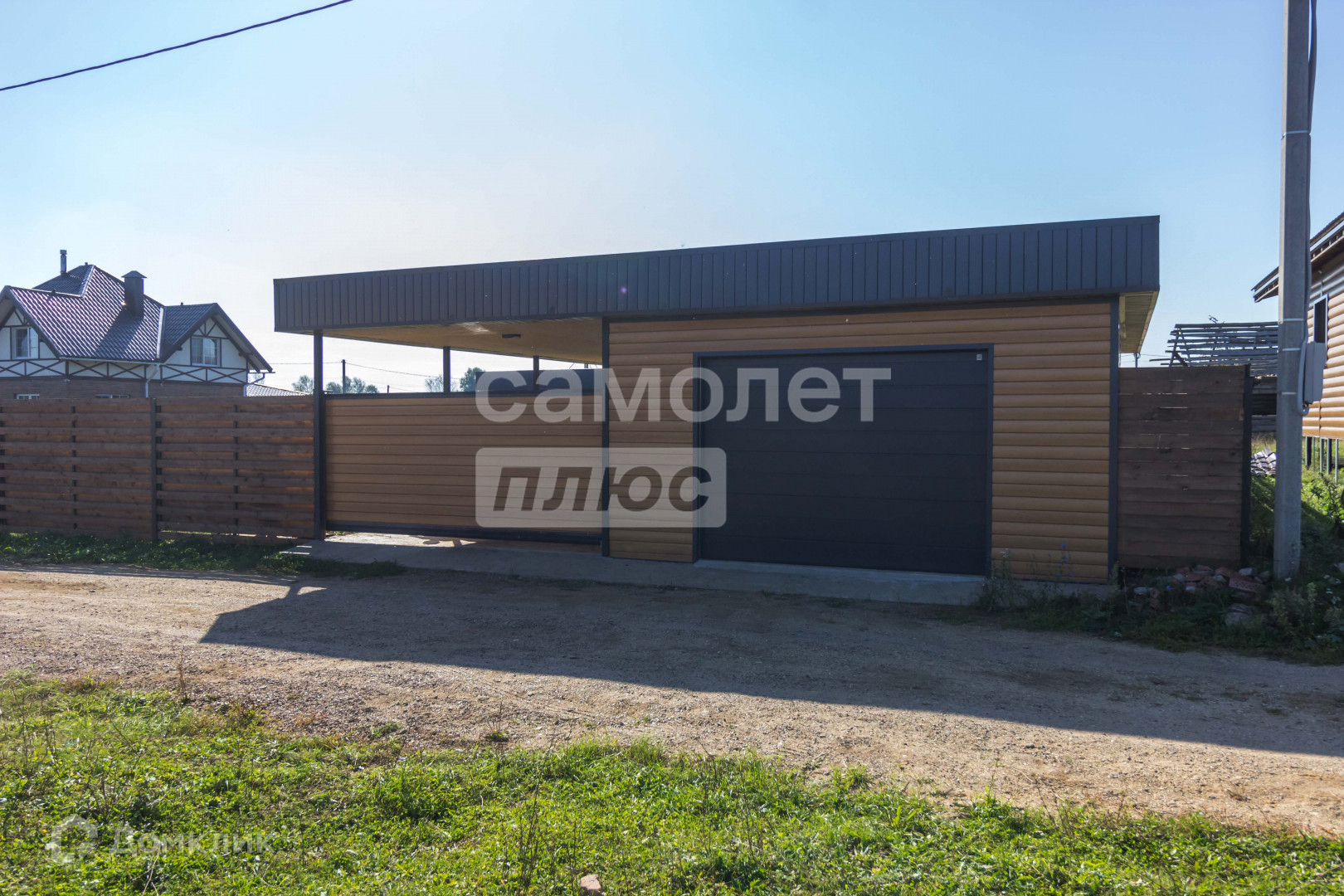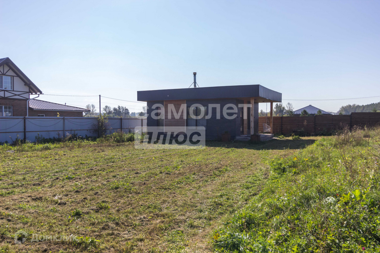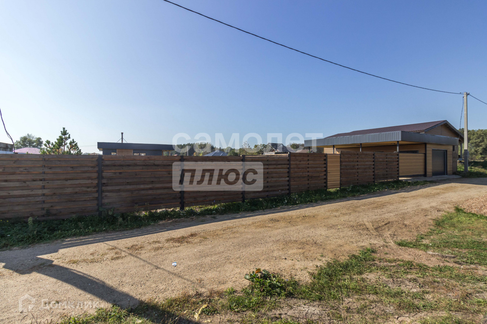 Участок 12 соток имеет правильную форму с многолетними насаждениями по периметру, забор выполнена из прямоугольного металлического профиля, горизонтальный штакетник из дерева, въезд осуществляется через автоматические откатные ворота.