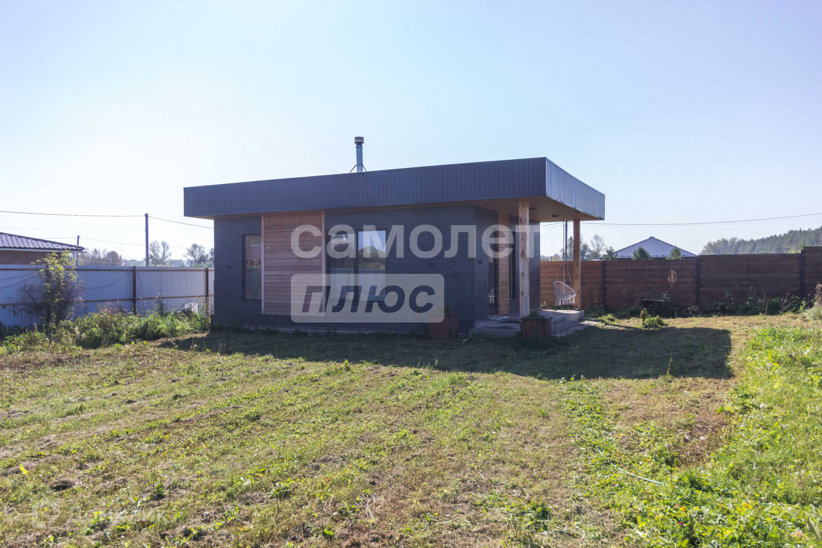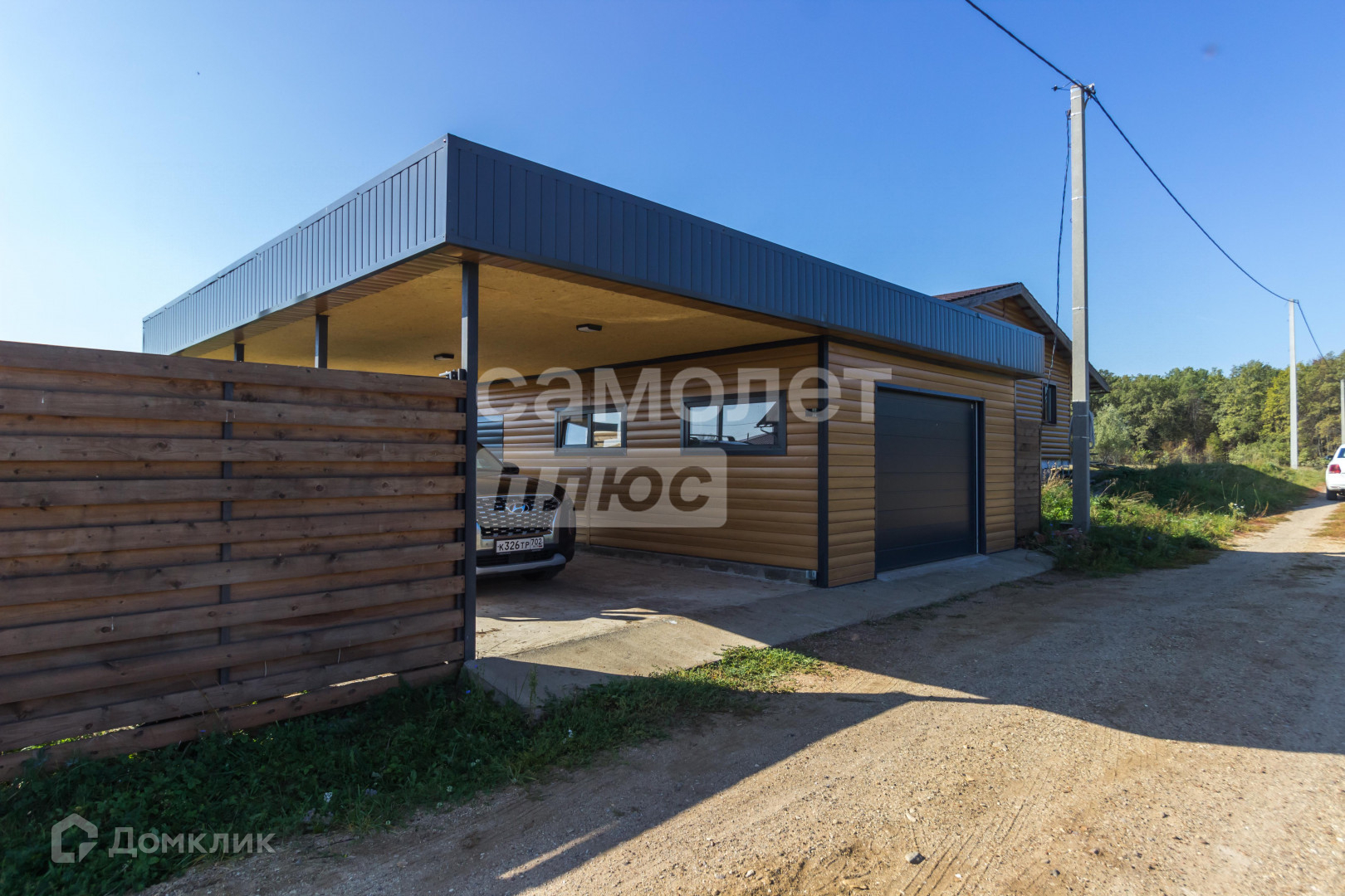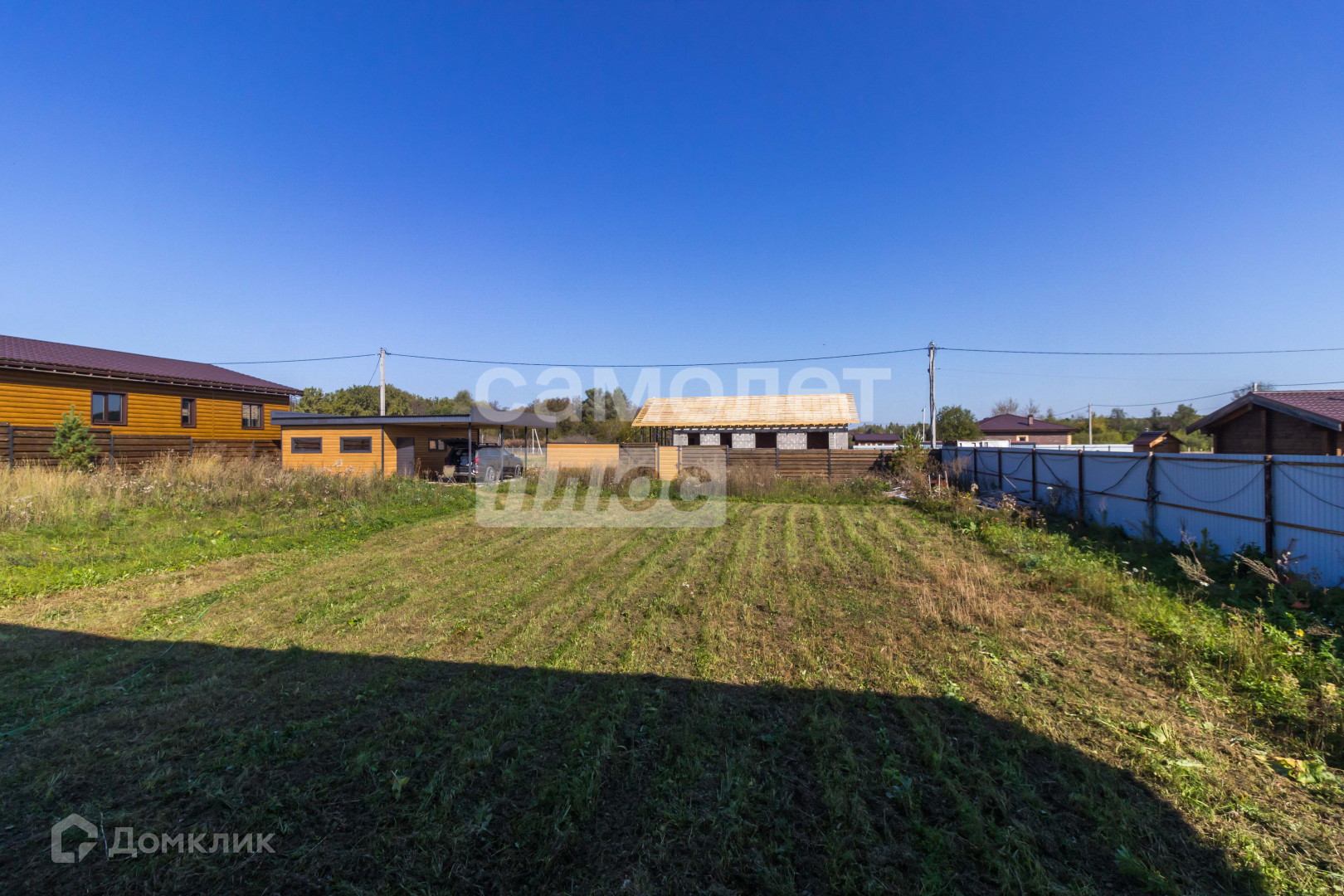 Участок 12 соток имеет правильную форму с многолетними насаждениями по периметру, забор выполнена из прямоугольного металлического профиля, горизонтальный штакетник из дерева, въезд осуществляется через автоматические откатные ворота.