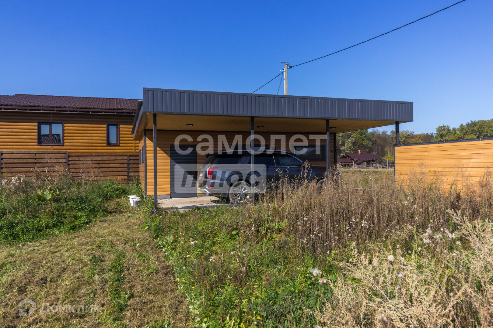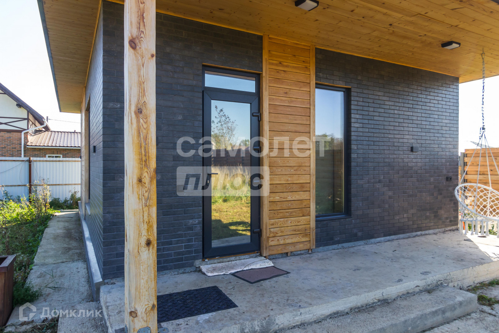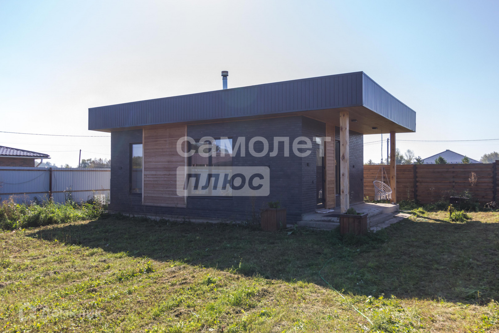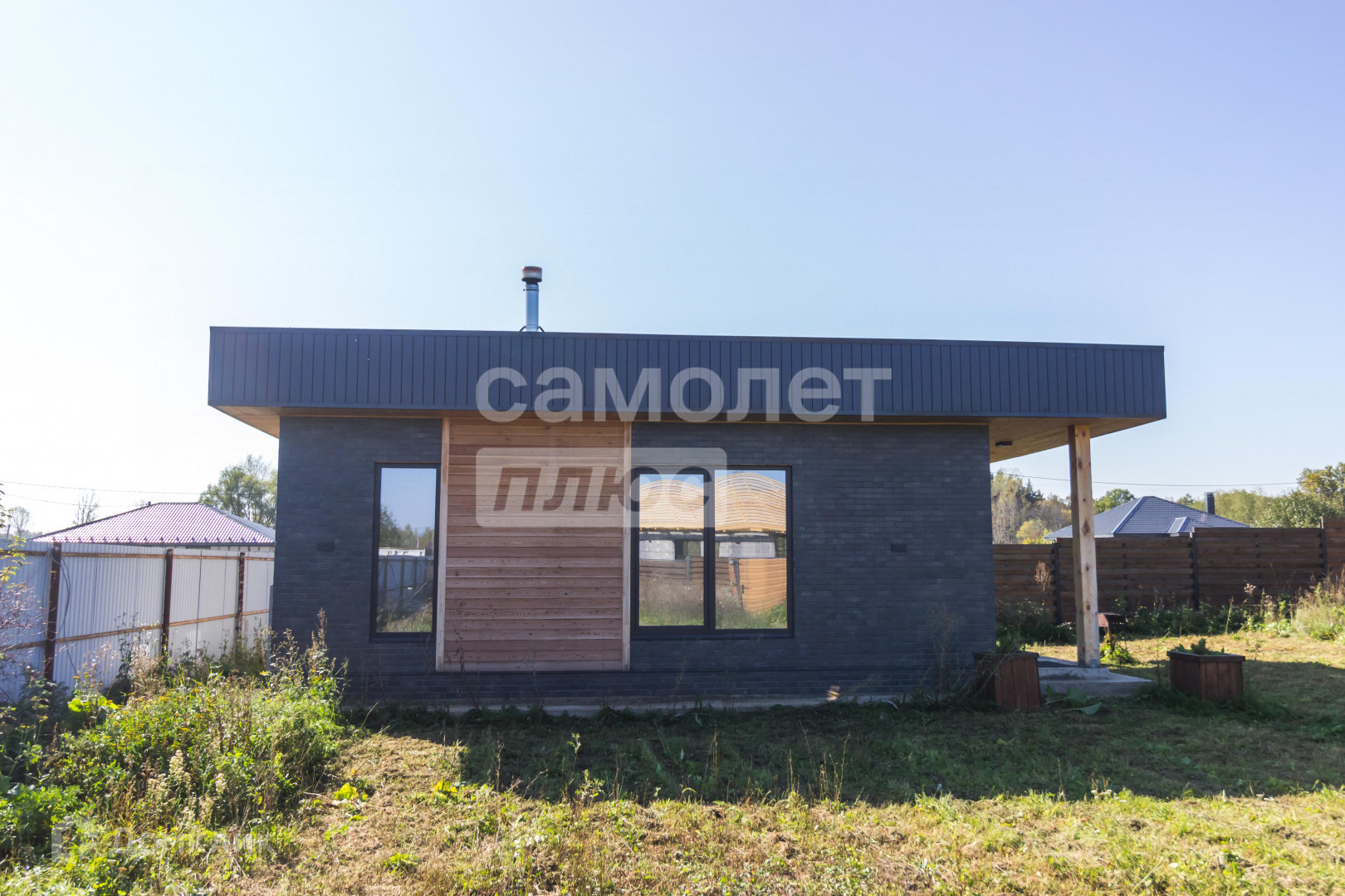 Участок 12 соток имеет правильную форму с многолетними насаждениями по периметру, забор выполнена из прямоугольного металлического профиля, горизонтальный штакетник из дерева, въезд осуществляется через автоматические откатные ворота.