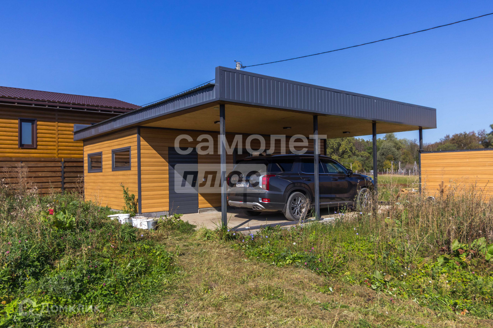 Парковка для двух больших машин, площадка под навесом забетонирована, в гараже на полу кафельная плитка керамо марацци.