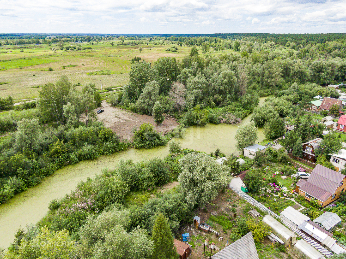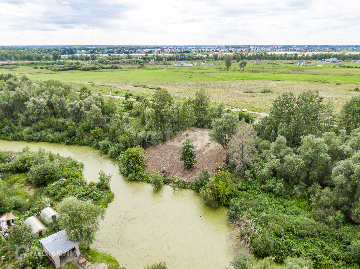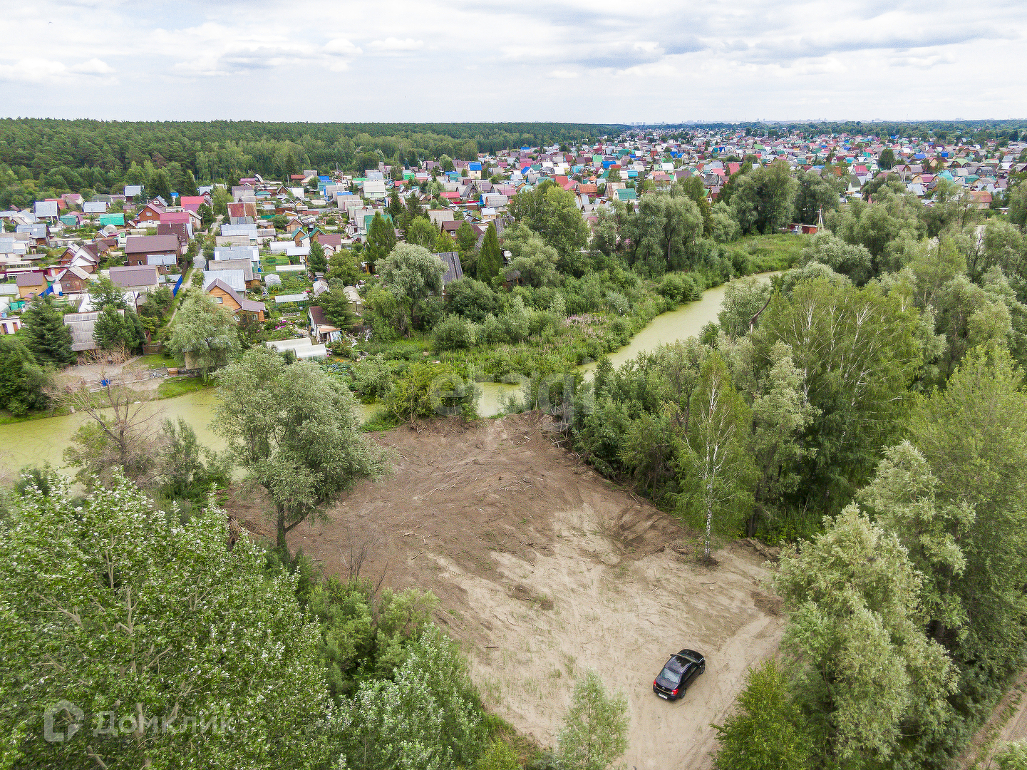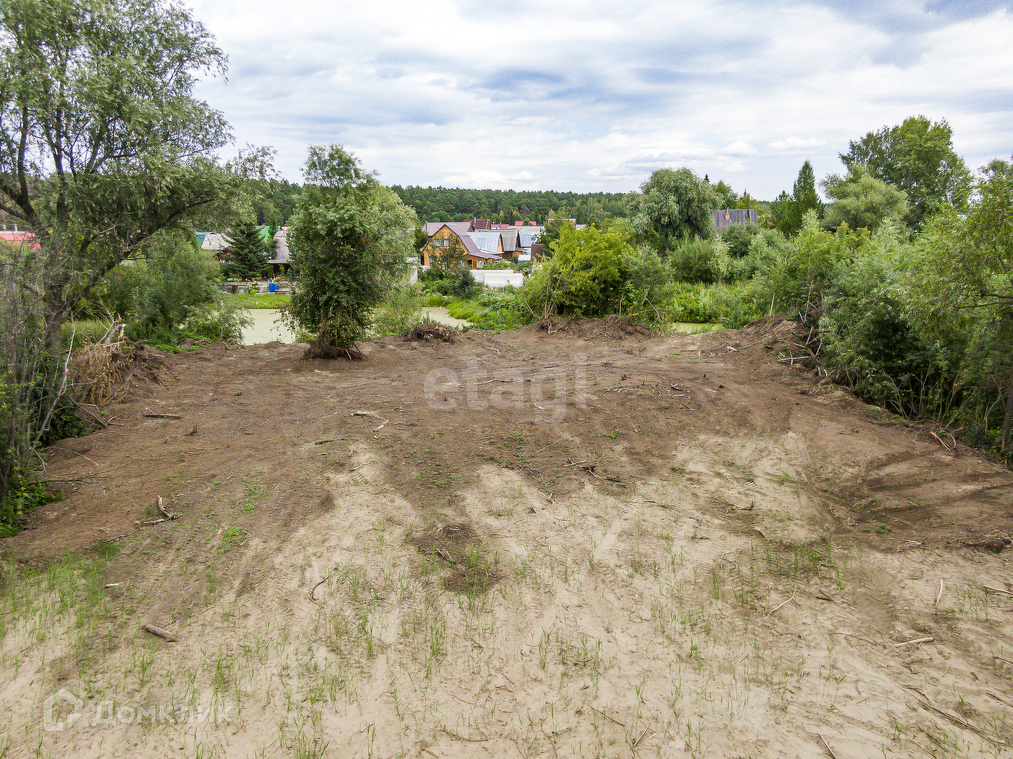 Участок ровный,чистый,расположен в живописном месте,позади протекает протока озера.