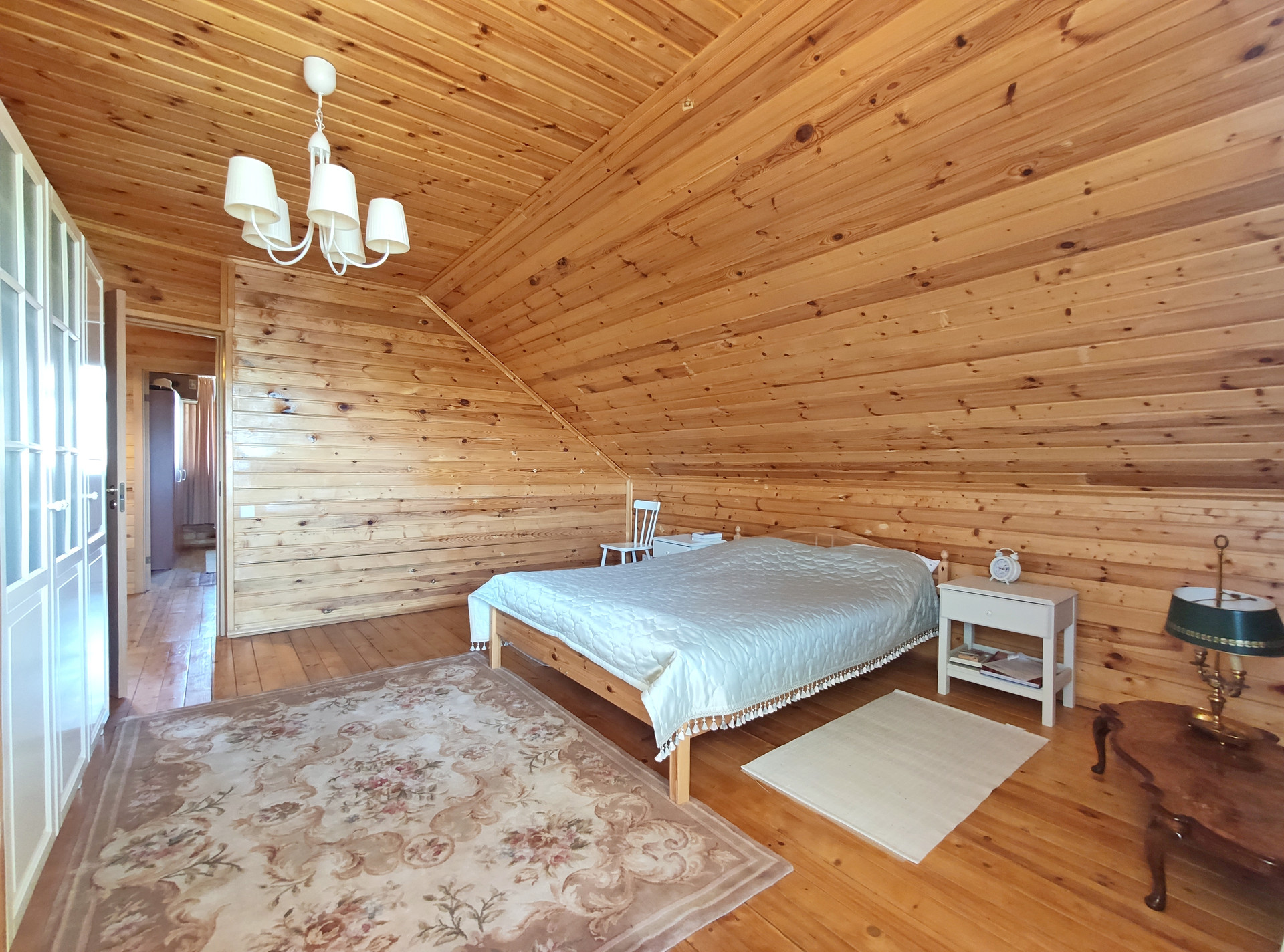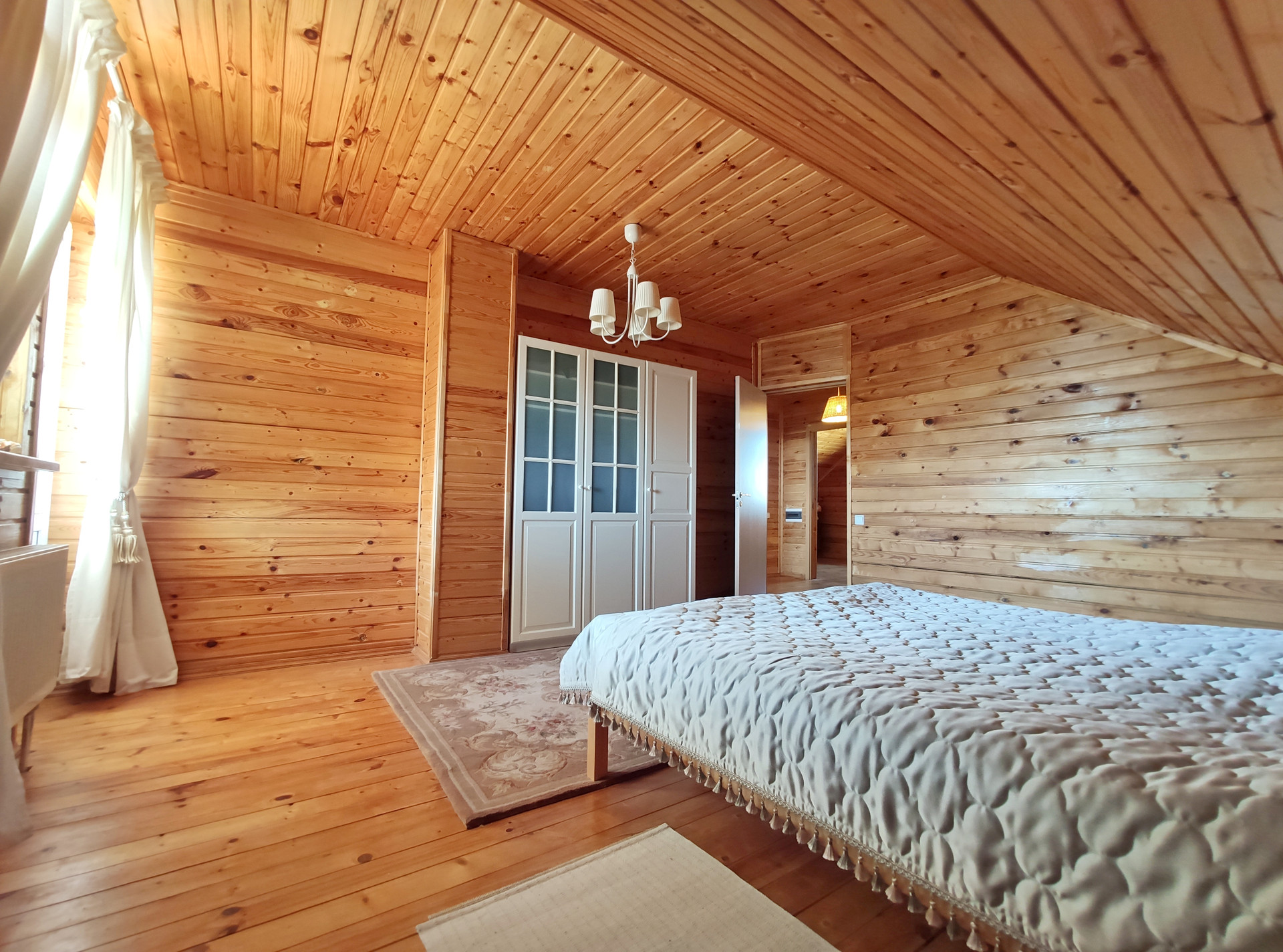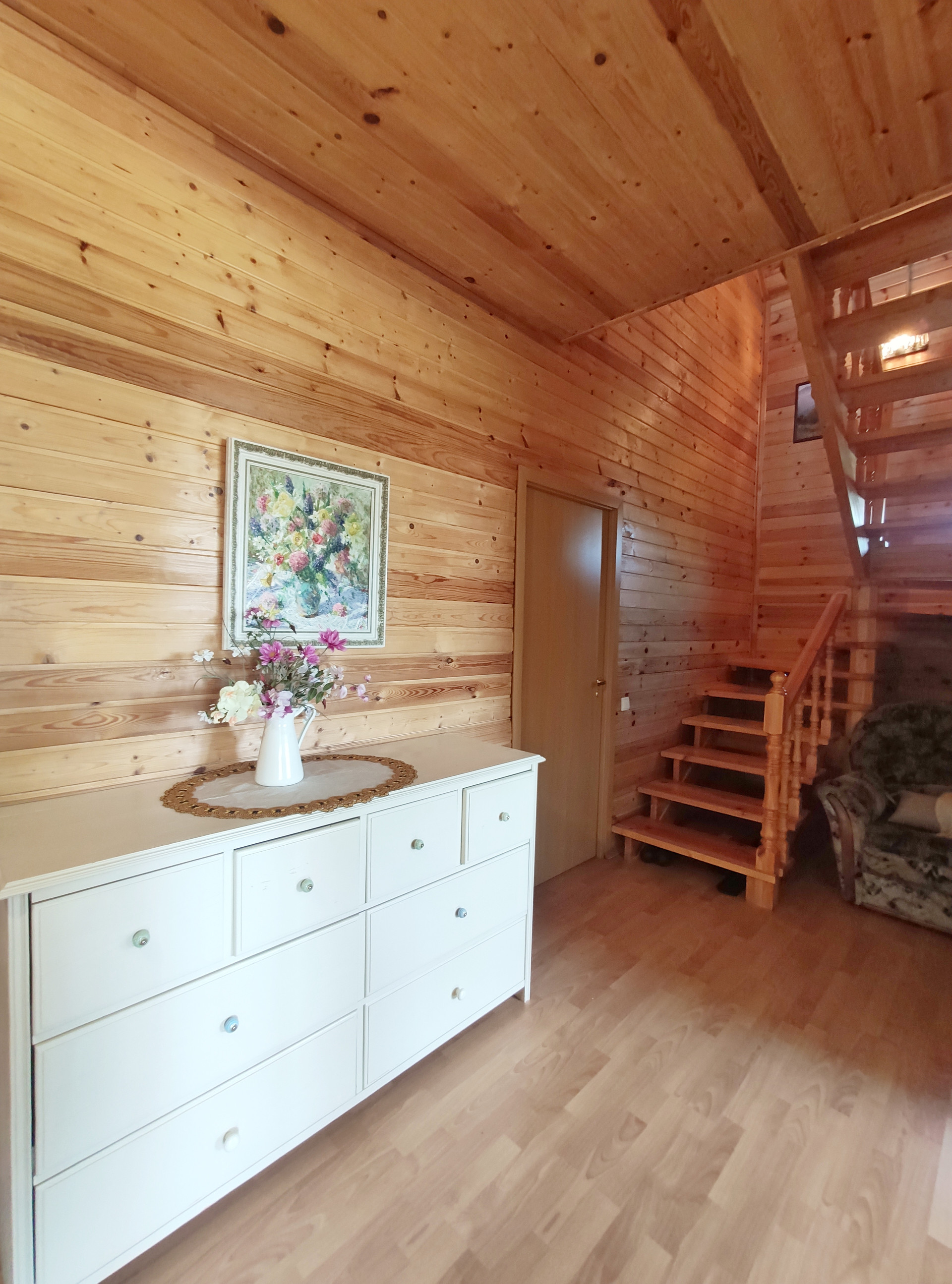 1 этаж: обои, 2 этаж: вагонка.