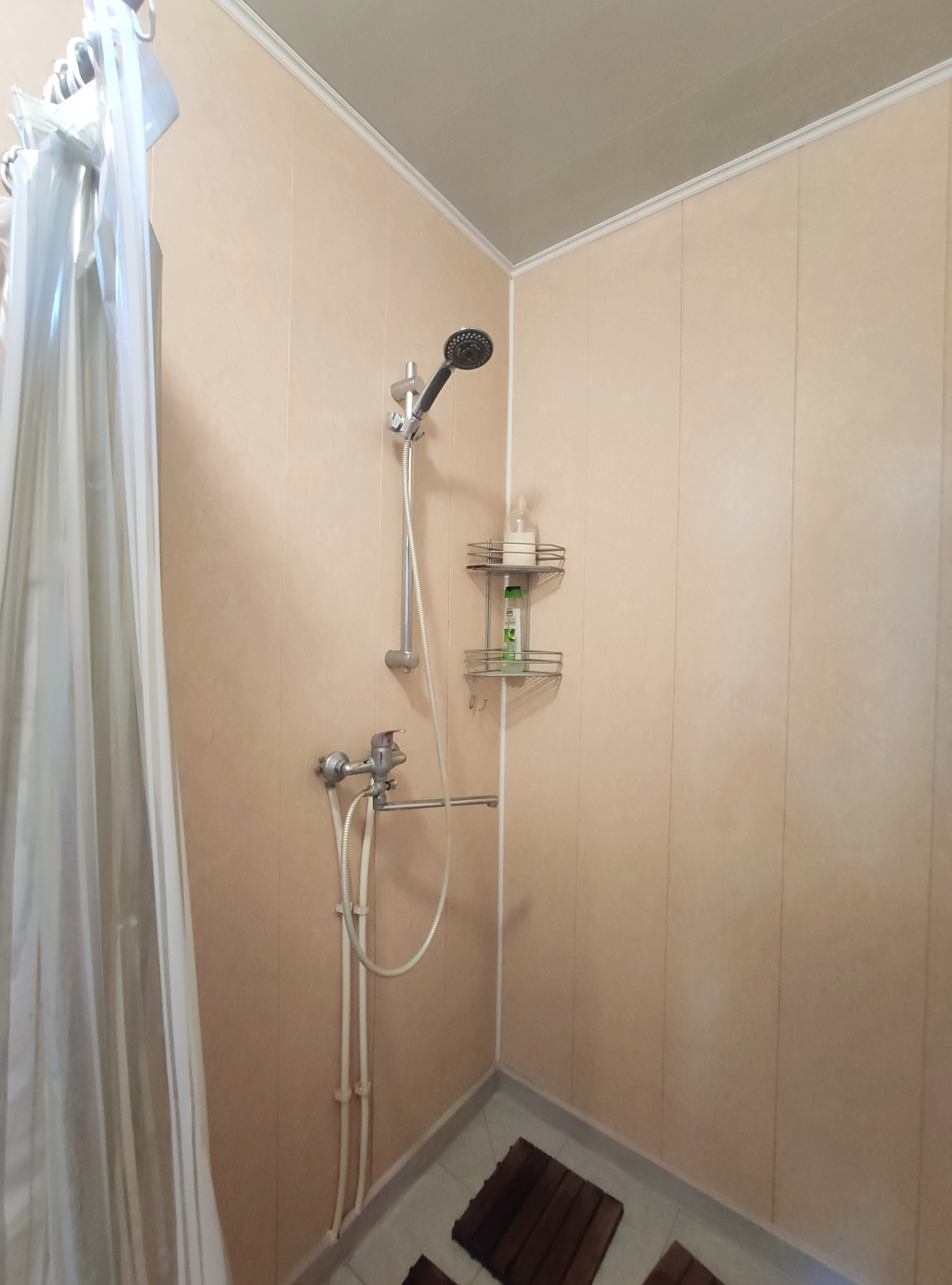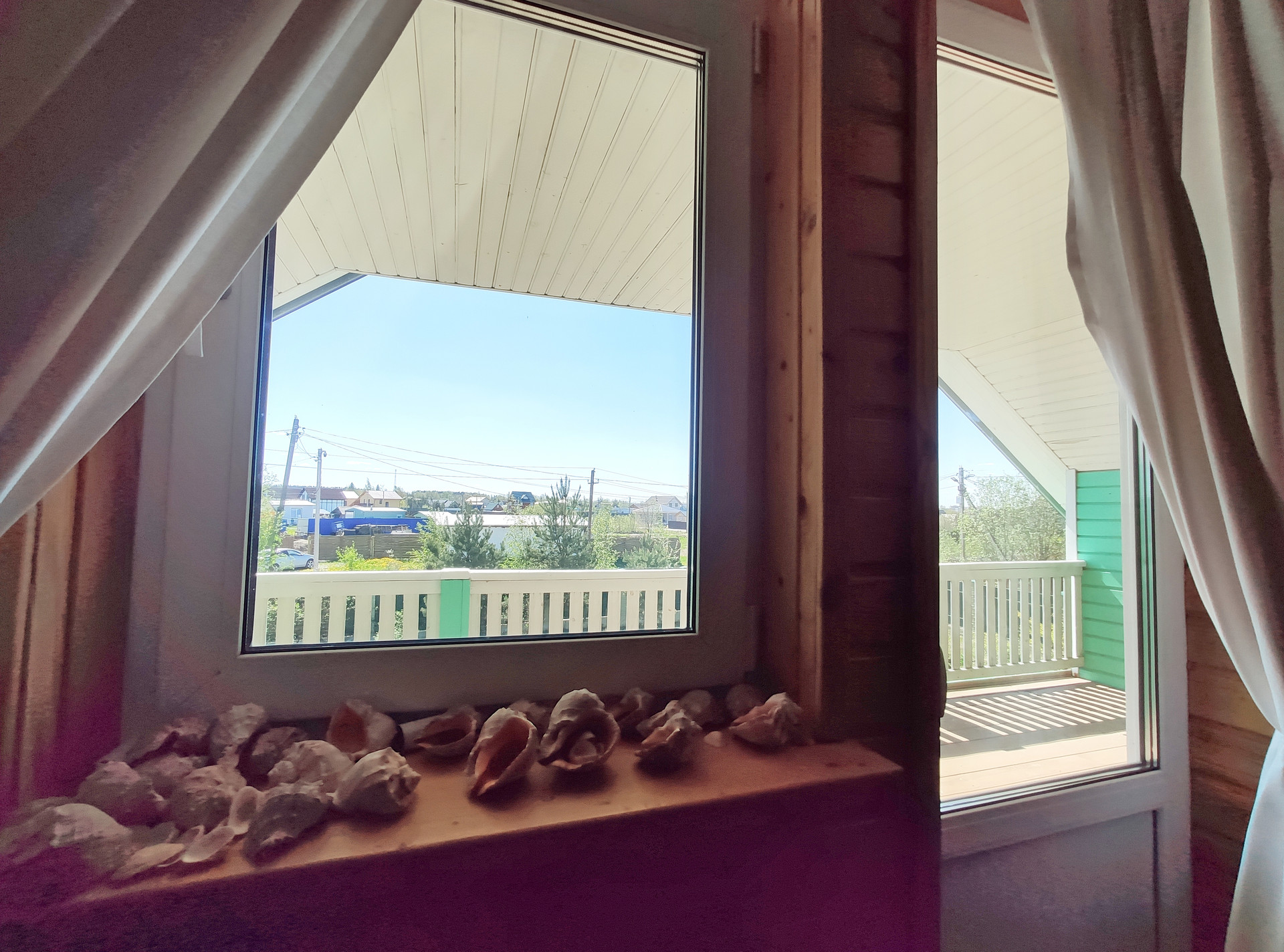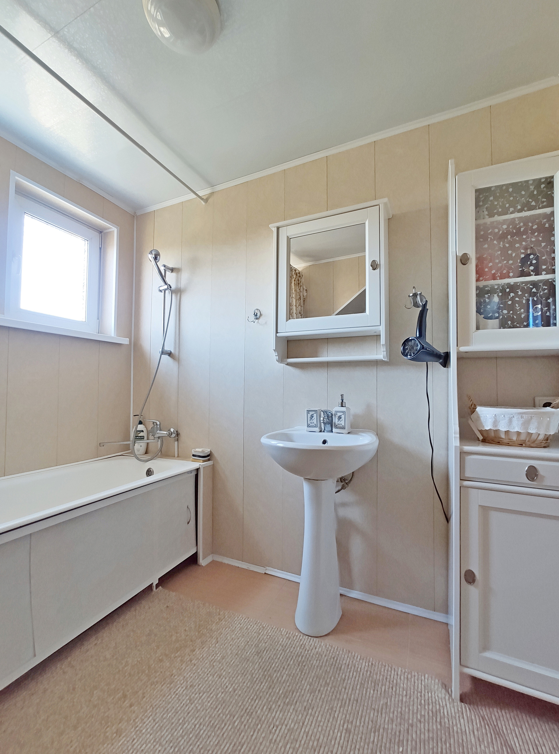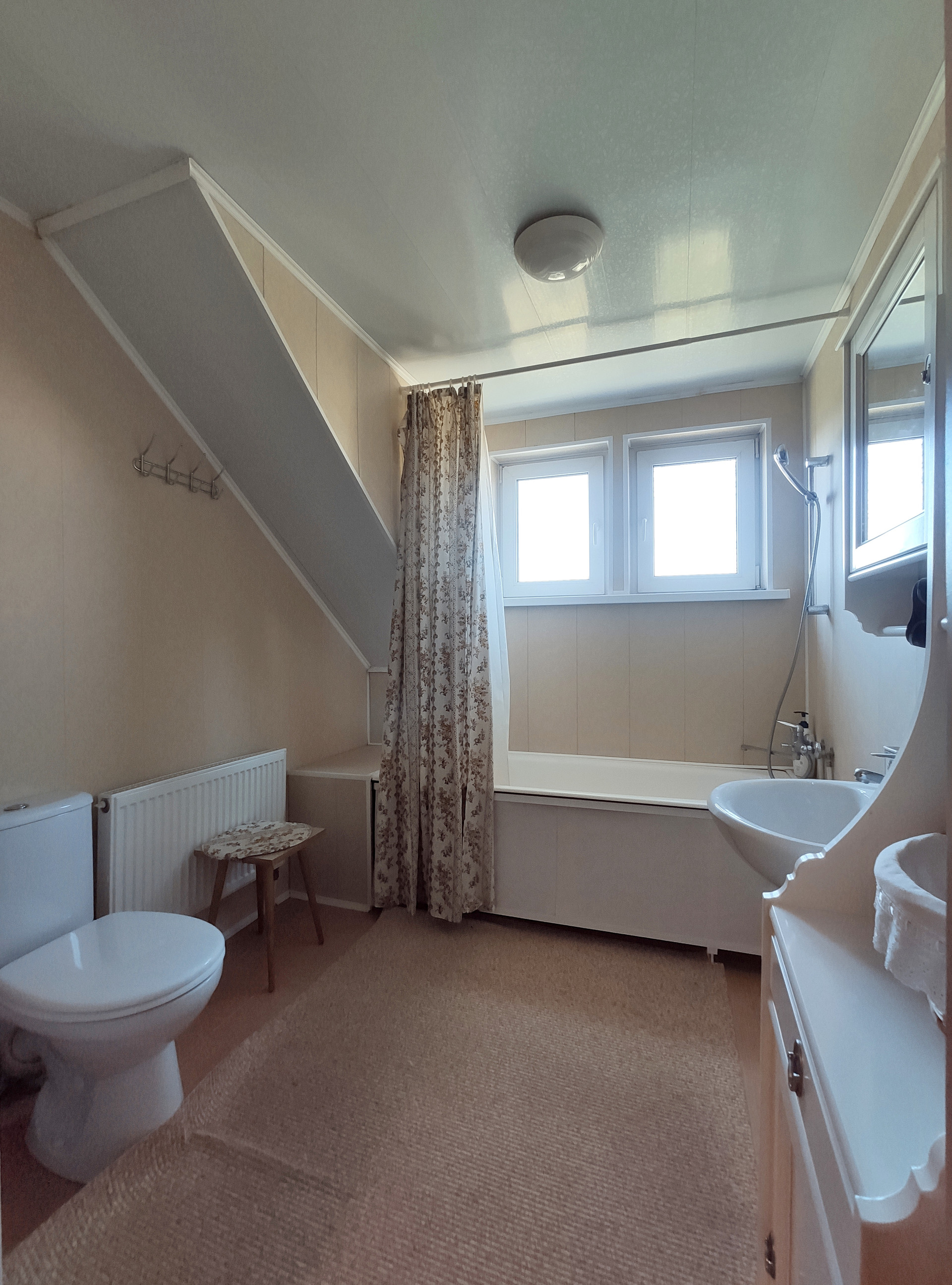 1 этаж: обои, 2 этаж: вагонка.