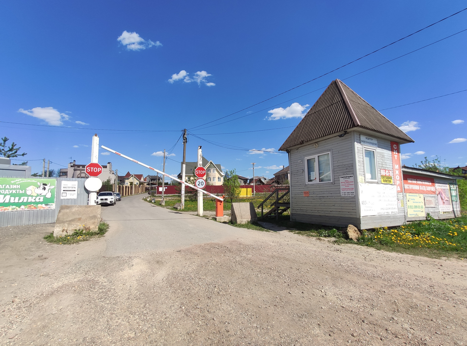 Территория посёлка охраняется, на въезде шлагбаум. К поселку от основной трассы ведет ровная асфальтированная дорога.