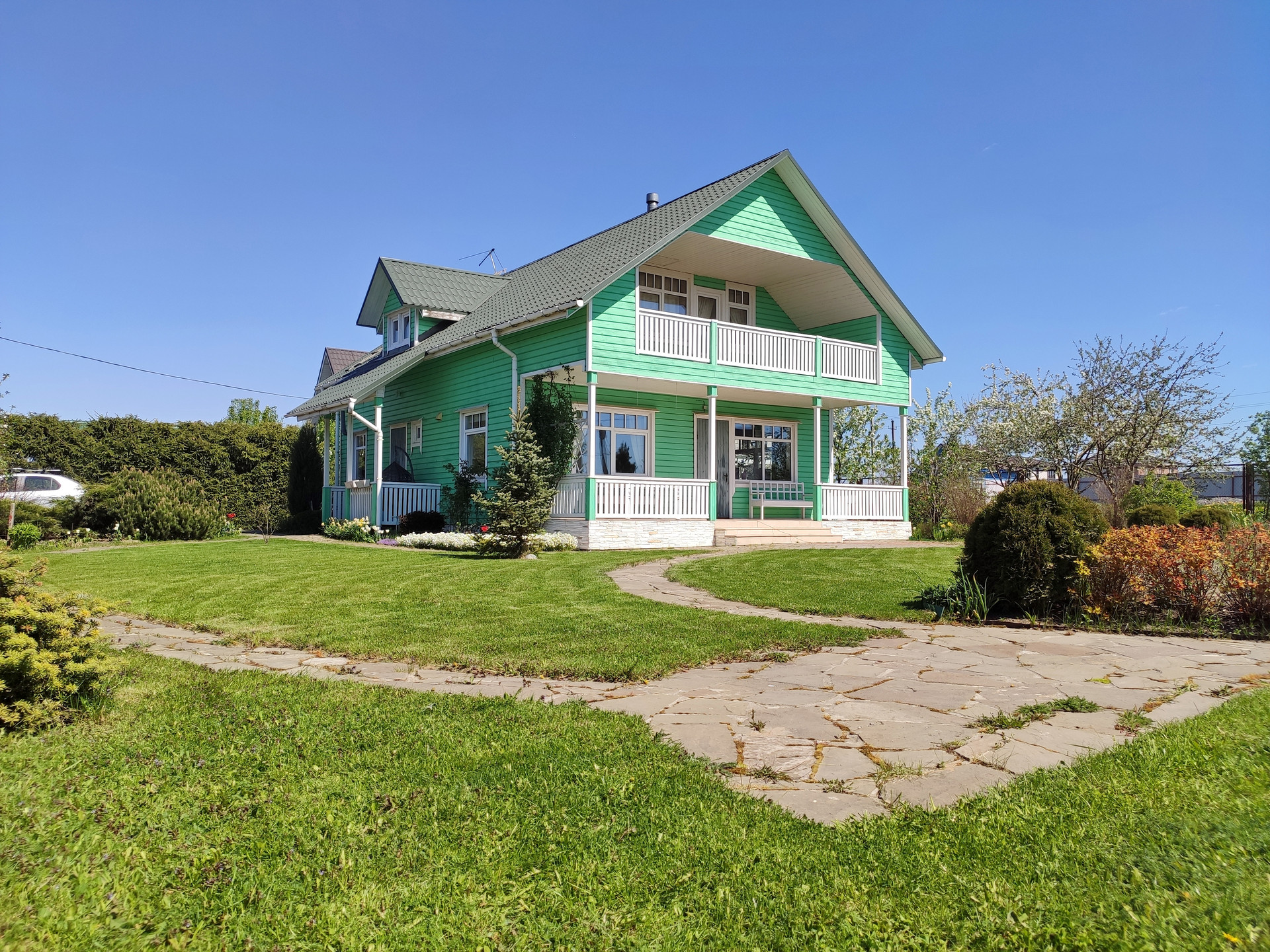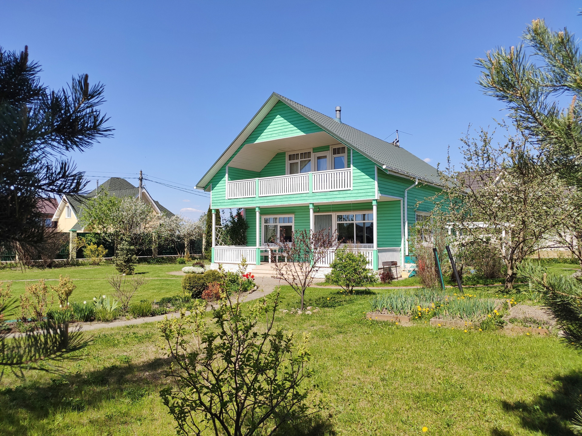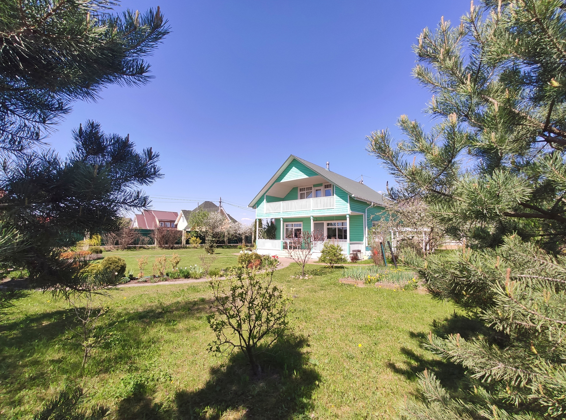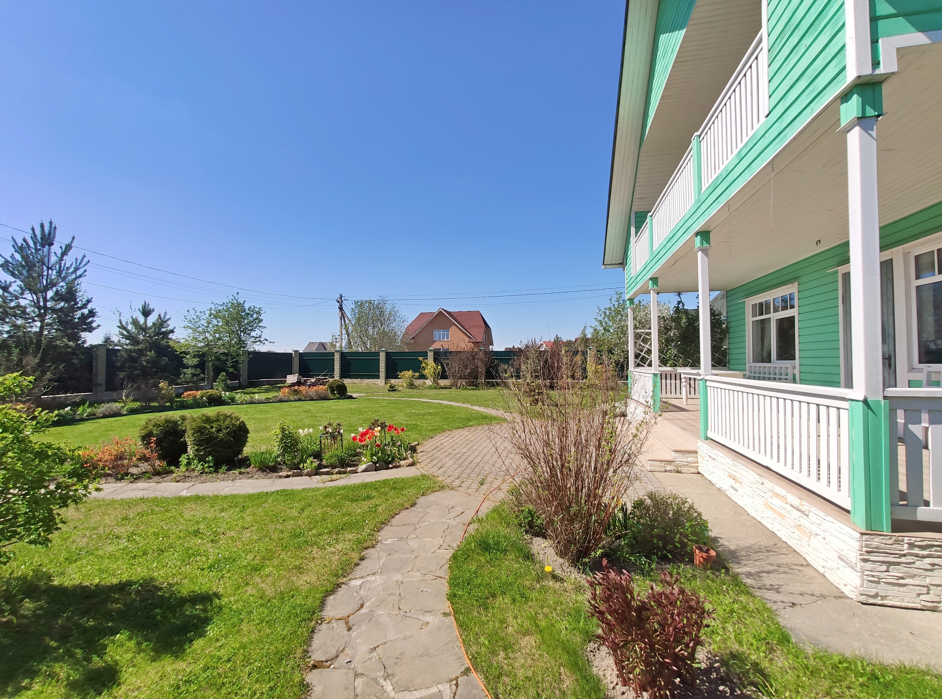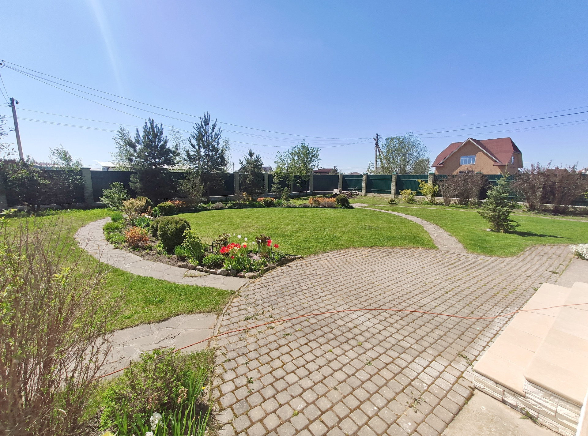 Участок разработан (ландшафтный дизайн): газон, цветочные клумбы, хвойные и плодово-ягодные растения.