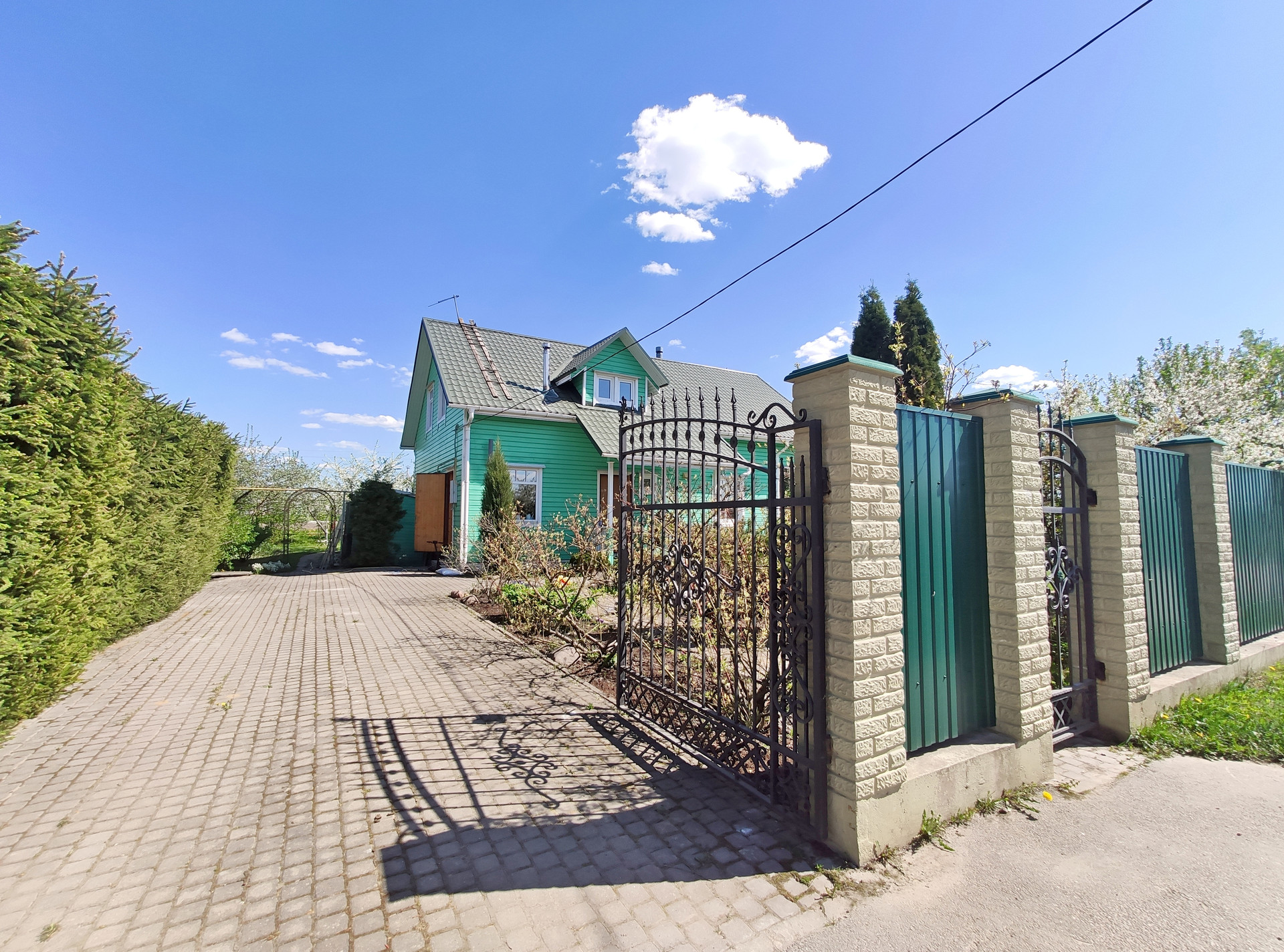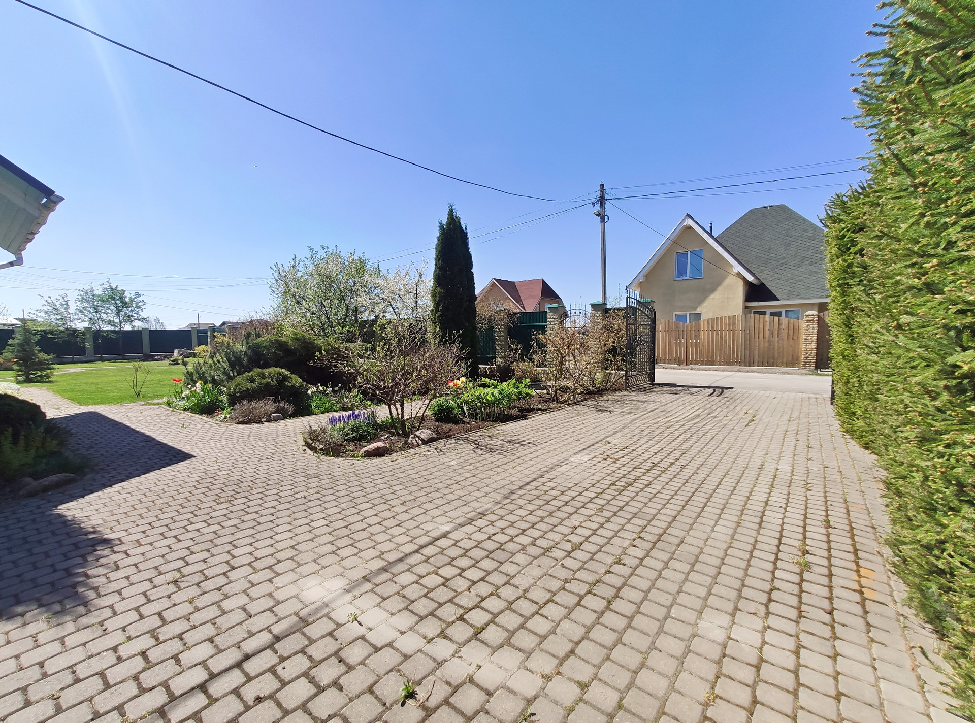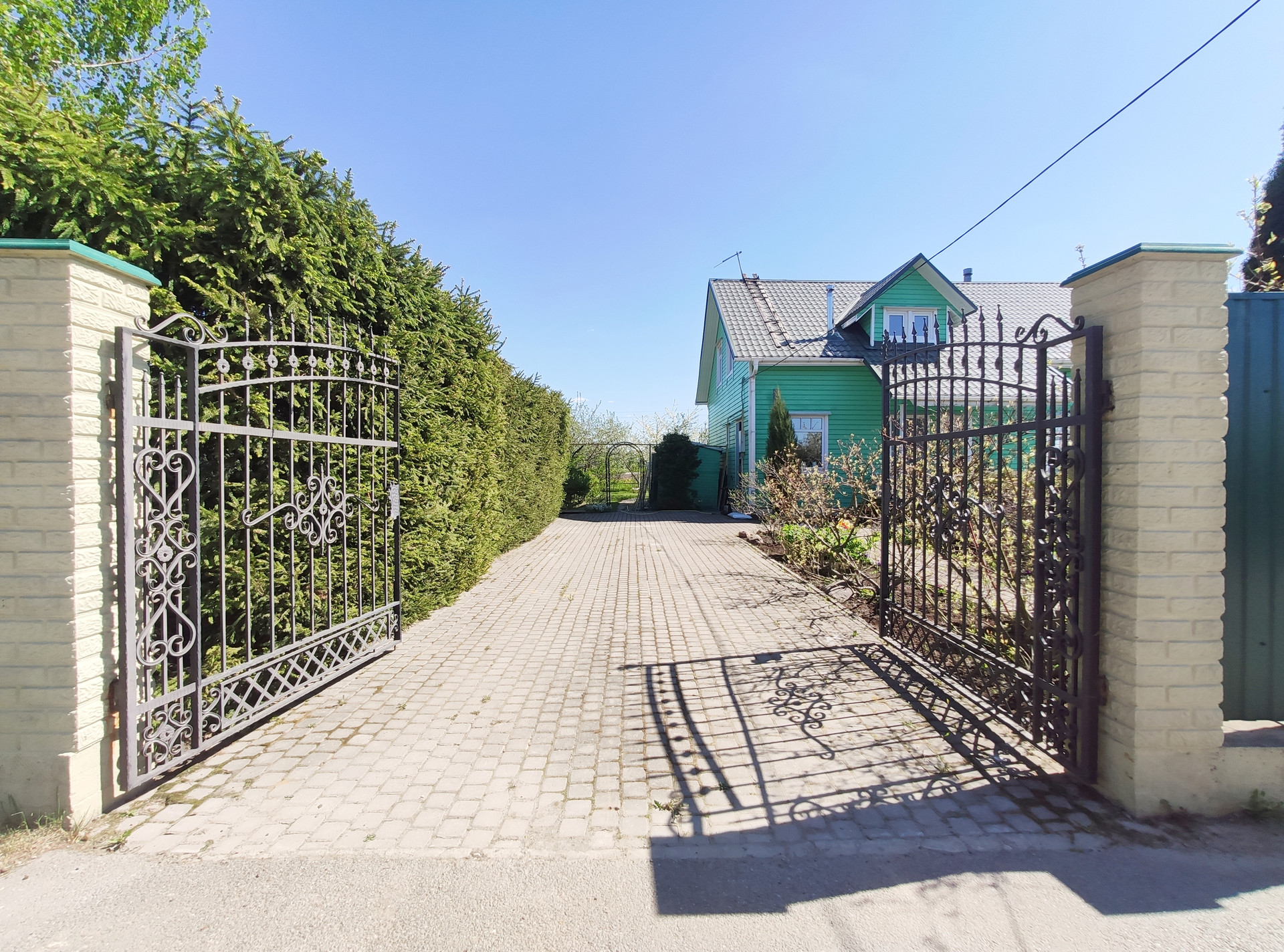 Въезд: кованые ворота. Просторное парковочное место для двух машин.