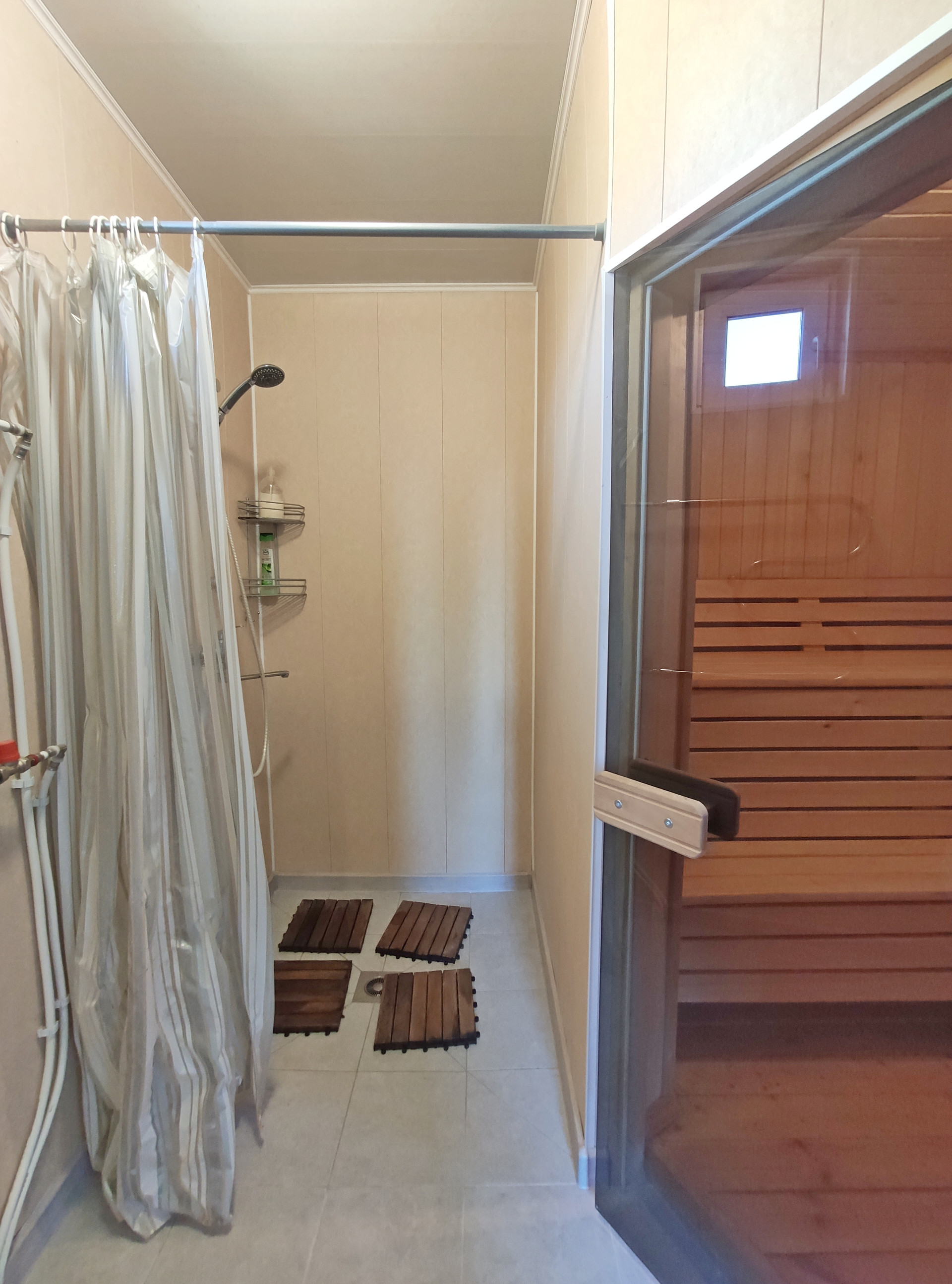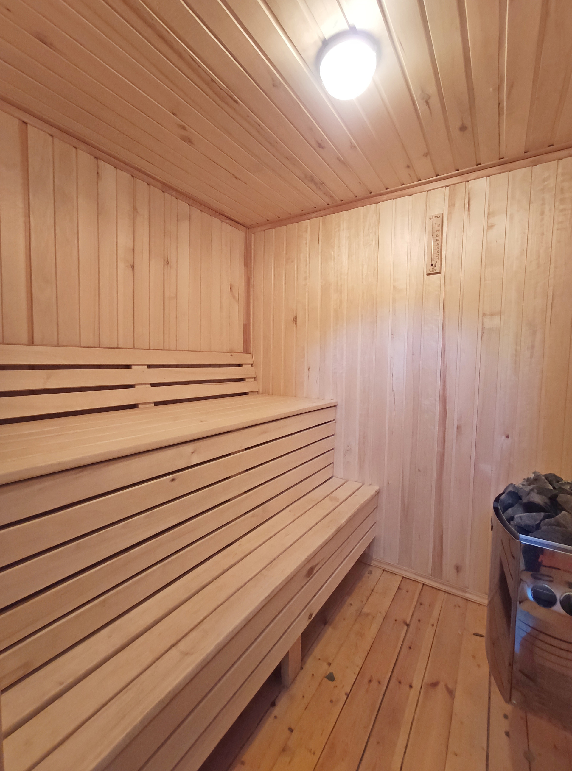 1 этаж: прихожая, гостиная и кухня-гостиная с выходом на террасу, спальня, котельная, санузел, сауна с душевой.
