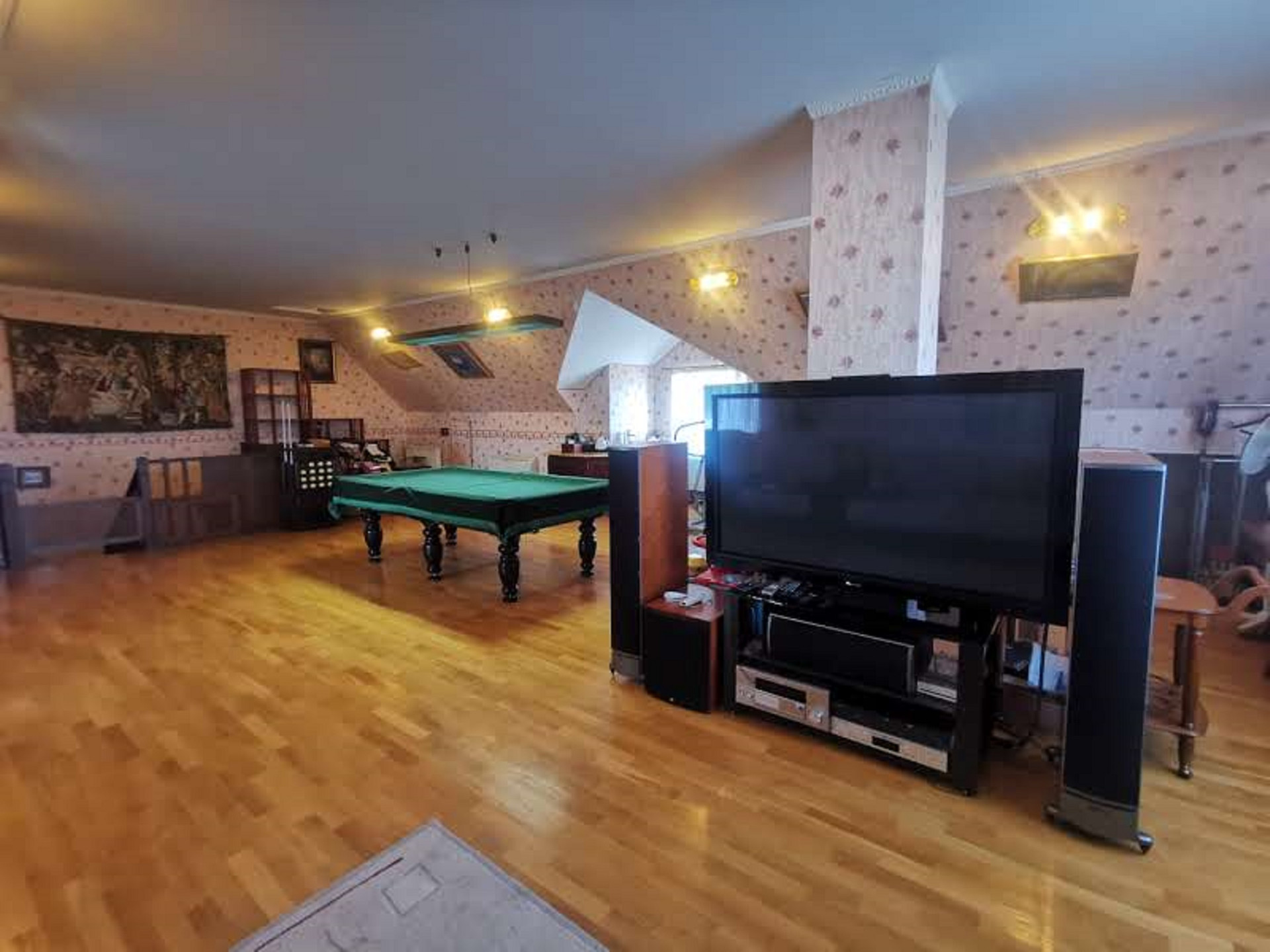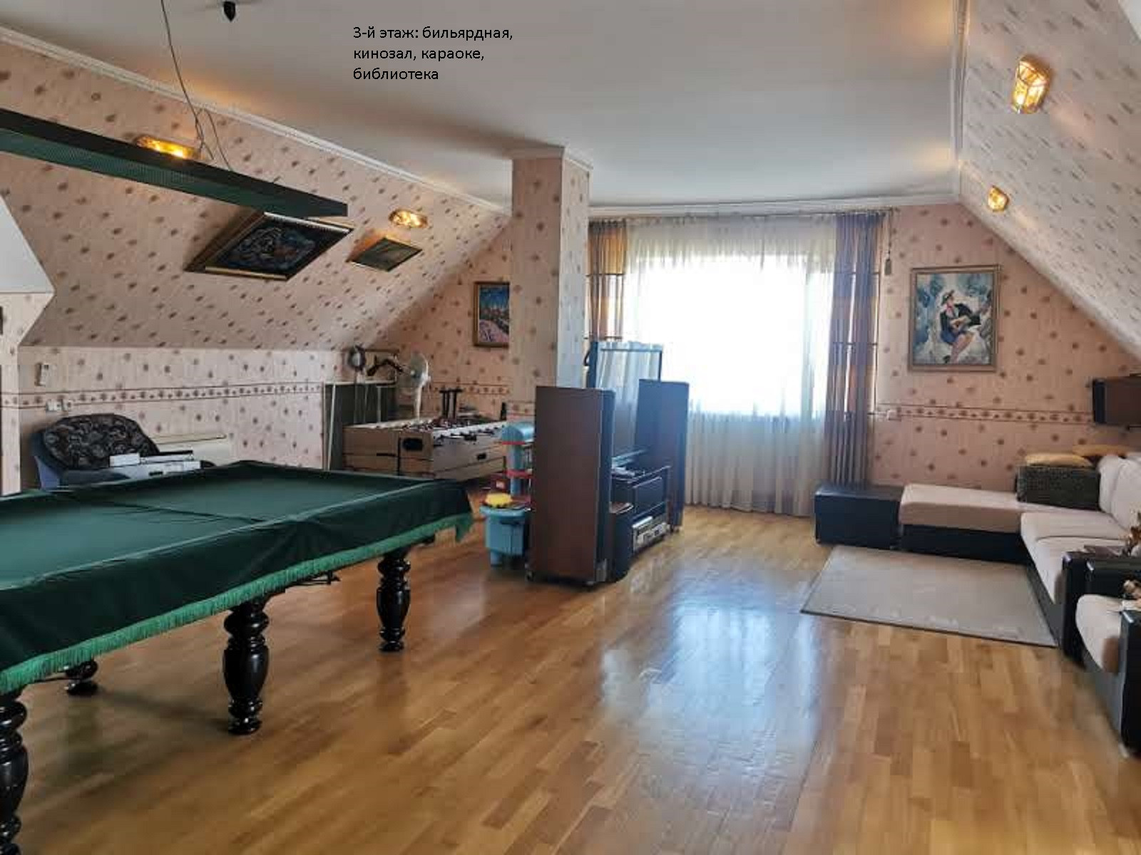 Пространство для отдыха open space, зонировано на бильярдную, игровую, кинозал с караоке, библиотека. Имеется кухонный уголок с раковиной и посудомоечной машиной. Лестница имеет ограждение для детей. Выход на чердак для контроля коммуникаций.