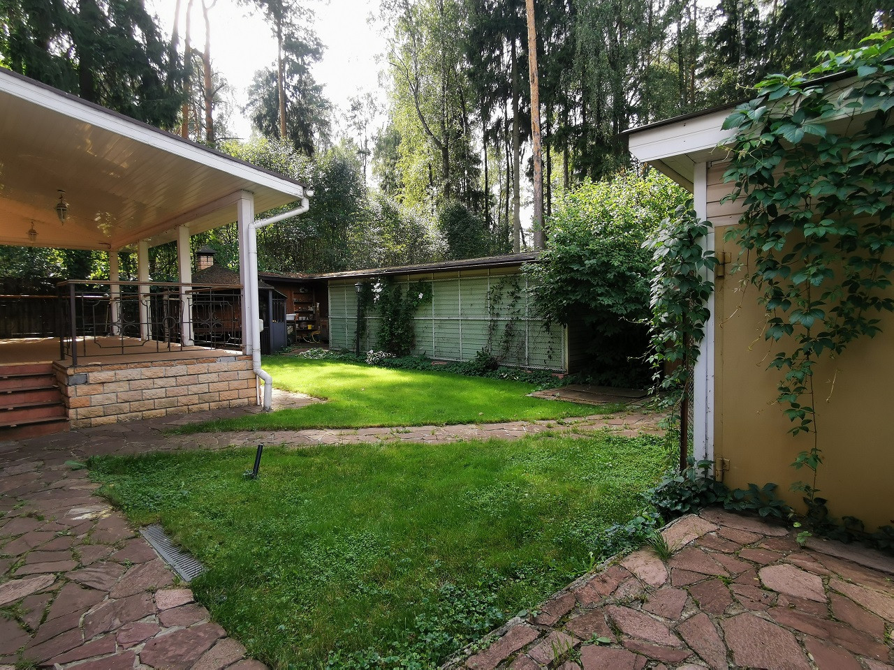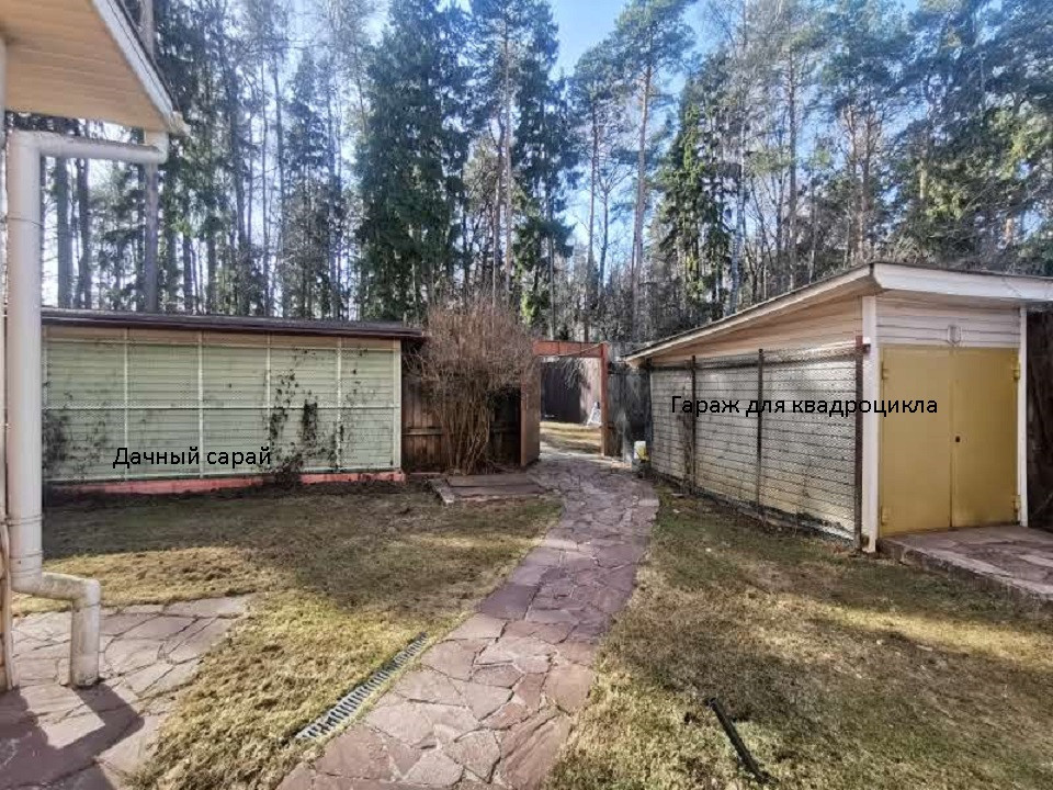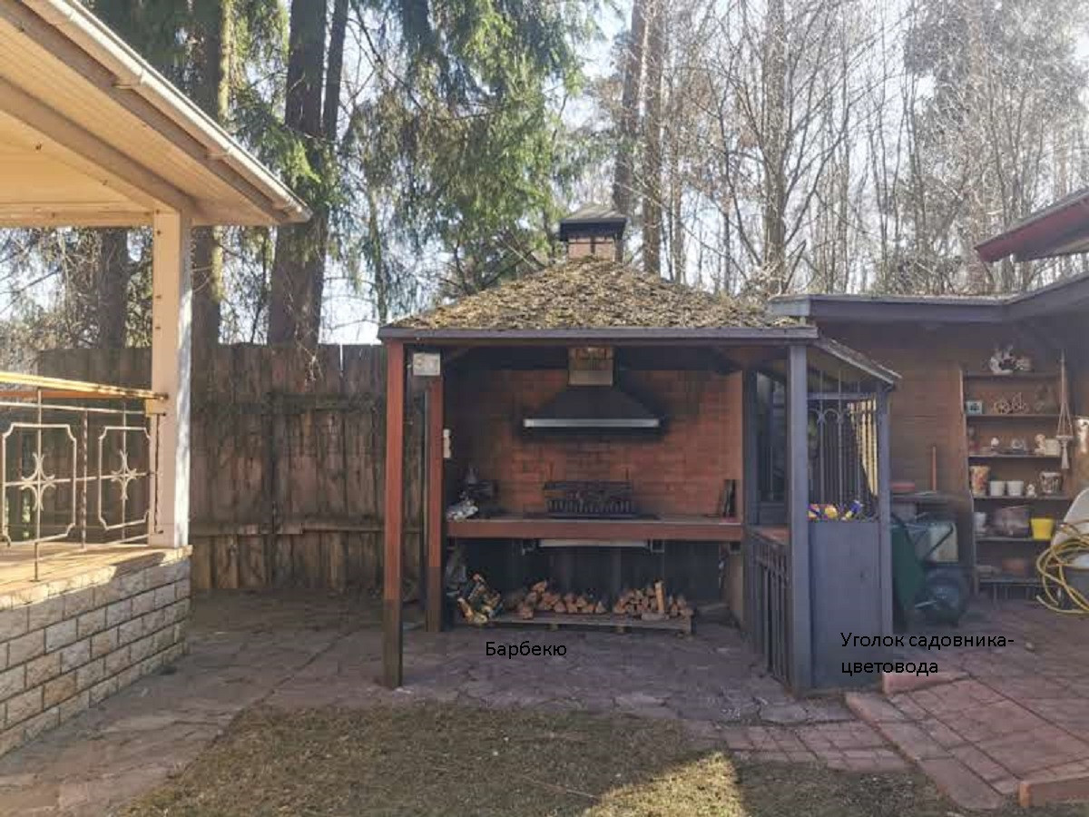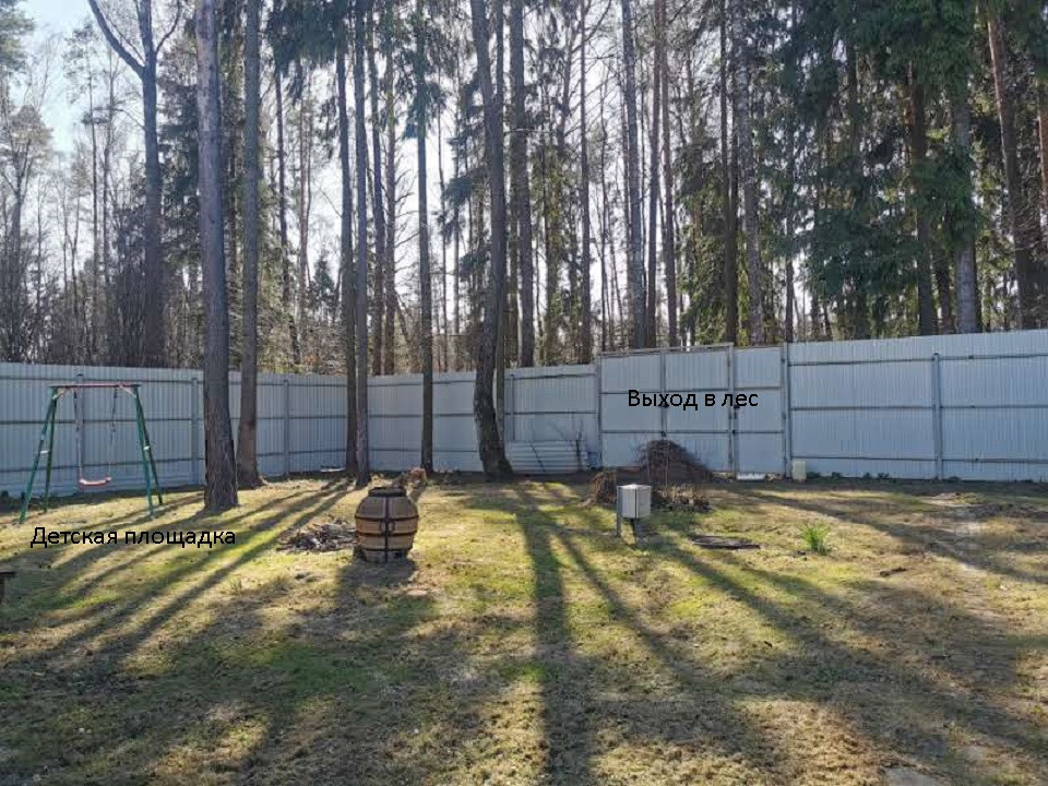 Парковка на 4 автомобиля, хоз.постройка, уголок садовода, гараж для квадроцикла, барбекю, детская площадка в лесу, скамейки, оборудованная компостная яма. По границе проходит газопровод.