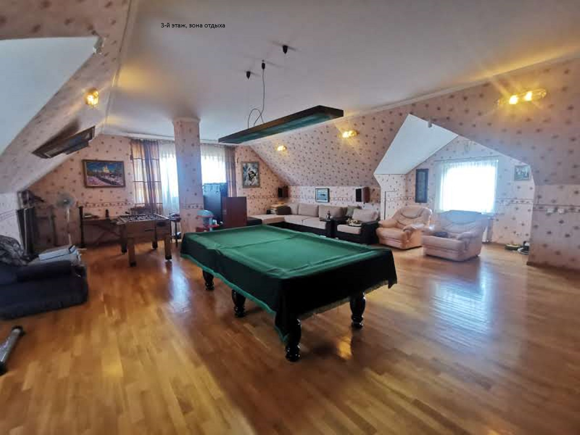 Пространство для отдыха open space, зонировано на бильярдную, игровую, кинозал с караоке, библиотека. Имеется кухонный уголок с раковиной и посудомоечной машиной. Лестница имеет ограждение для детей. Выход на чердак для контроля коммуникаций.