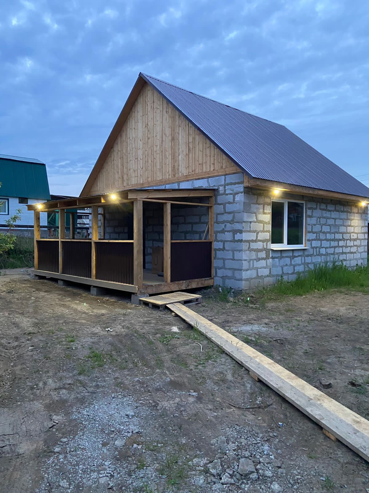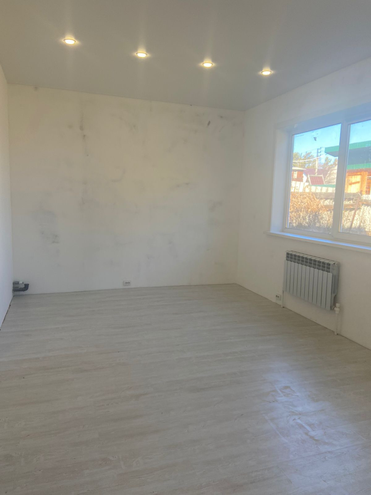 На 1 этаже : большая гостинная - кухня, комната, сан/узел, болерная, коридор, веранда.
