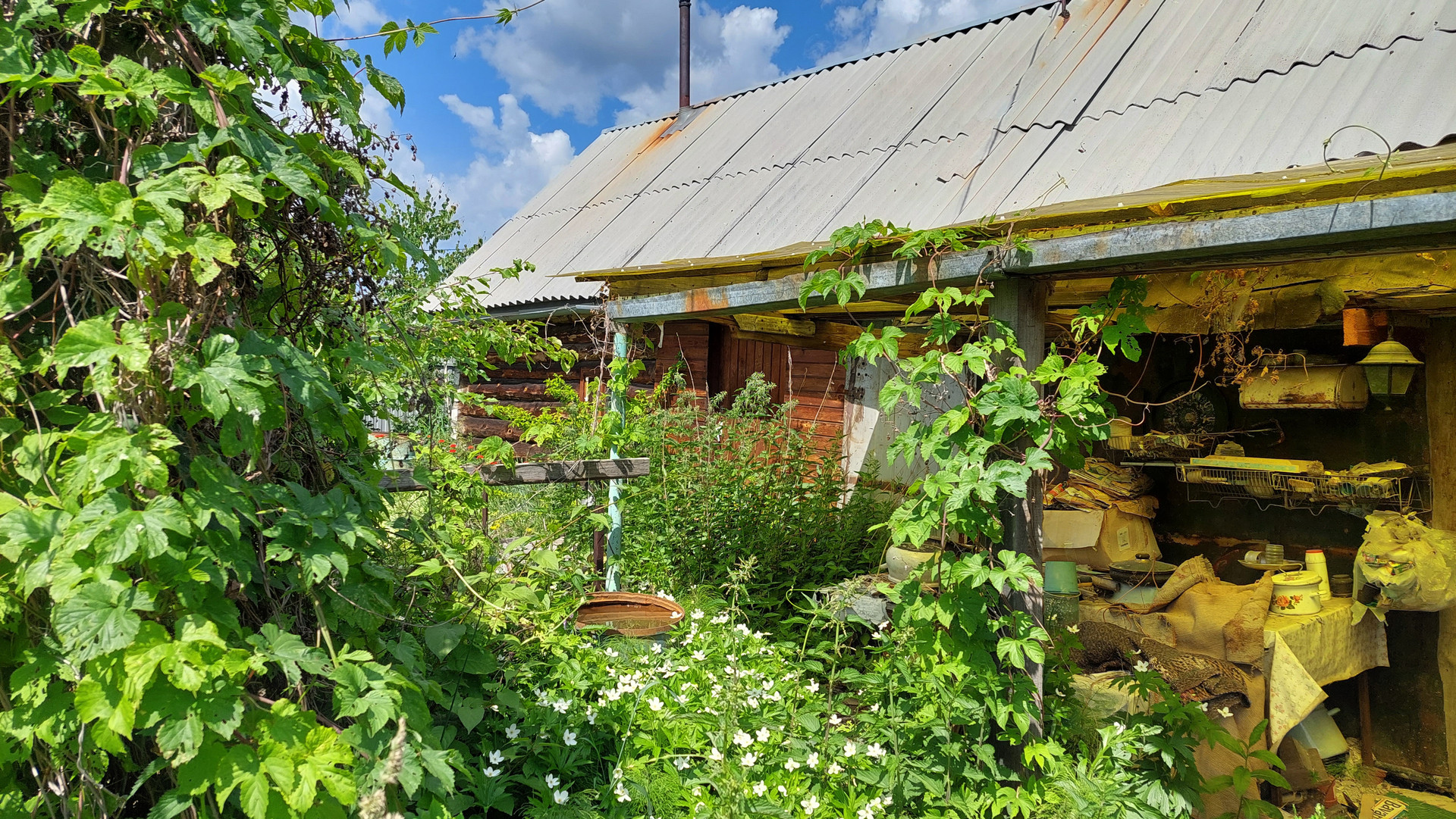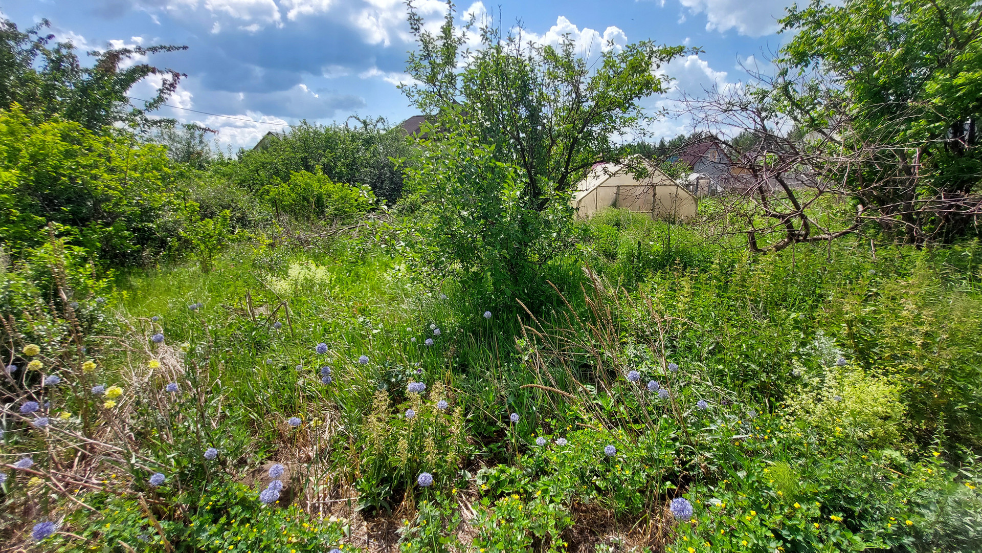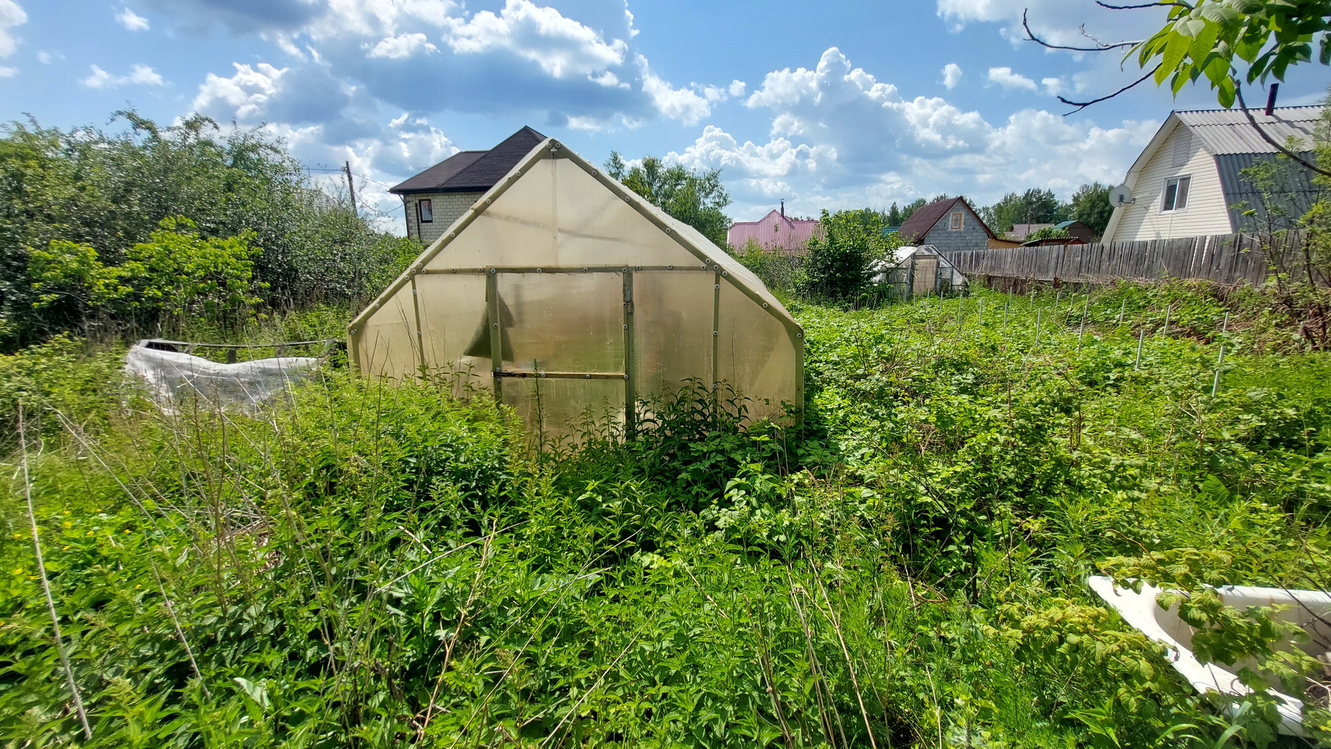 Две теплицы из металлического уголка и поликарбоната. Есть вместительный сарай для хранения инвентаря, и беседка которую нужно привести в порядок.