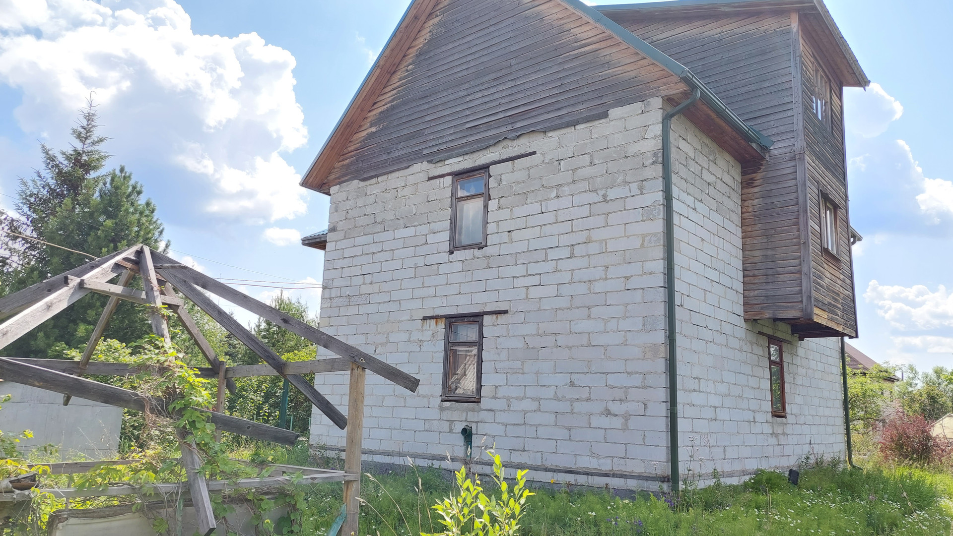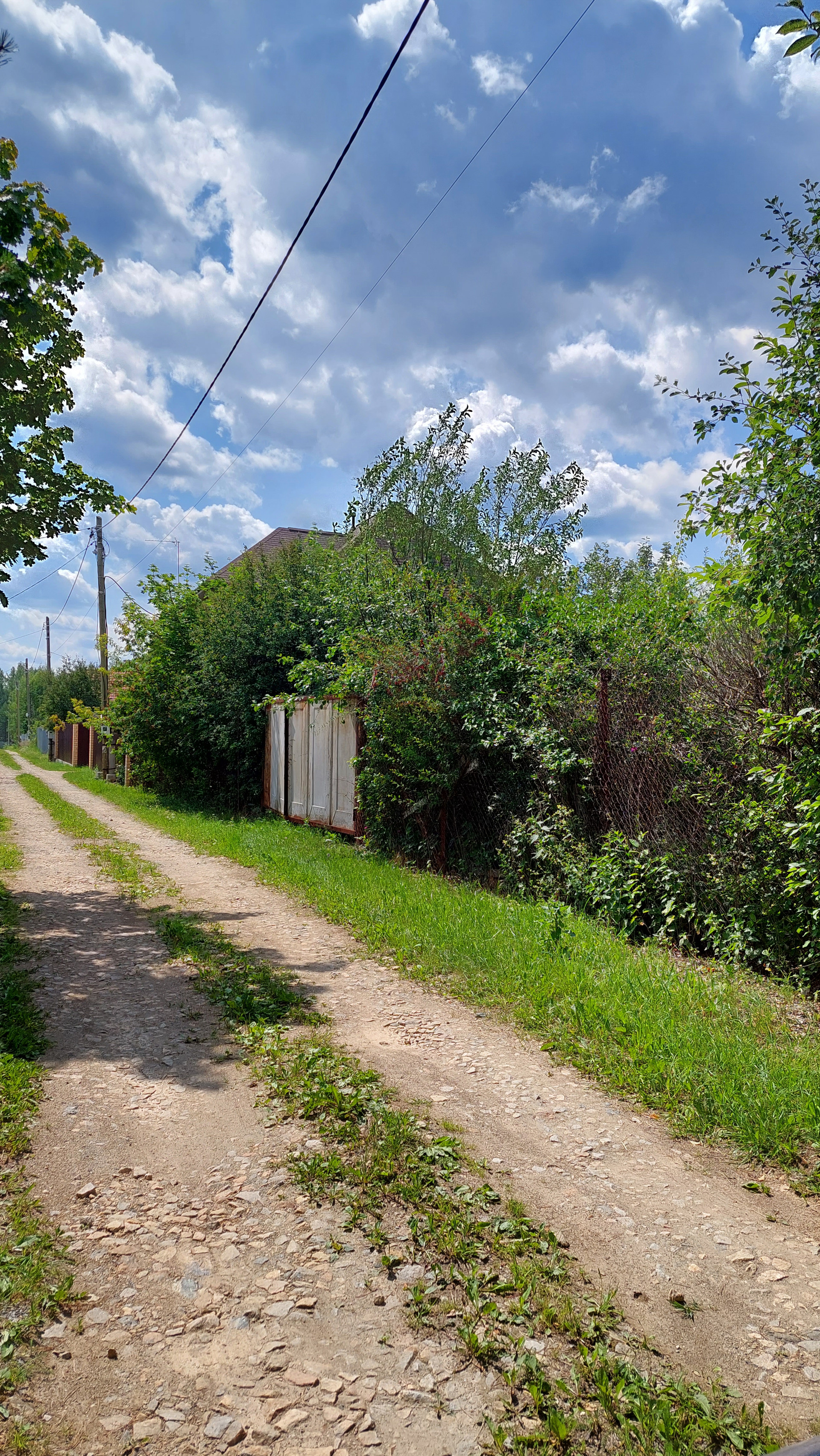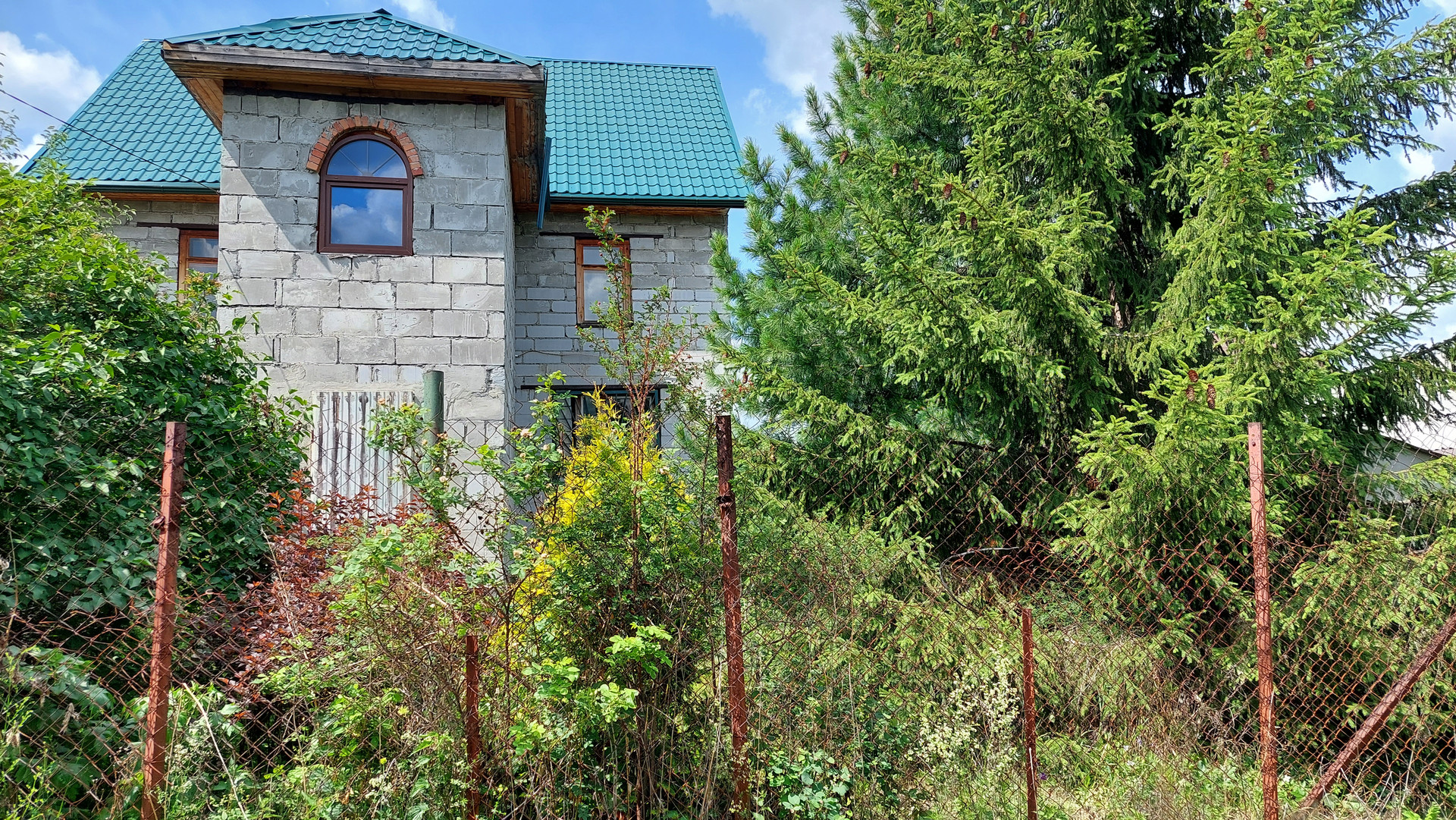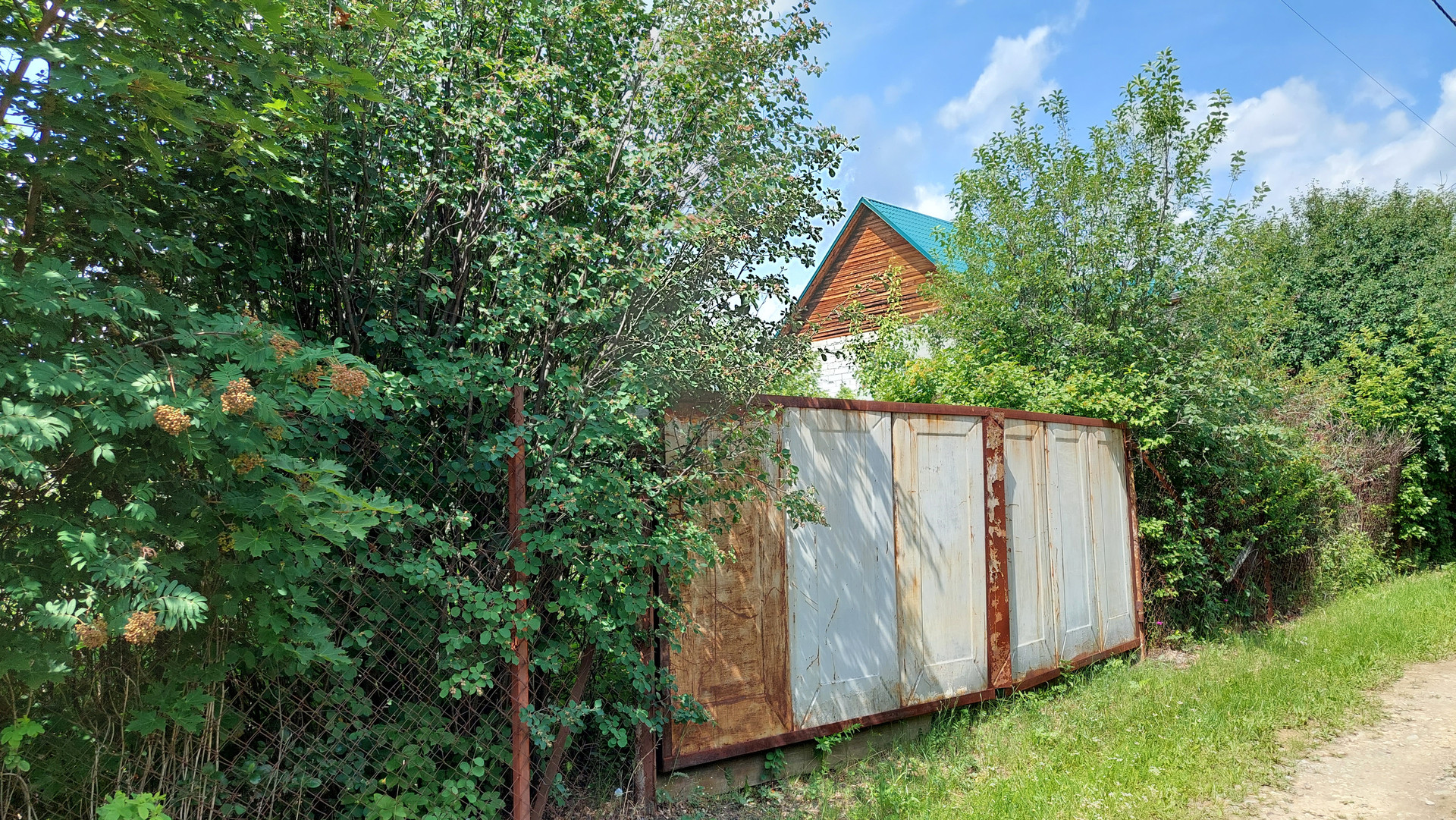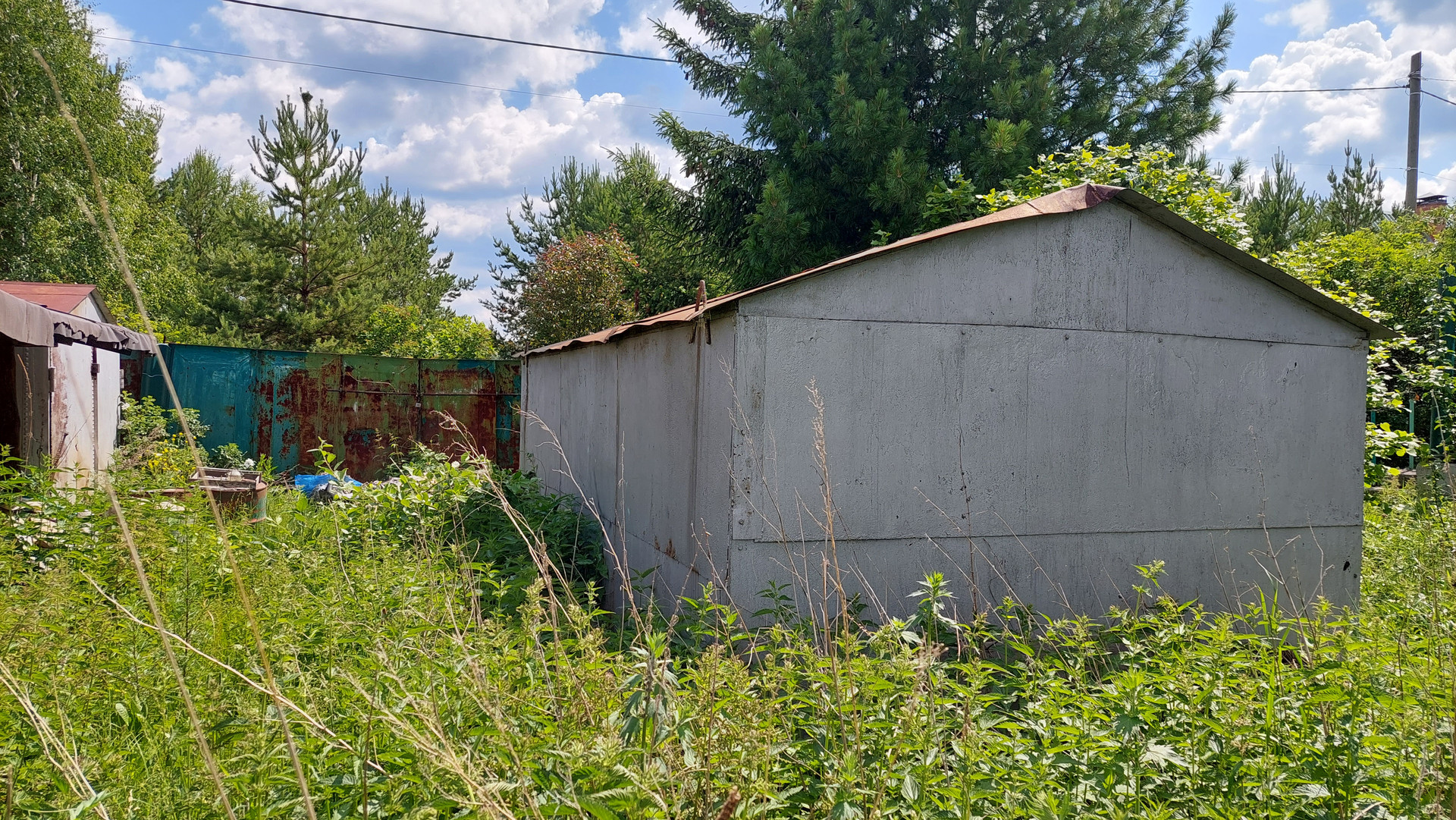 На участке два металлических гаража, двое металлических ворот - два въезда на территорию, много всякого строй материала ( кирпич, вагонка, поликарбонат, ..есть бассейн, качели на металлическом каркасе.