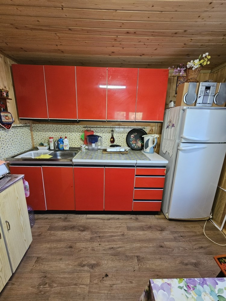 Летняя кухня построена из бревна и обшита сайдингом.В летней кухне душевая кабина с бойлером,заведена вода,установлен кухонный гарнитур.Вся мебель остается. На участке плодовые деревья,сосны.Выход в лес.Установлен новый забор из профлиста.Прекрасное, тихое место.
