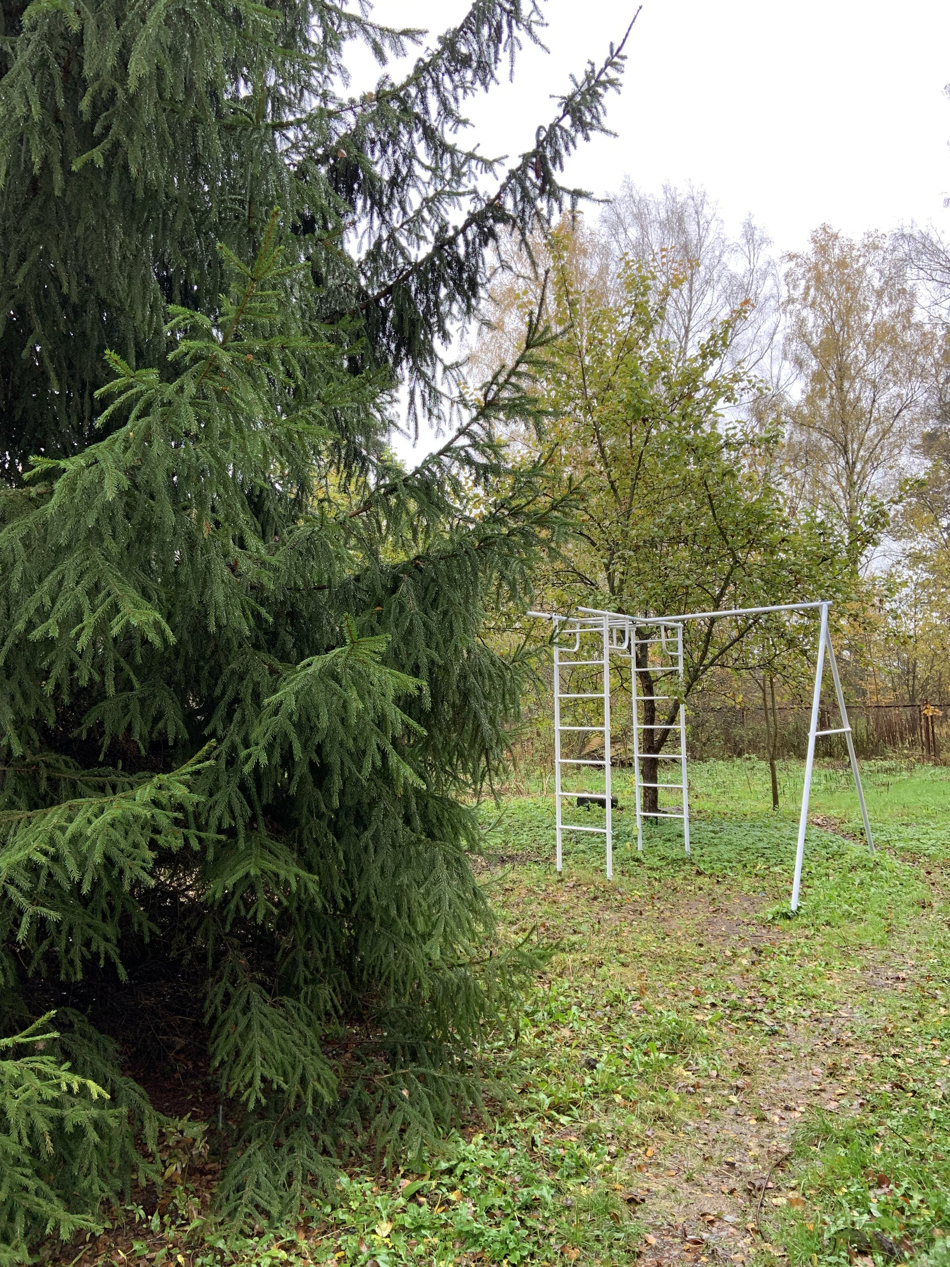 На участке прекрасная елка, плодовые деревья, спорт уголок