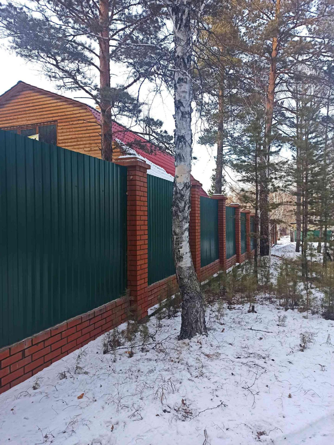 Участок обнесён забором из профлиста на фундаменте, большие ворота с 2-х сторон.