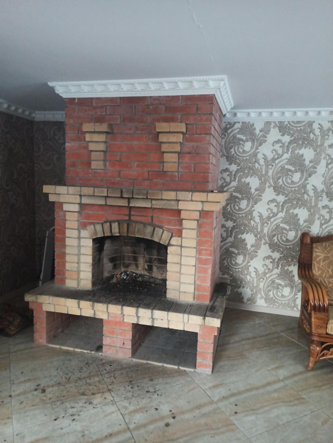 Камин на 1 этаже из красного кирпича, топится дровами.