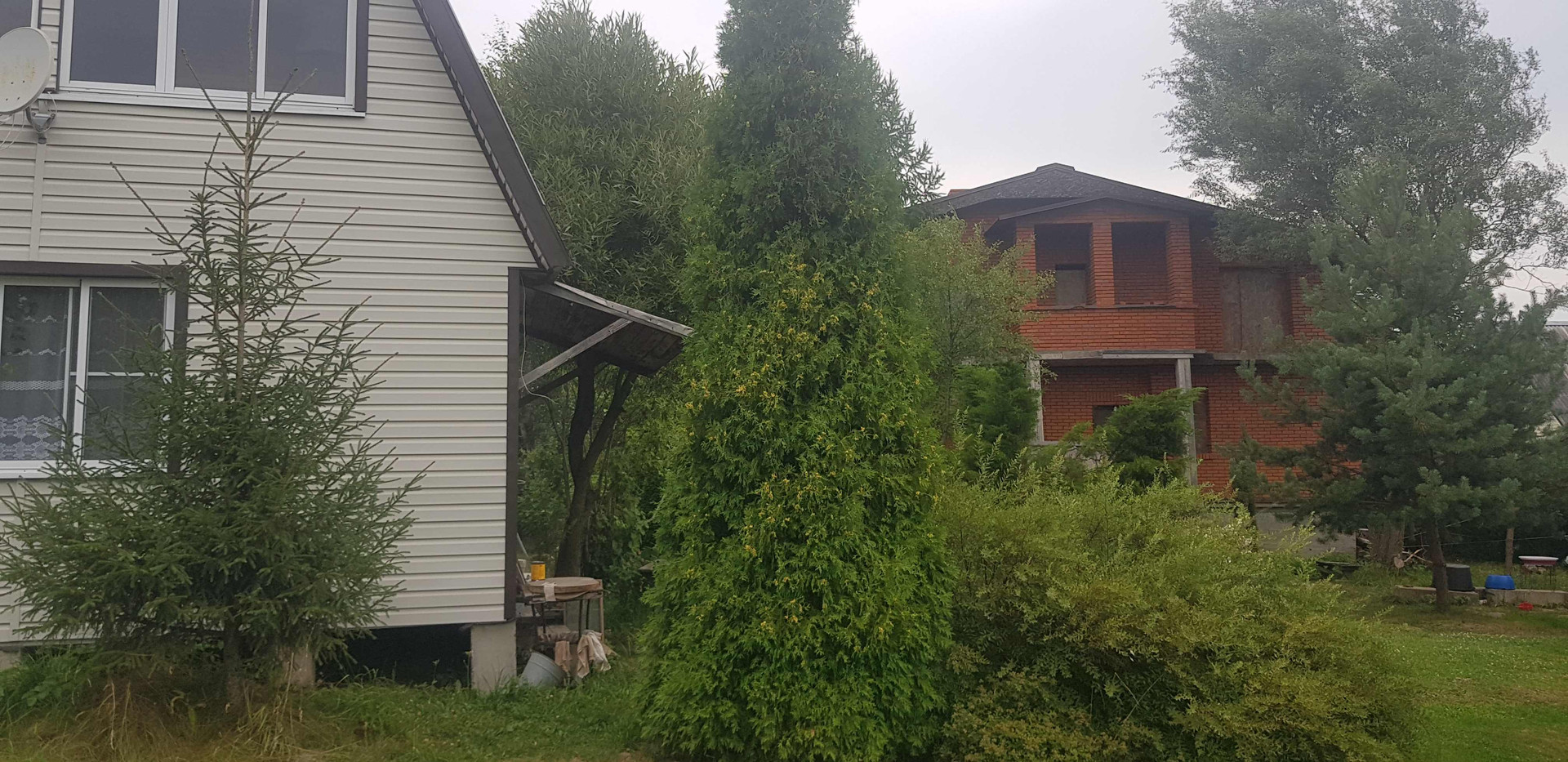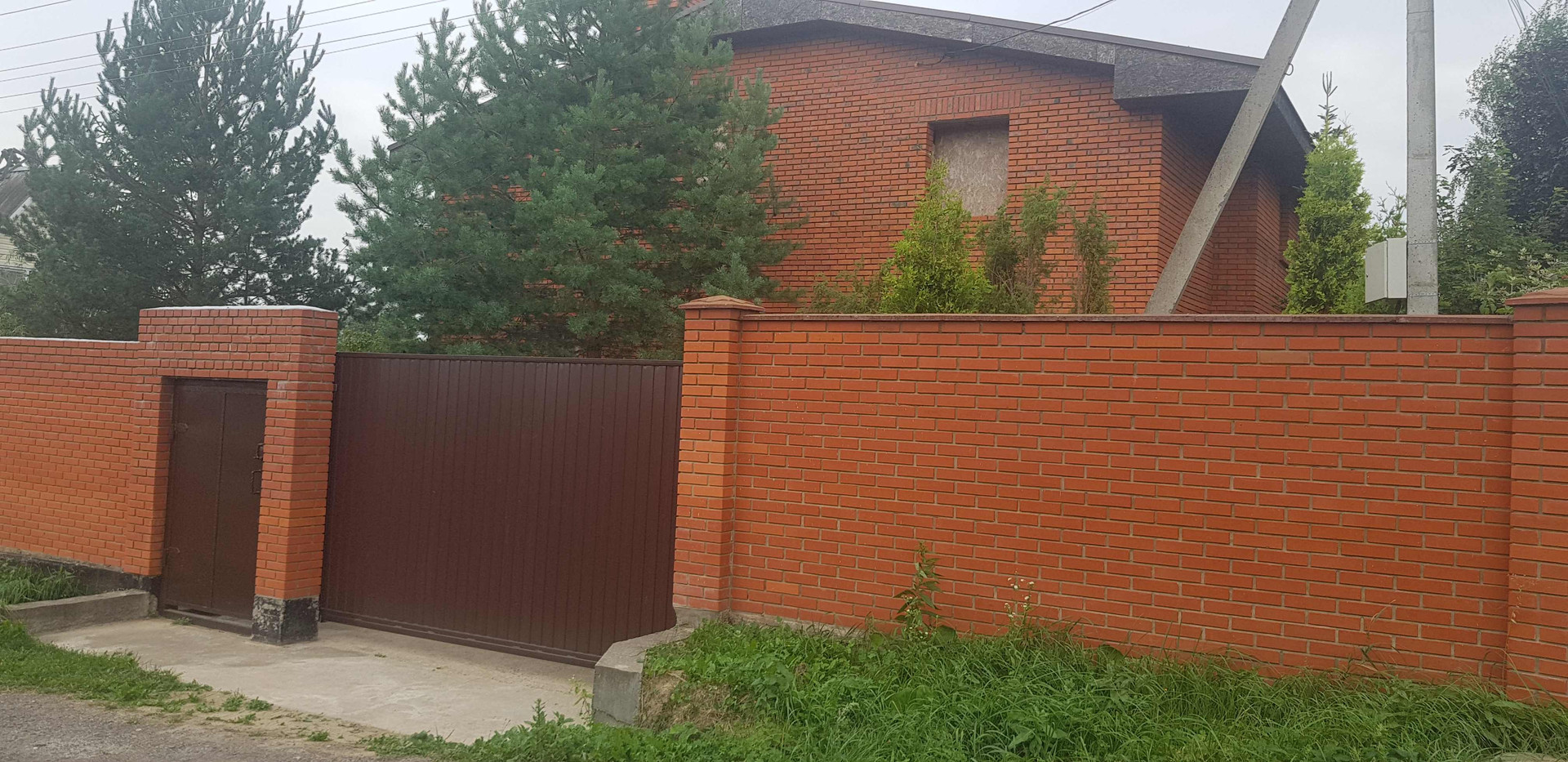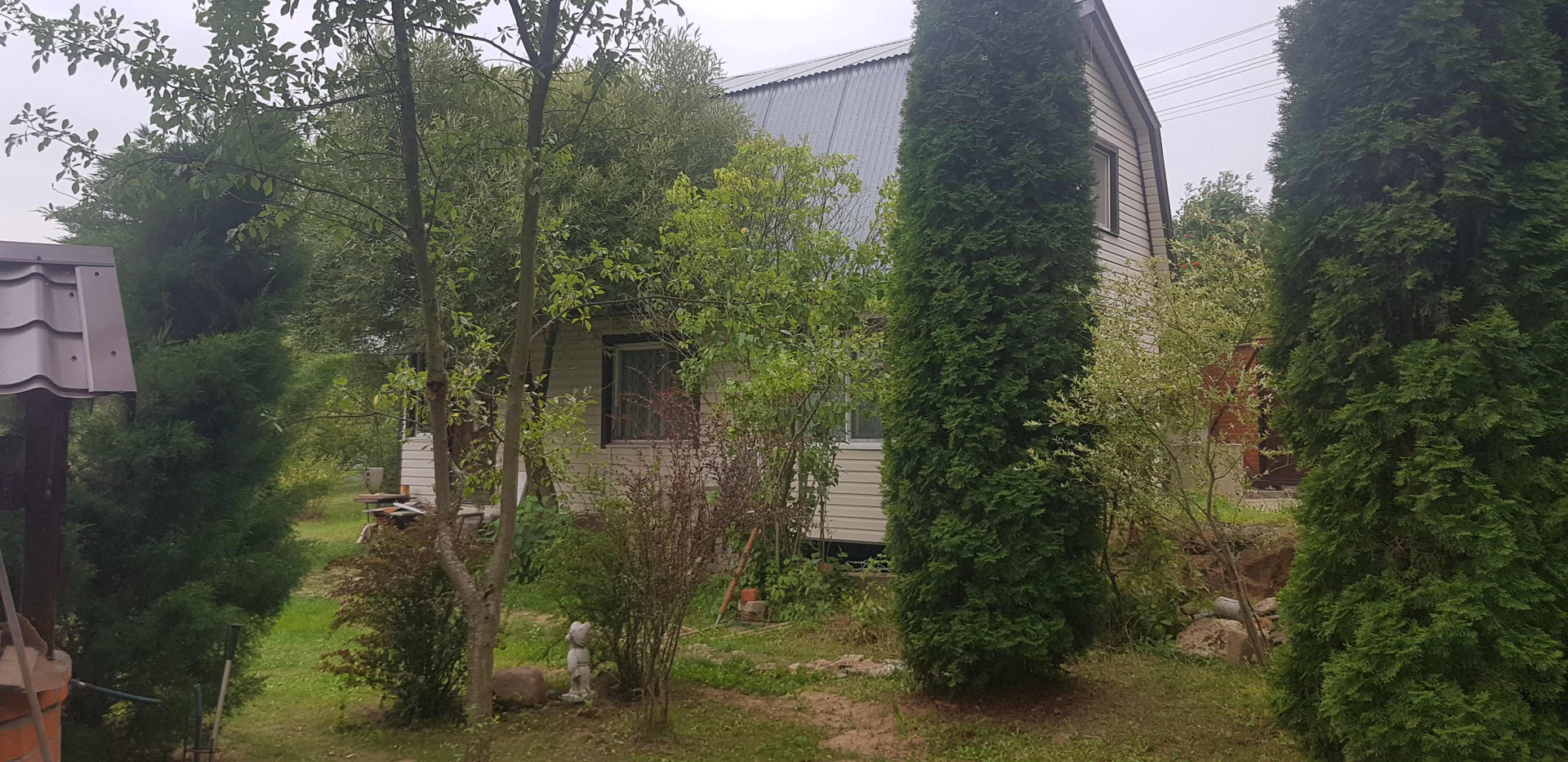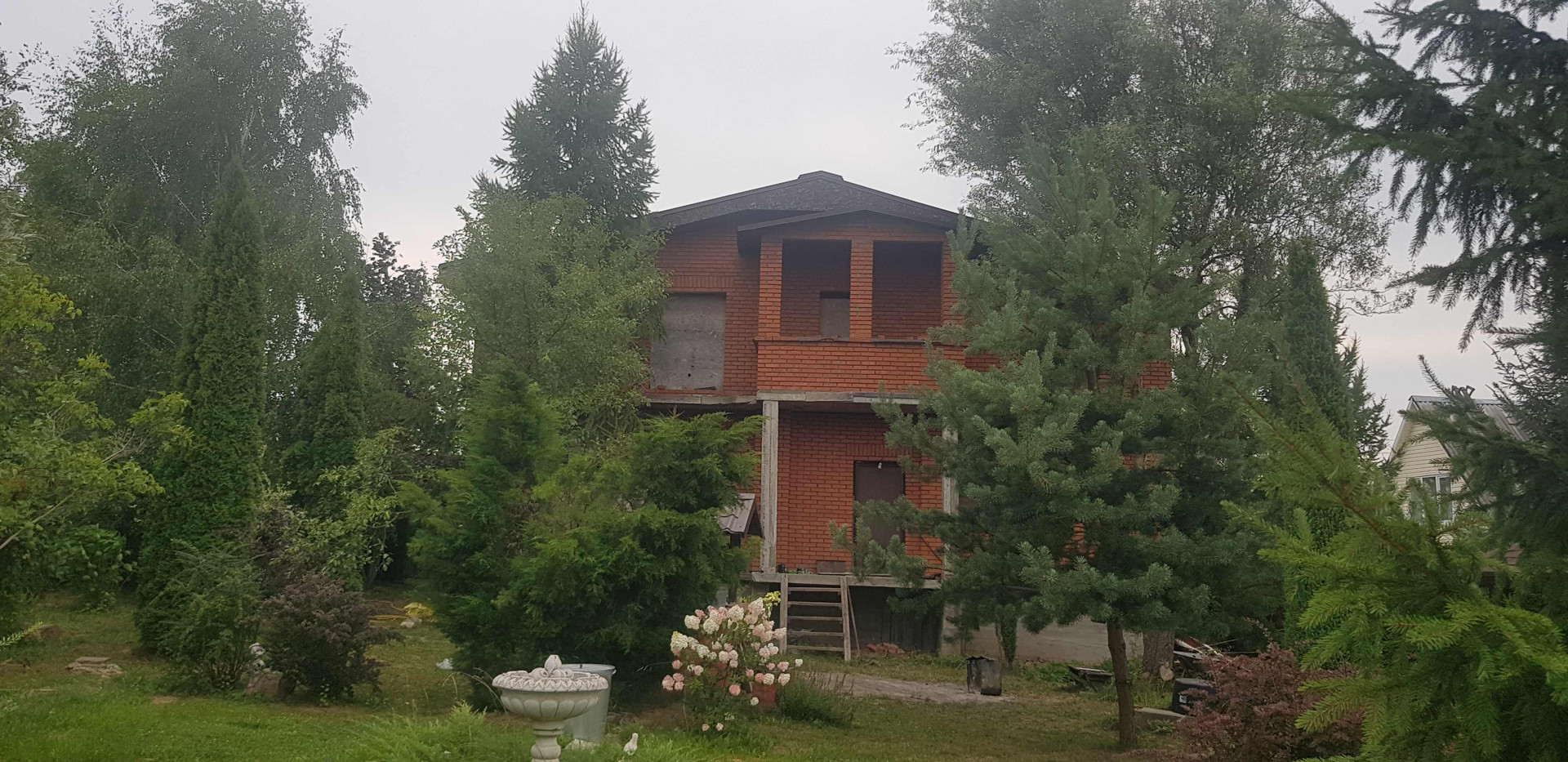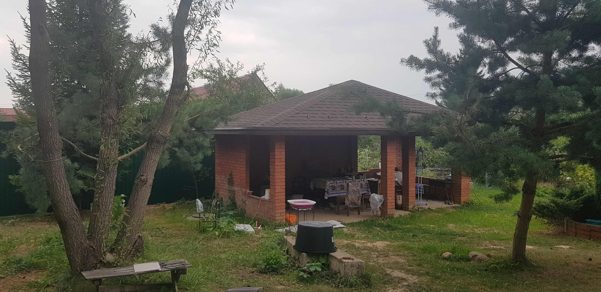 На территории есть кирпичная беседка и много разных деревьев и кустарников.