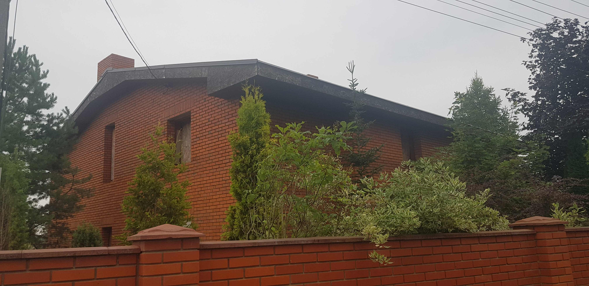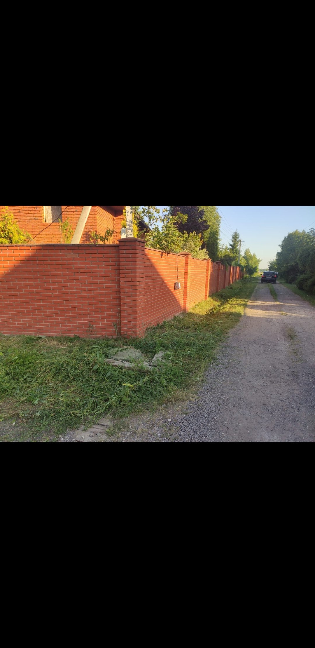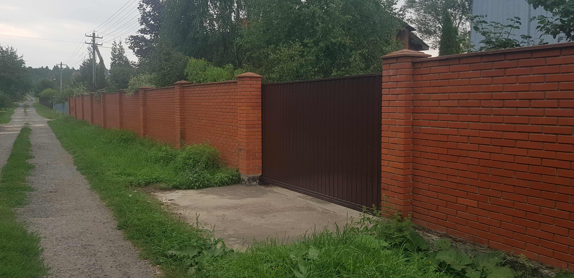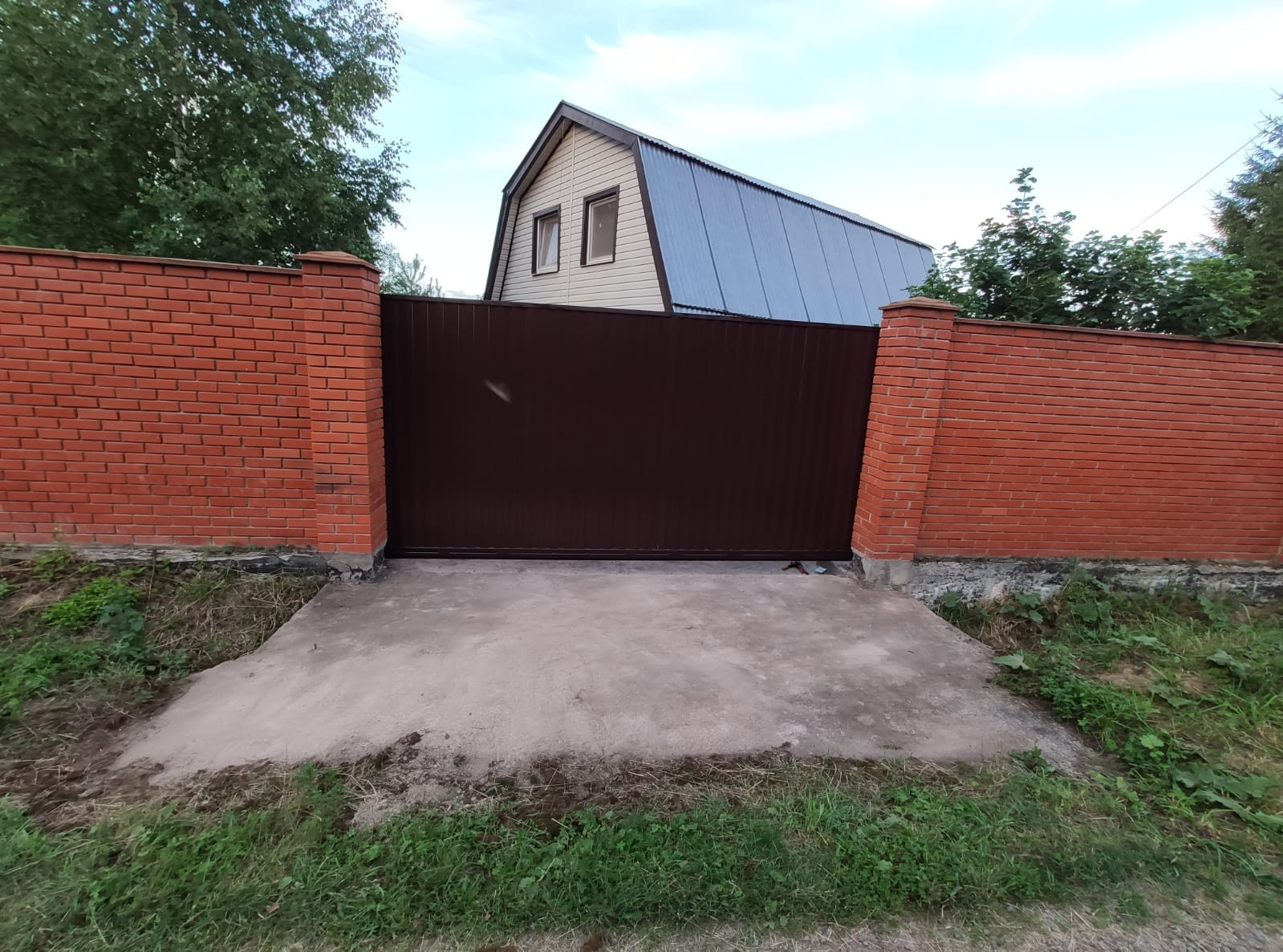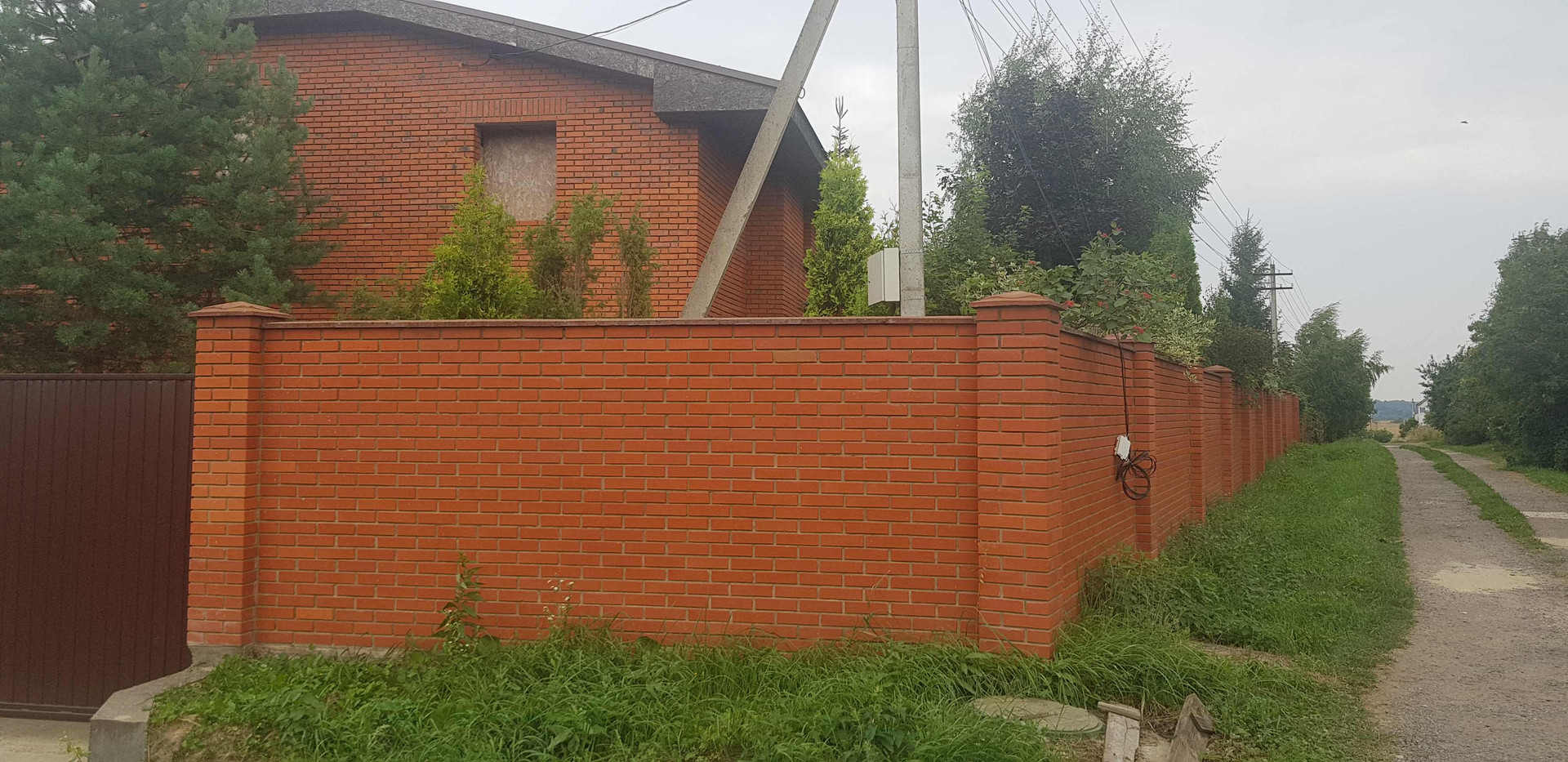 На территории есть кирпичная беседка и много разных деревьев и кустарников.