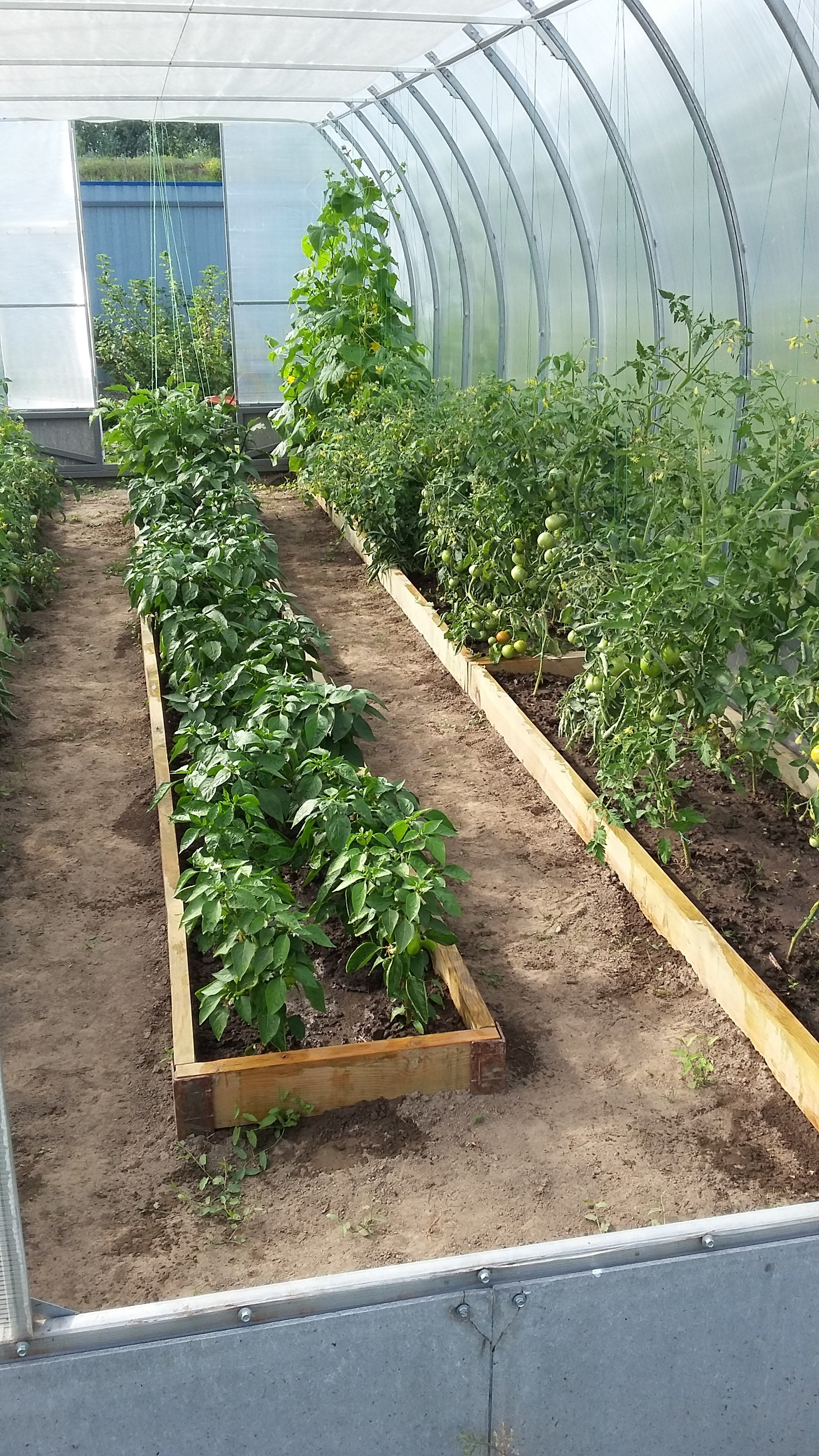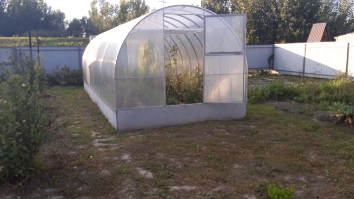 Теплица 3 на 8, усиленная, смонтирована на фундаменте. От земли поднята на пол метра. Каркас теплицы дополнительно укреплён. Внутри теплицы по потолку натянут спандекс в 2 слоя. Растения притенены от палящих лучей.
