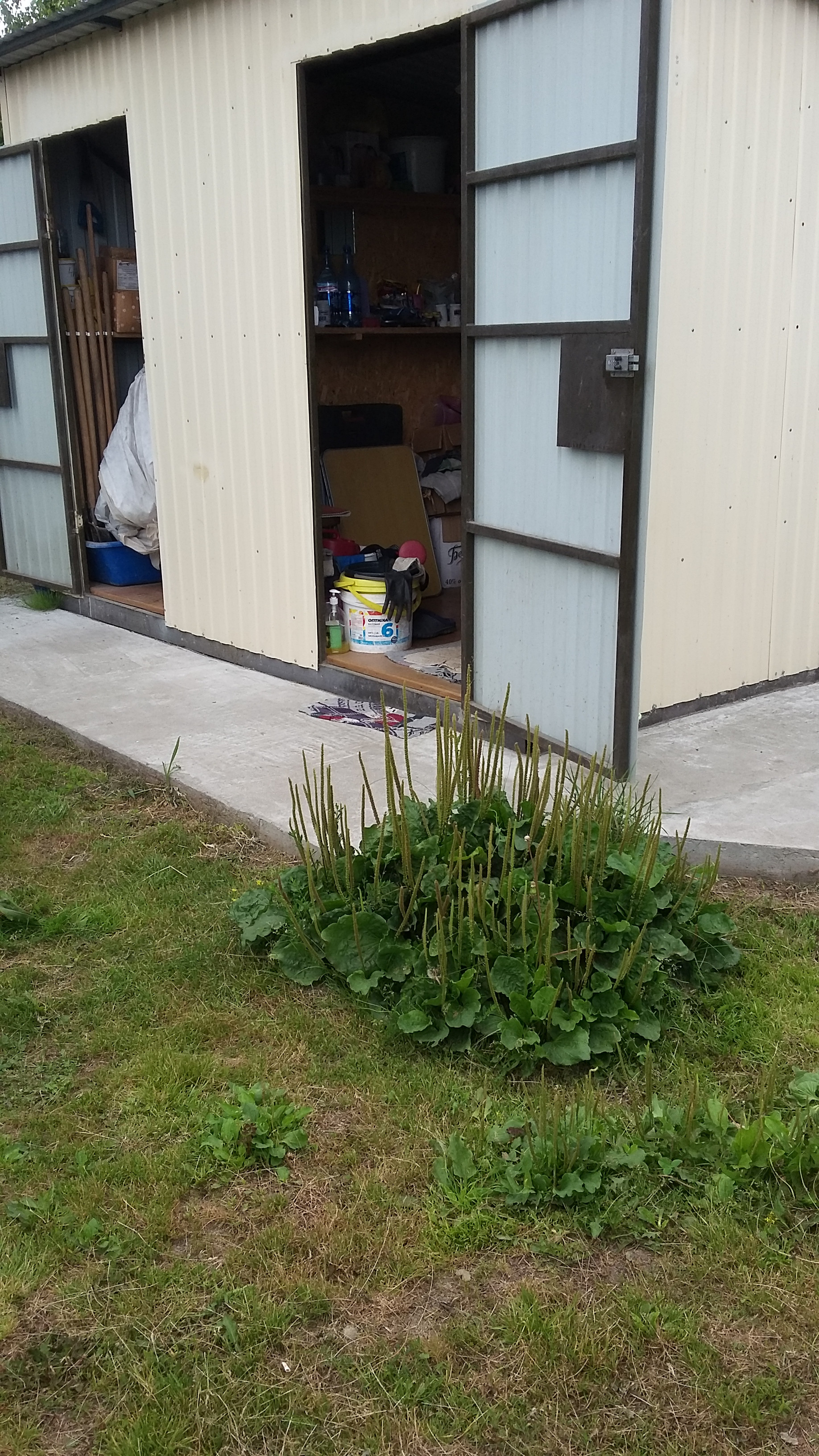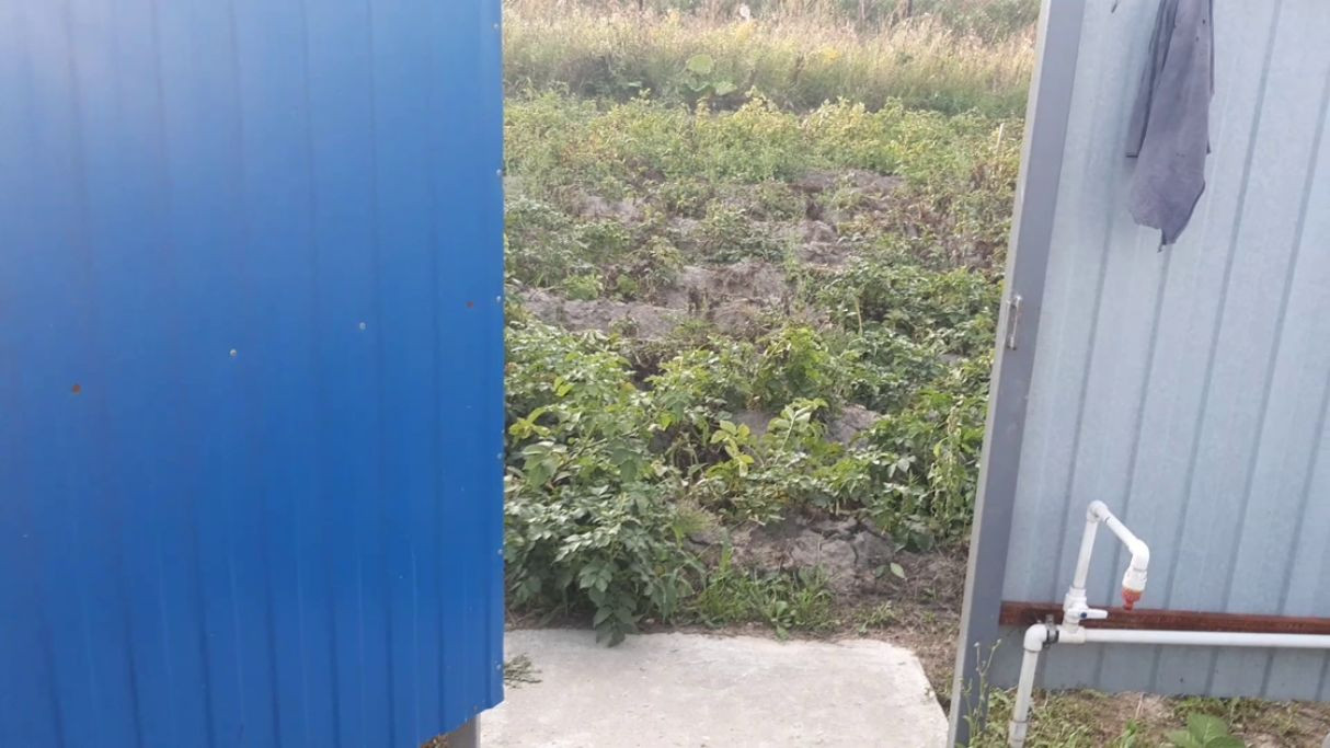 Построен единый хоз. блок на фундаменте с отмосткой. Каркас из профтрубы,обшит профлистом - сарай и туалет под одной крышей, подведено электричество. Можно попить чай, отдохнуть, спрятаться от дождя.