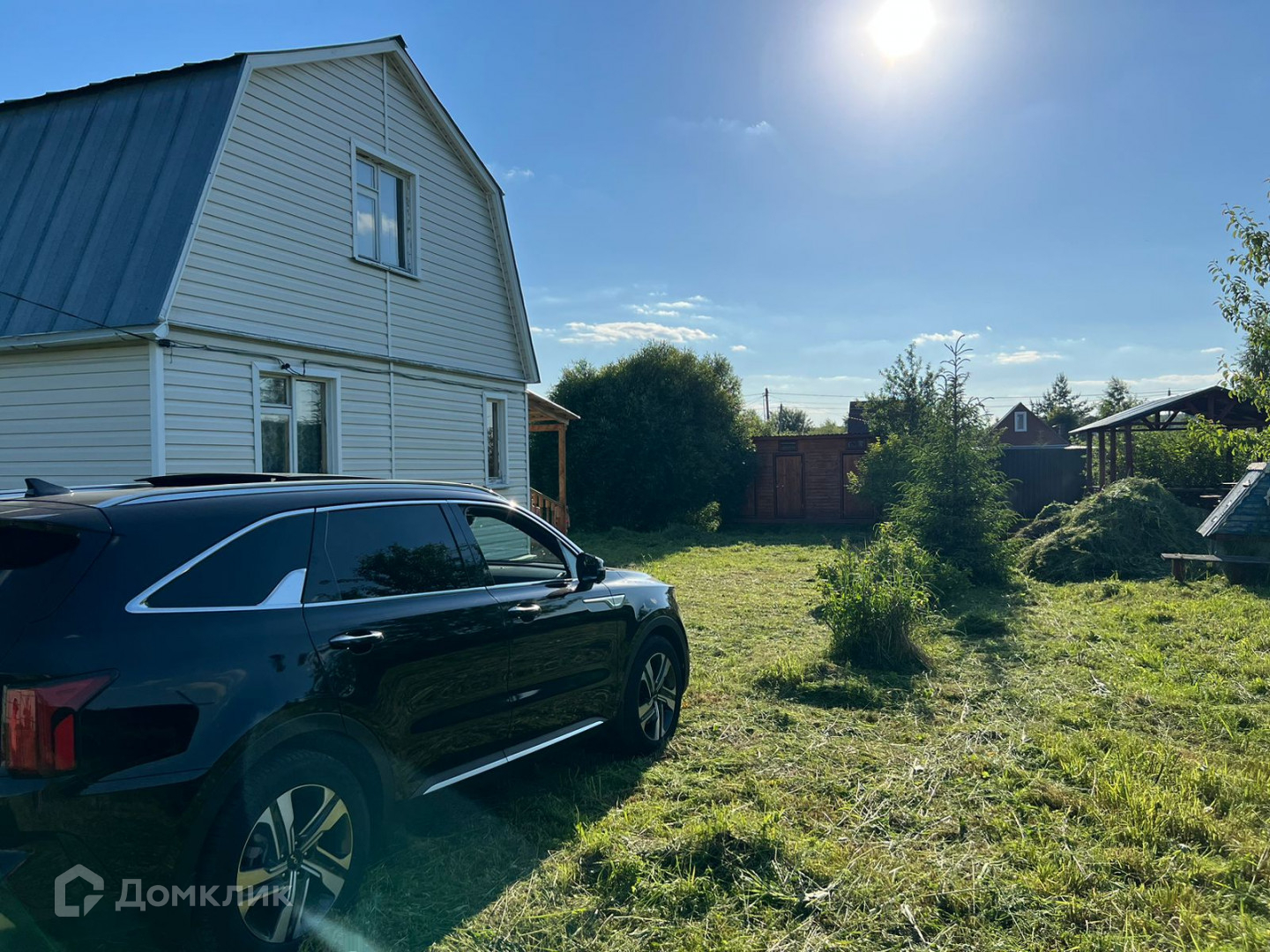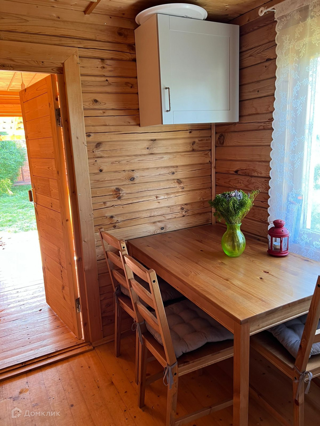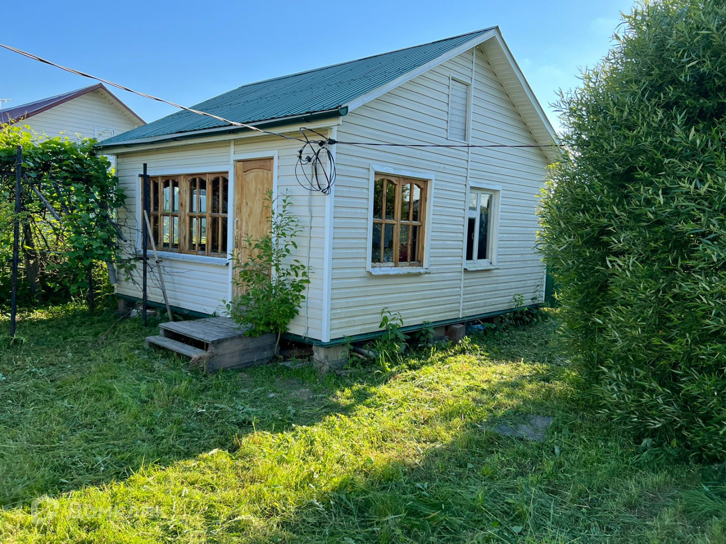 Коммуникации: электричество 7 кВт , вода из колодца, колодец оборудован насосной станцией, отопление конвекторами. Душ и туалет в хозблоке, слив в выгребную яму.