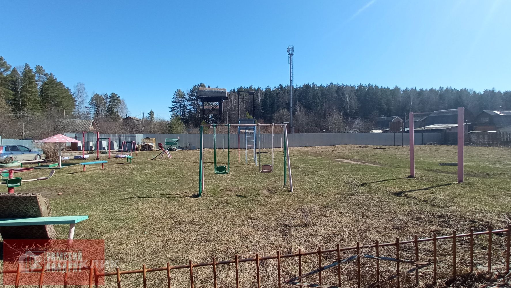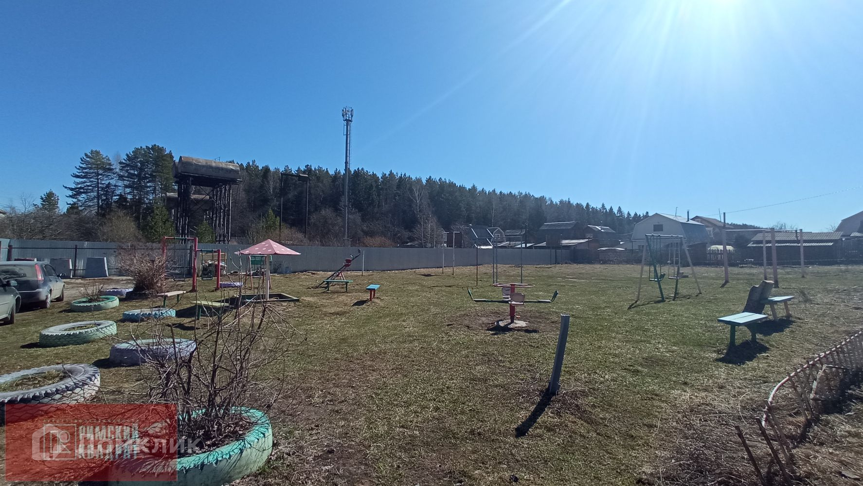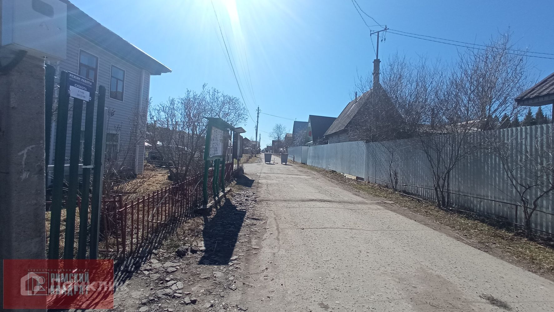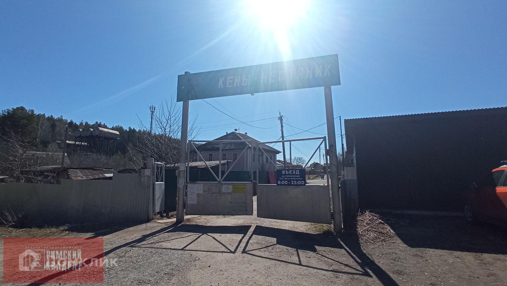 Центральная дорога асфальт, большая детская площадка при въезде на массив, ворота, шлагбаум, магазин у ворот.