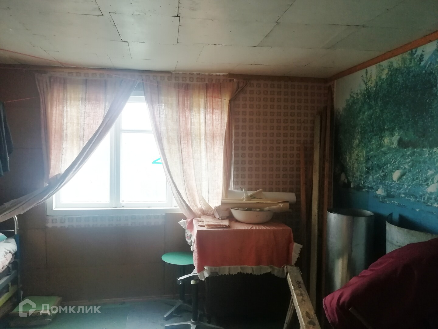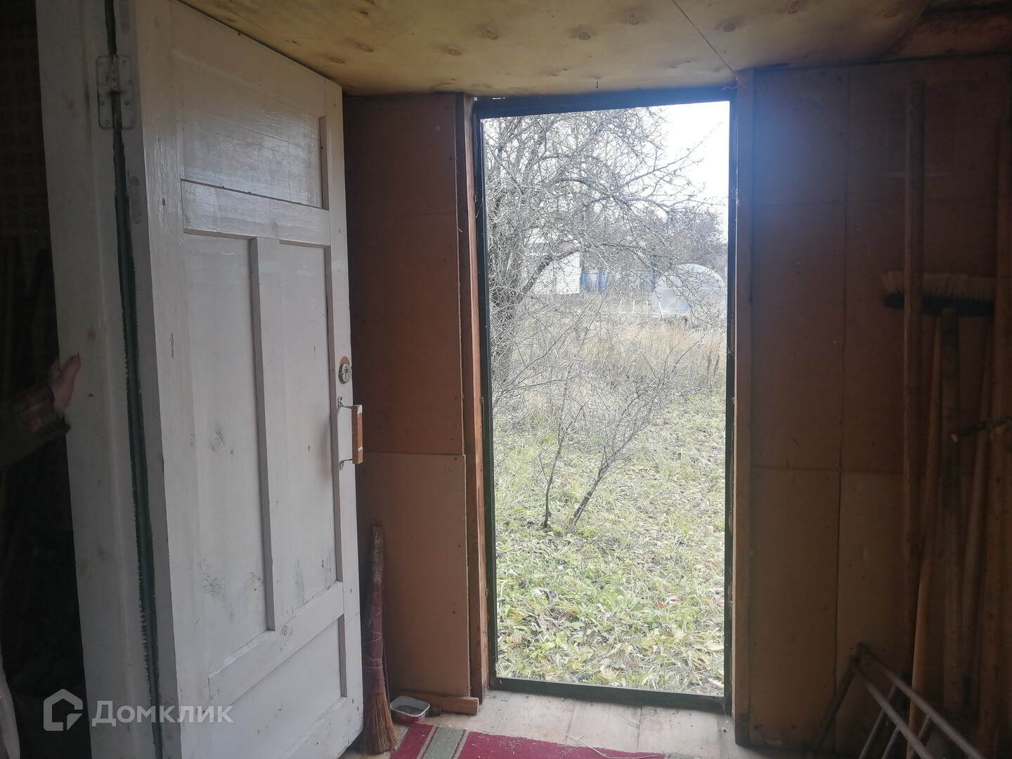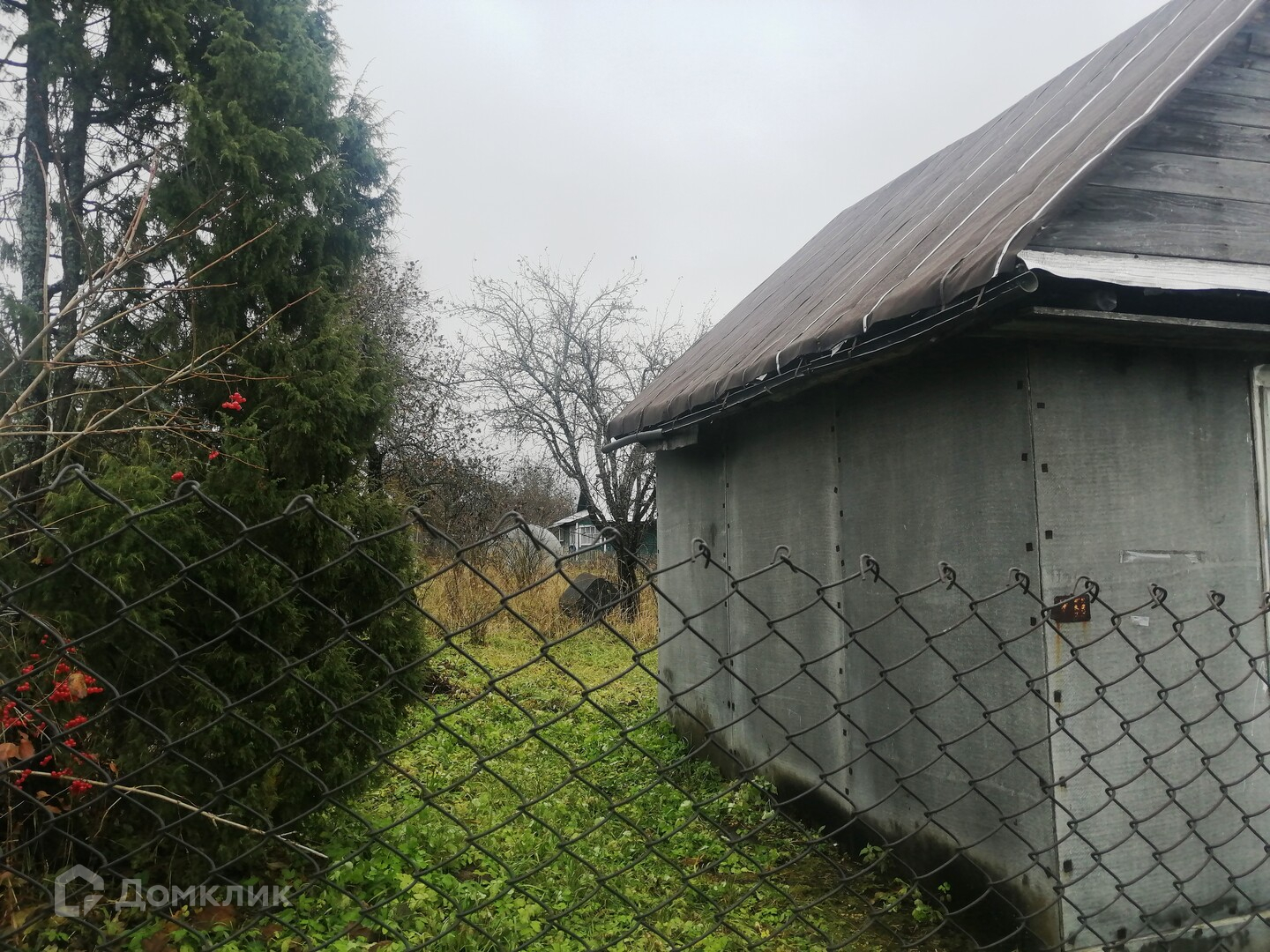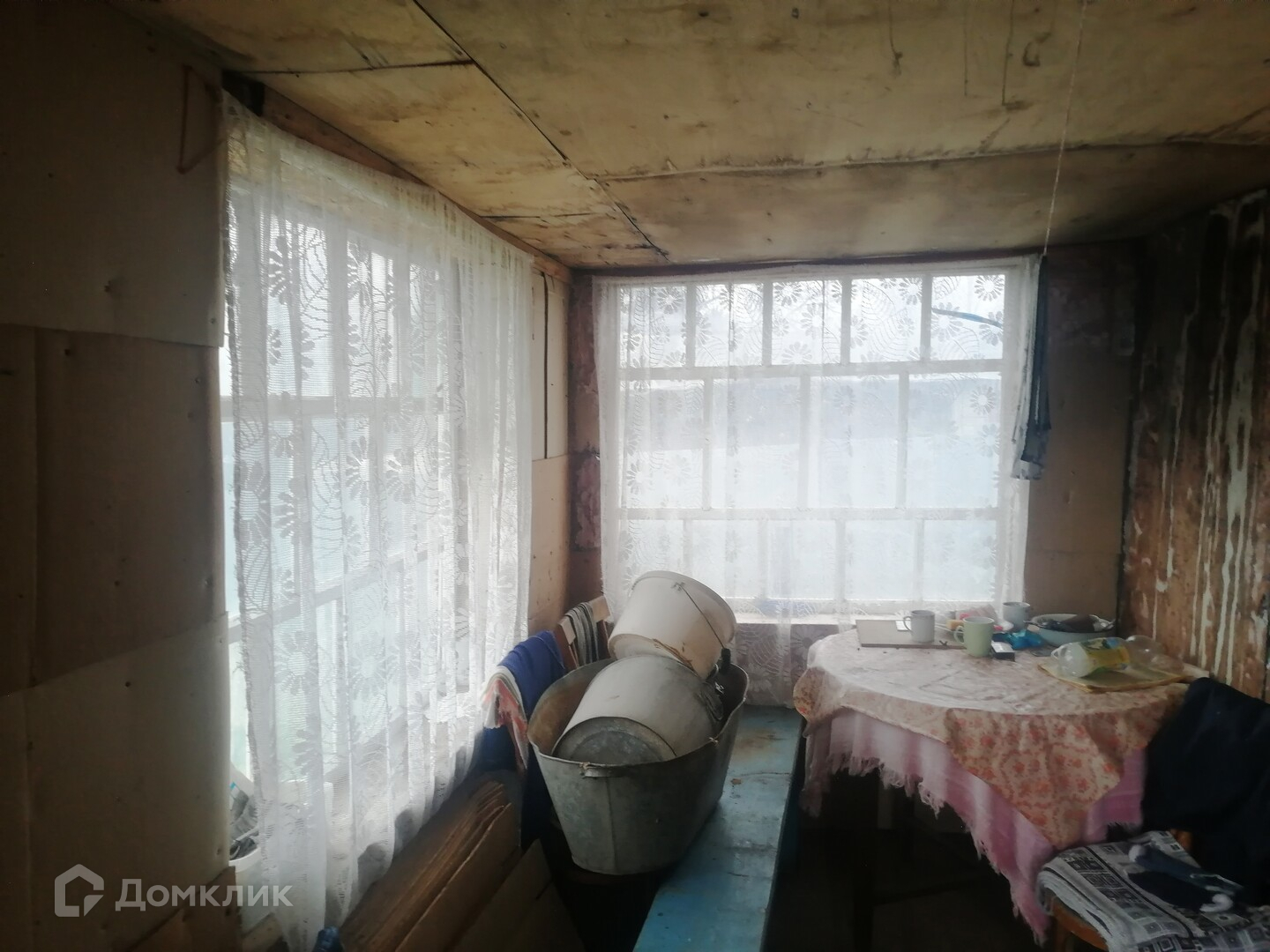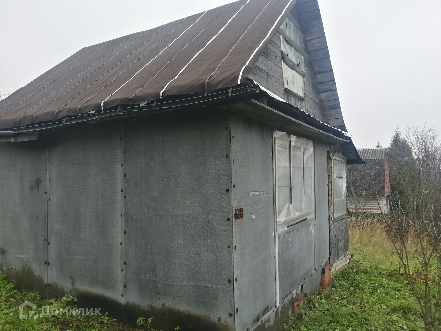 Окна в доме все целые, просто на зиму обтянуты пленкой. Сам домик обшит листовым железом.
