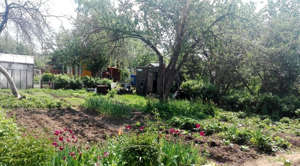 На участке клубника, земляника, яблони, малина, крыжовник, смородина. Участок огорожен.