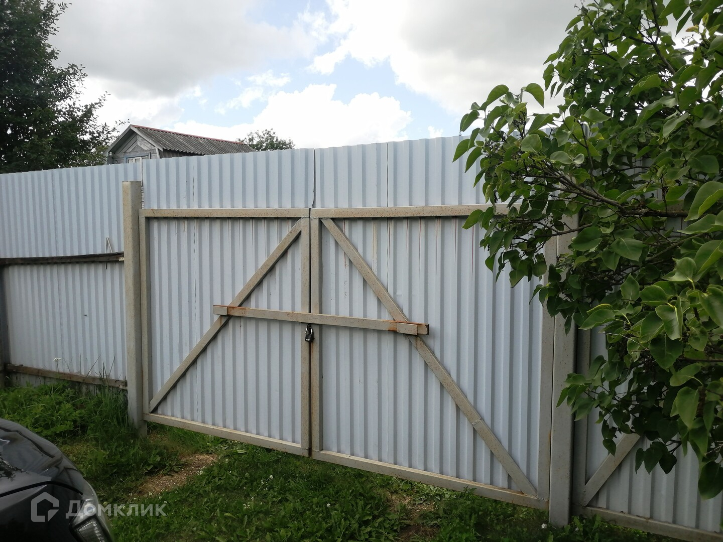 Участок ухоженный, засеян газонной травой, огорожен металлическим забором с распашными воротами.