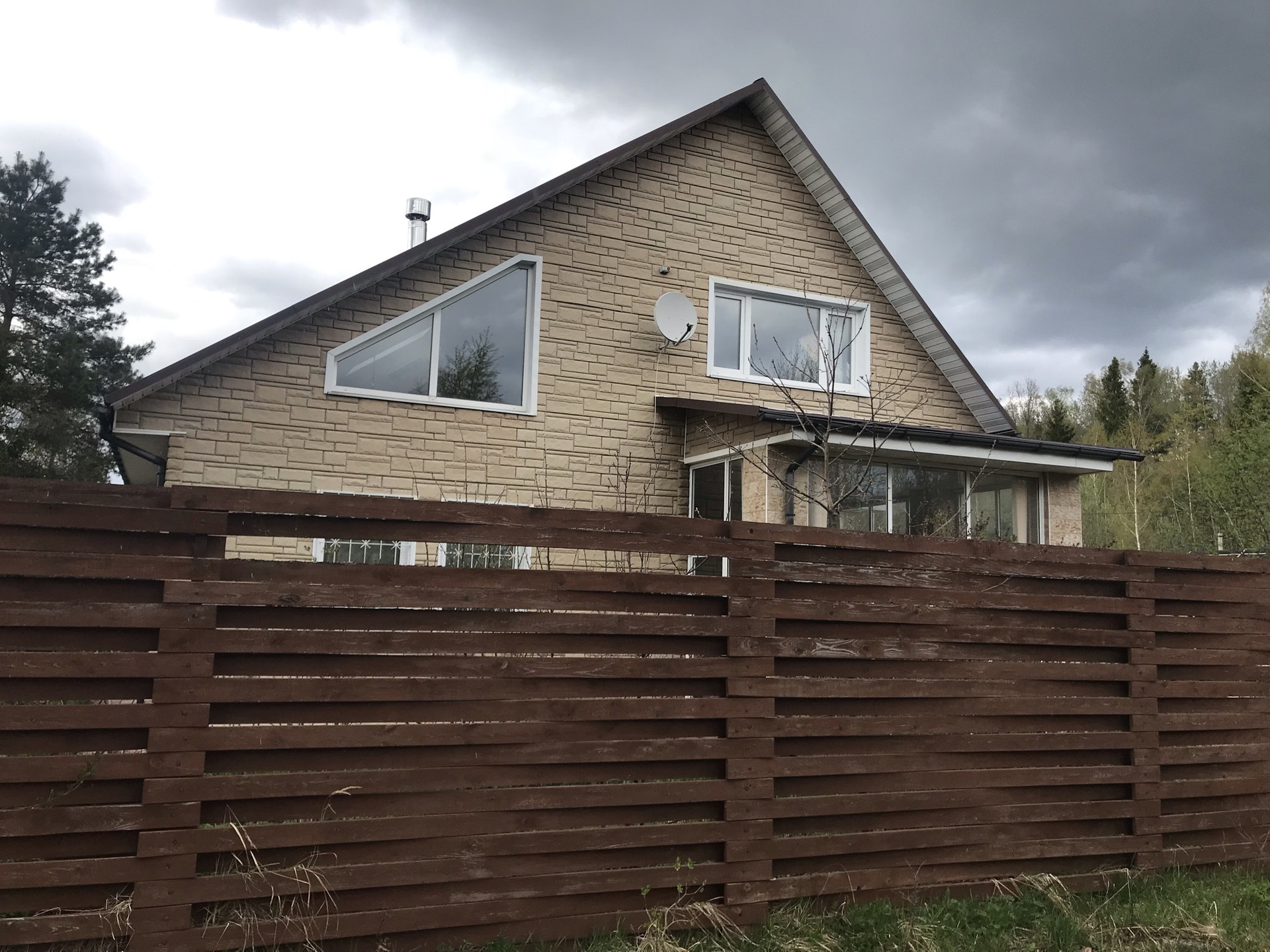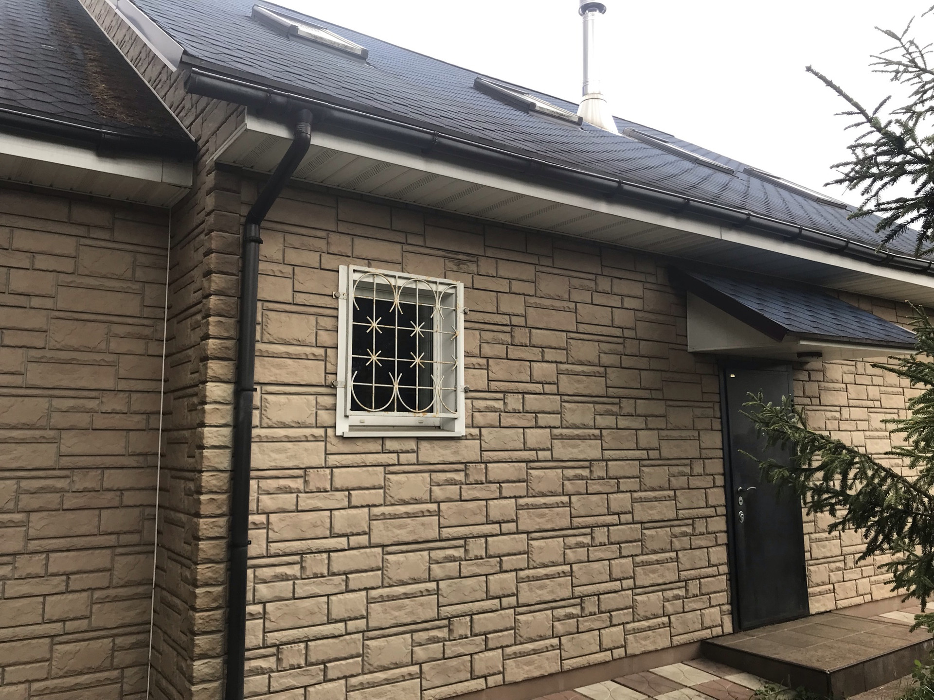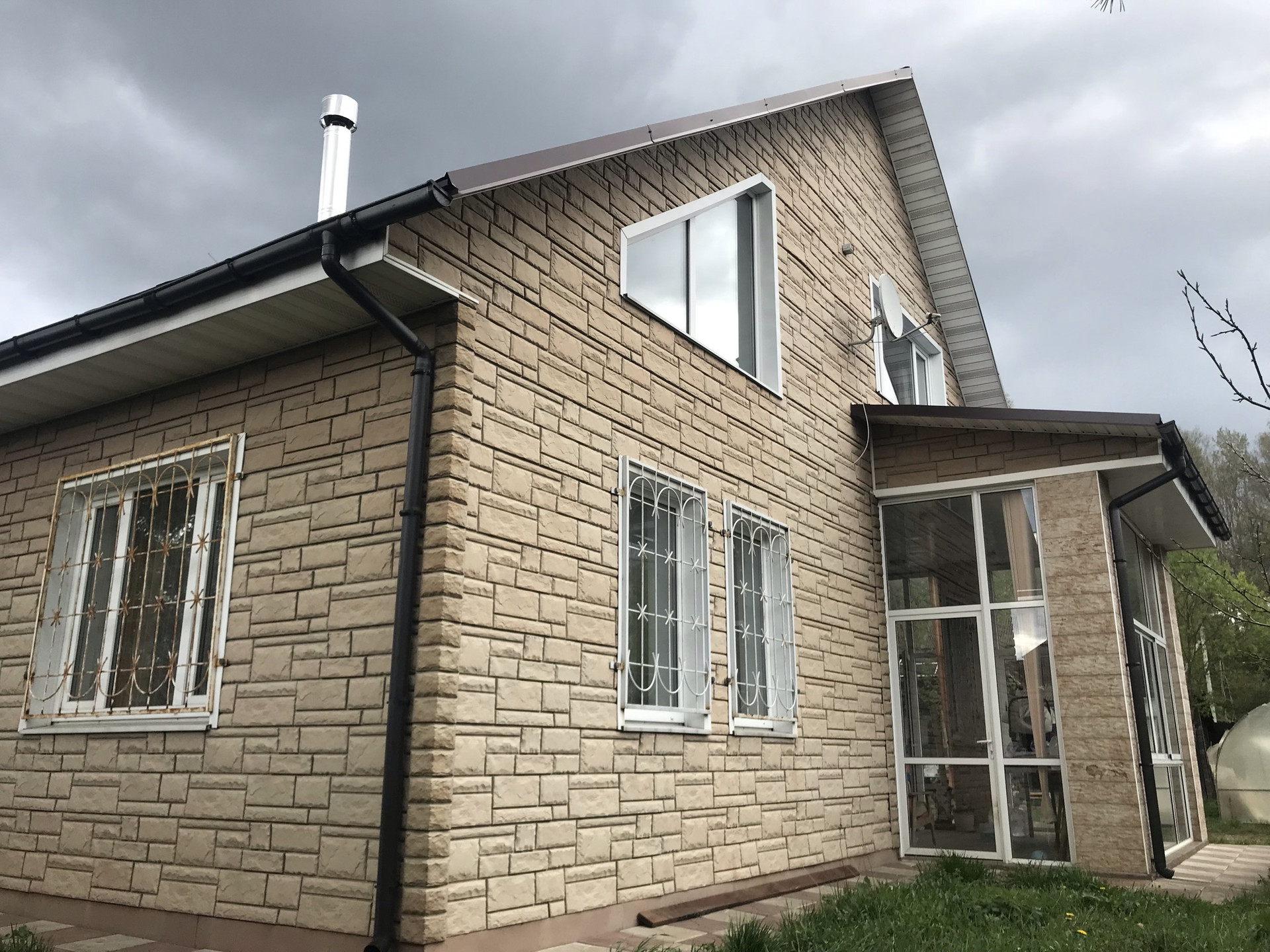 Сам дом построен из пеноблока, утеплен, фасад обшит декоративной отделкой под камень