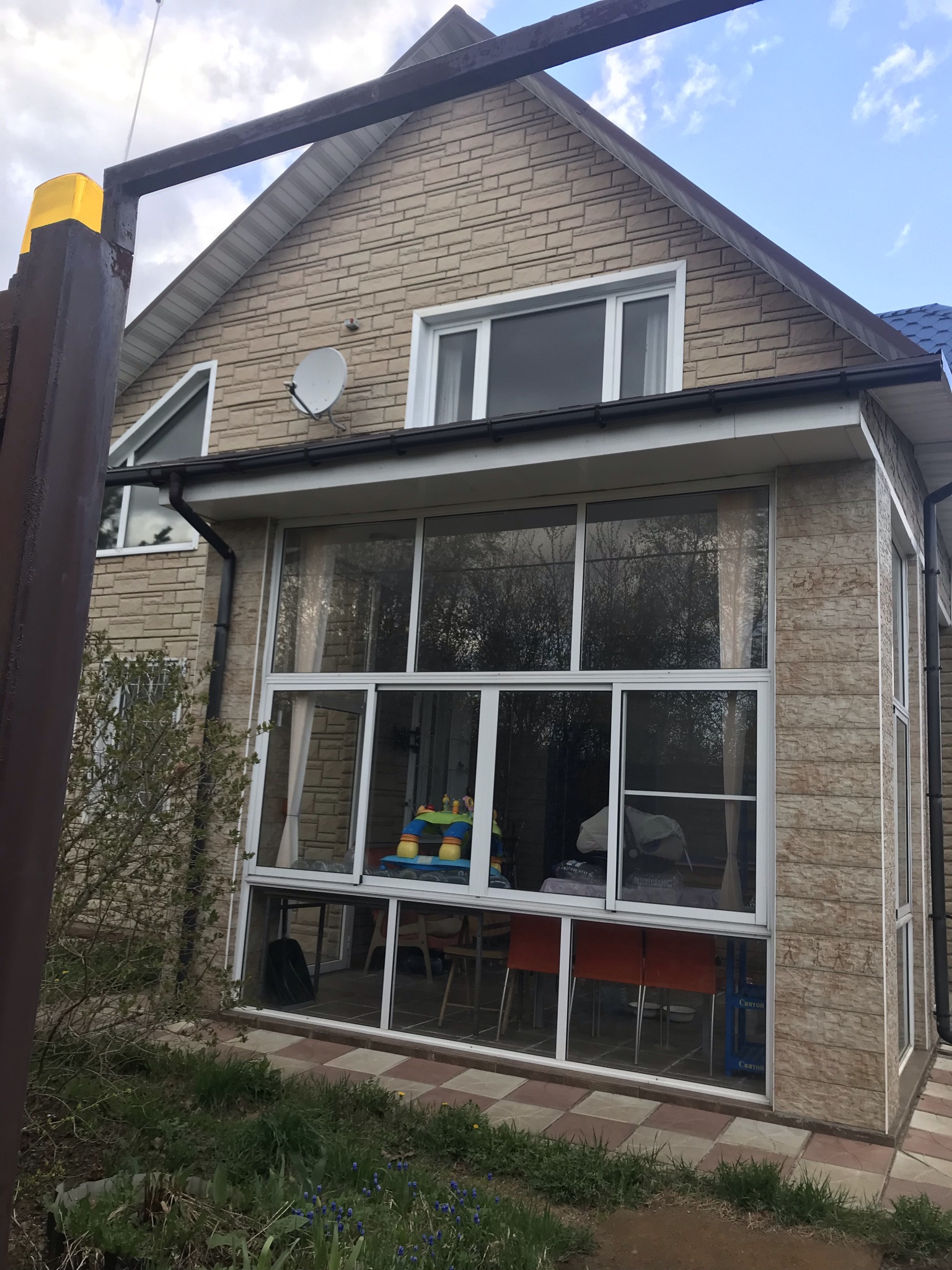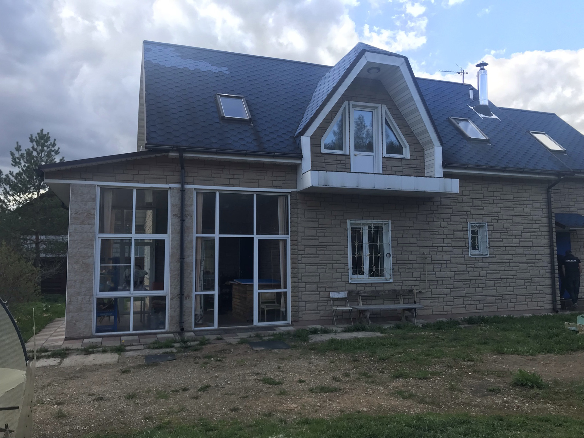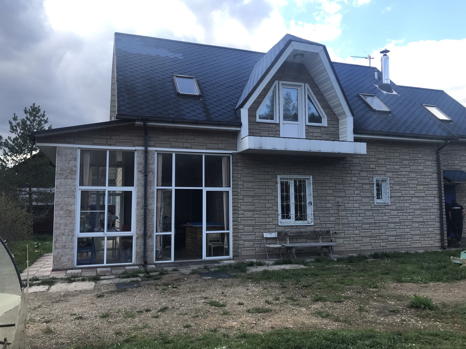 Сам дом построен из пеноблока, утеплен, фасад обшит декоративной отделкой под камень
